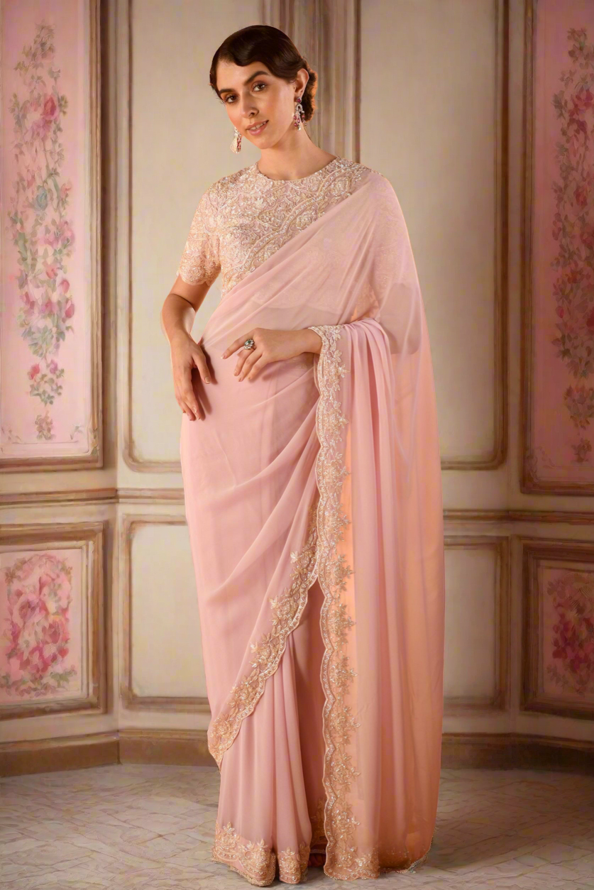 Pink Hand Embroidered Georgette Saree With intricate thread work beads and pearls and a heavy blouse
