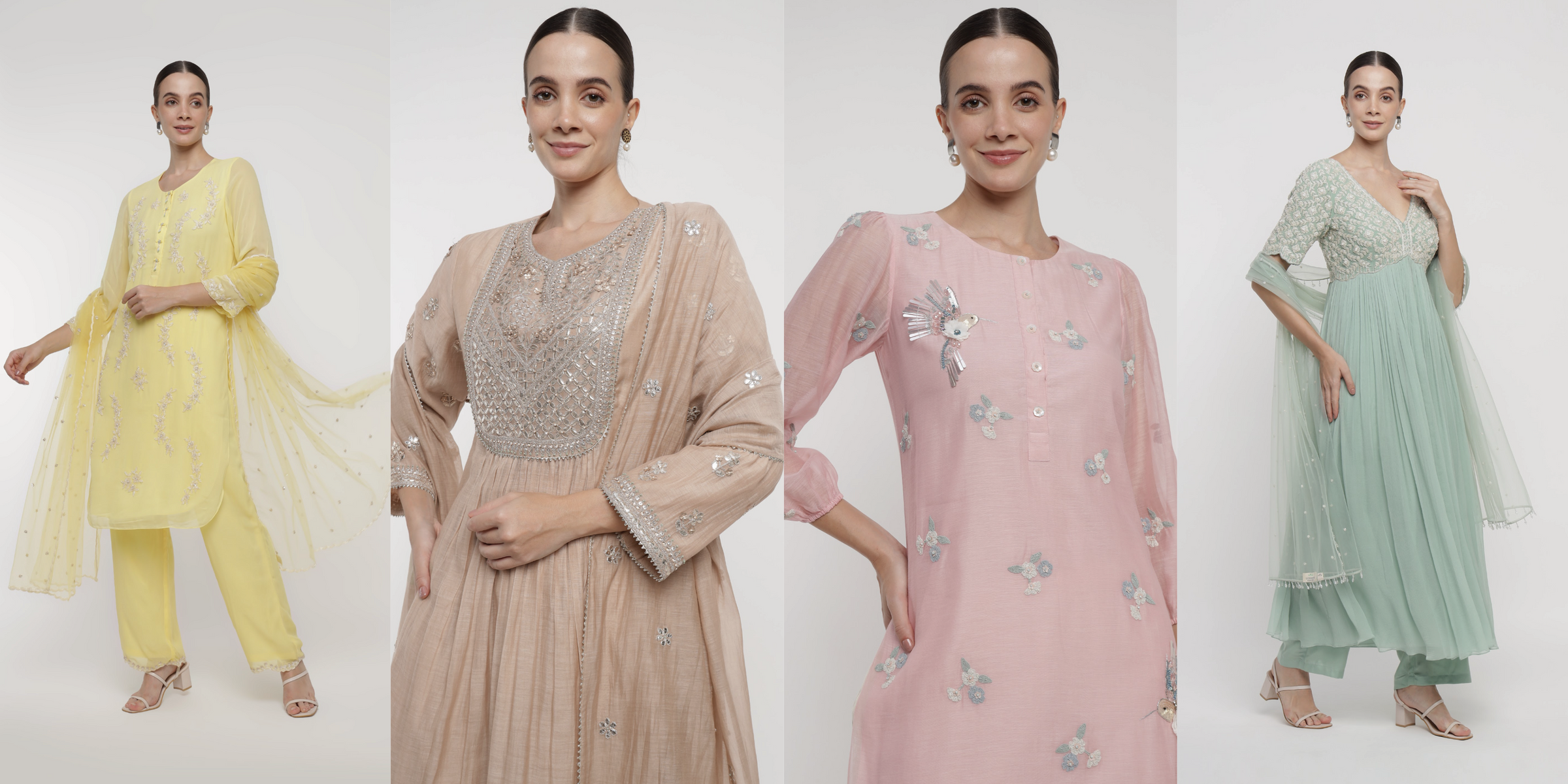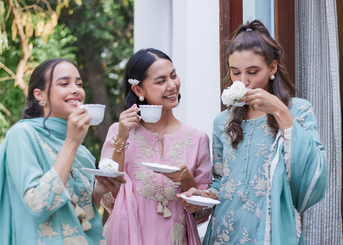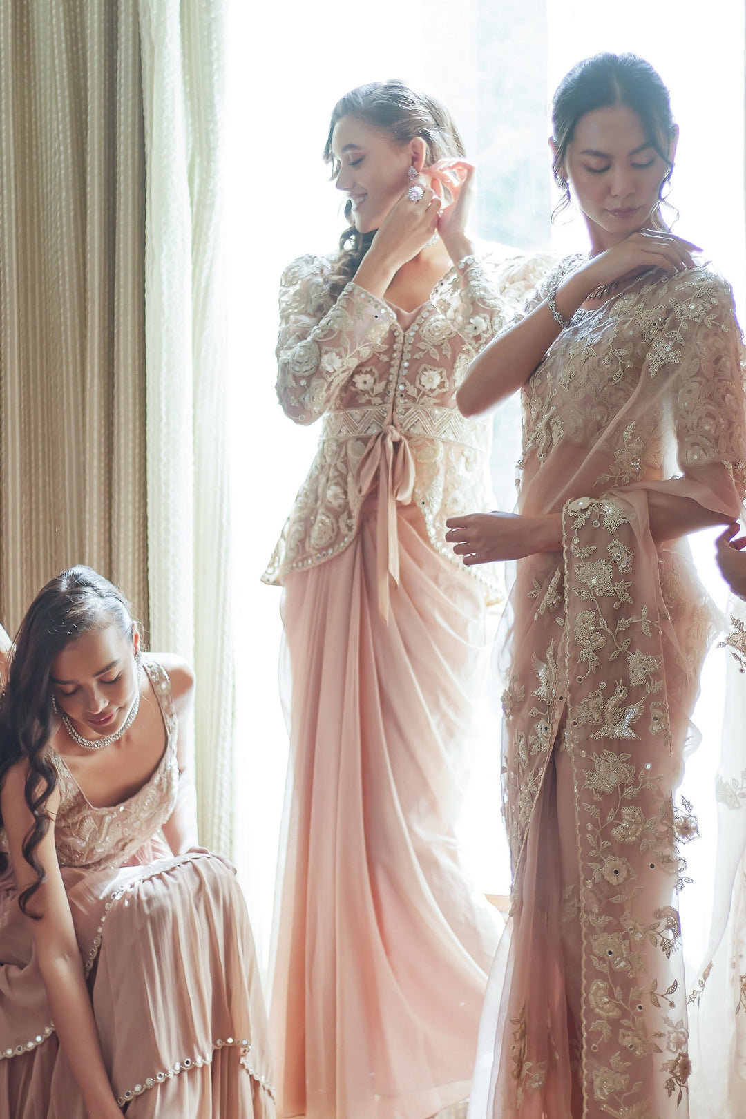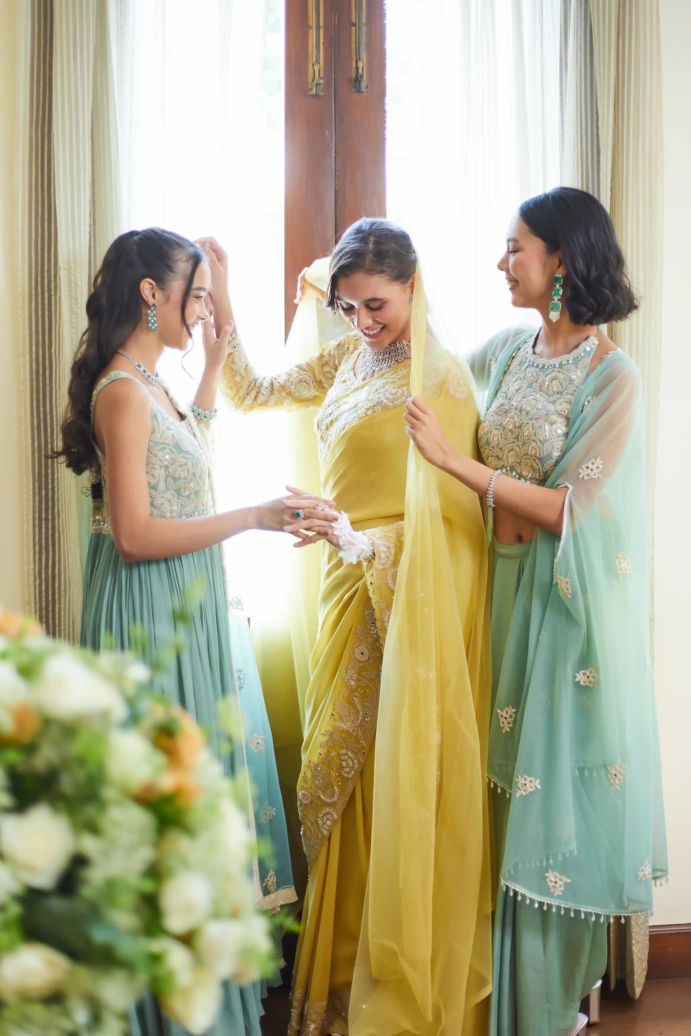 Three women in sarees posing against different colored backgrounds Three women in traditional outfits celebrating with bowls of snacks in a decorated room.