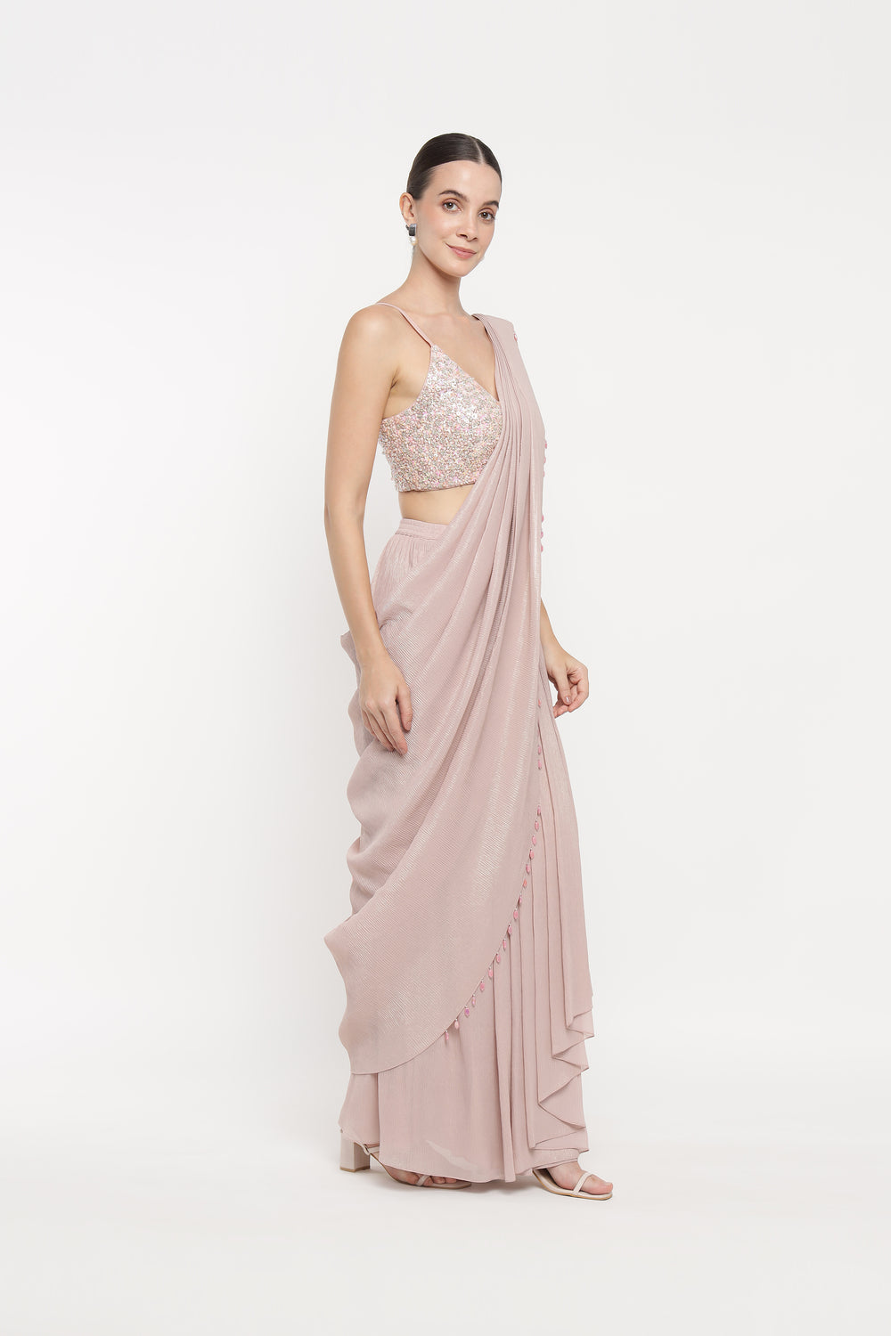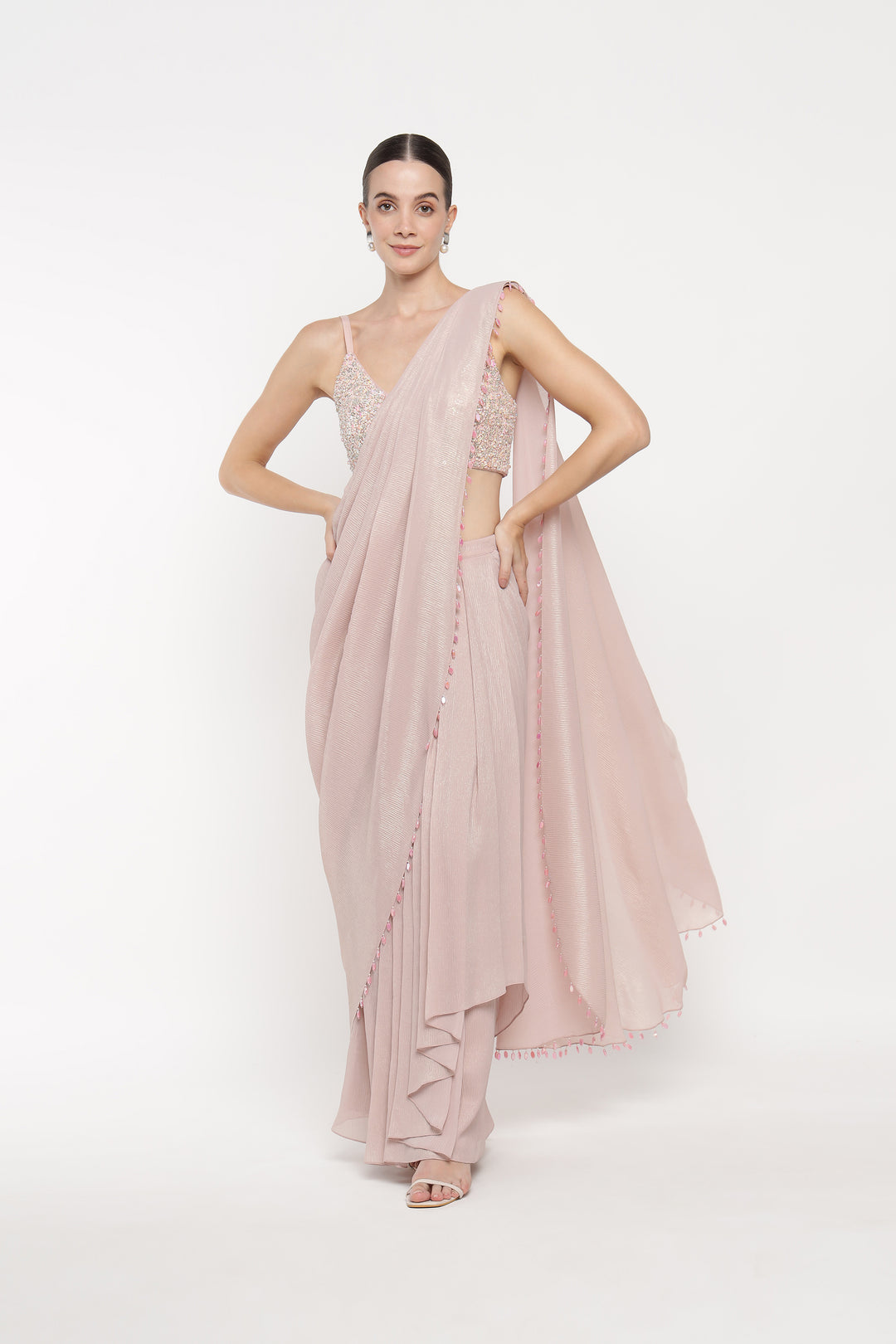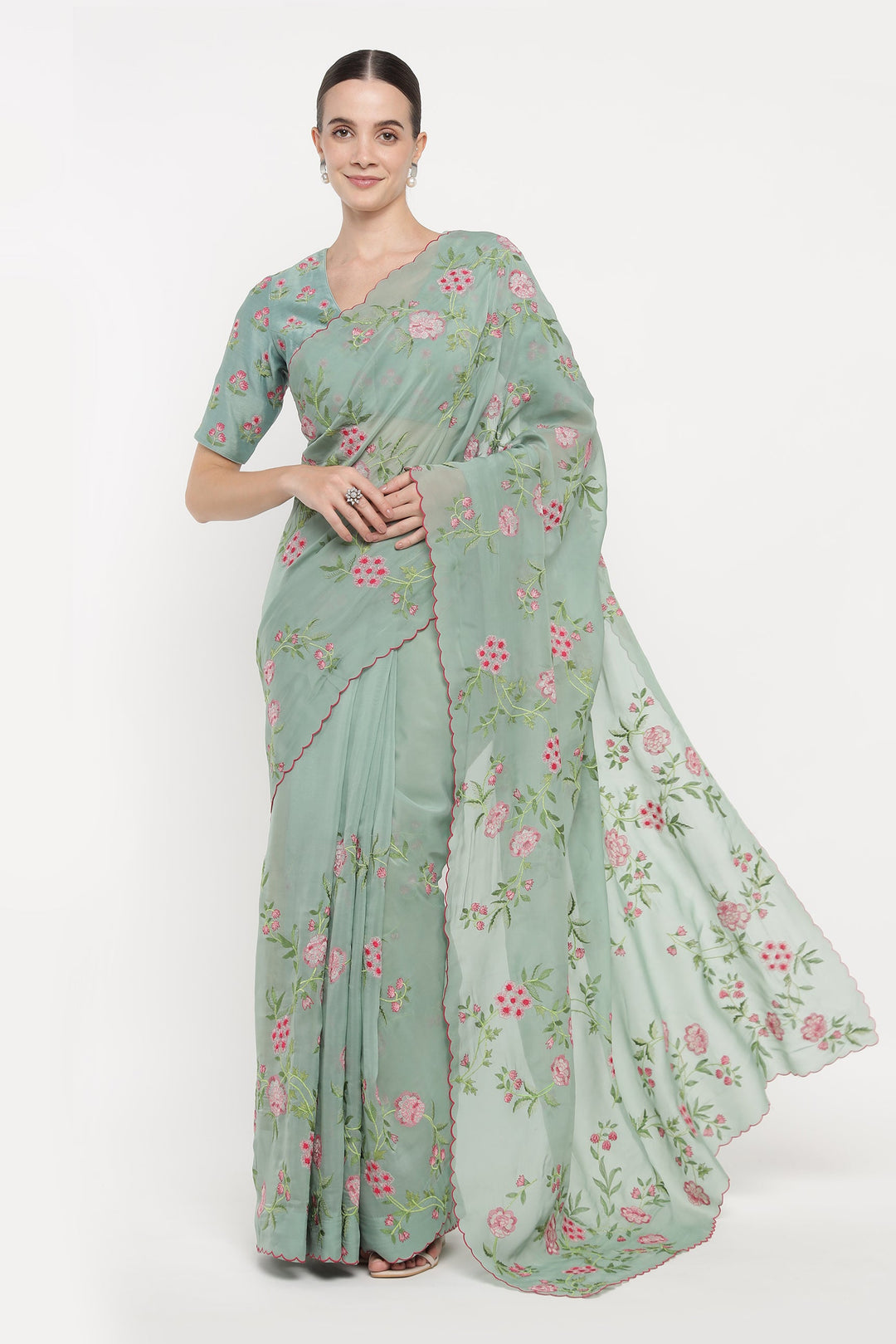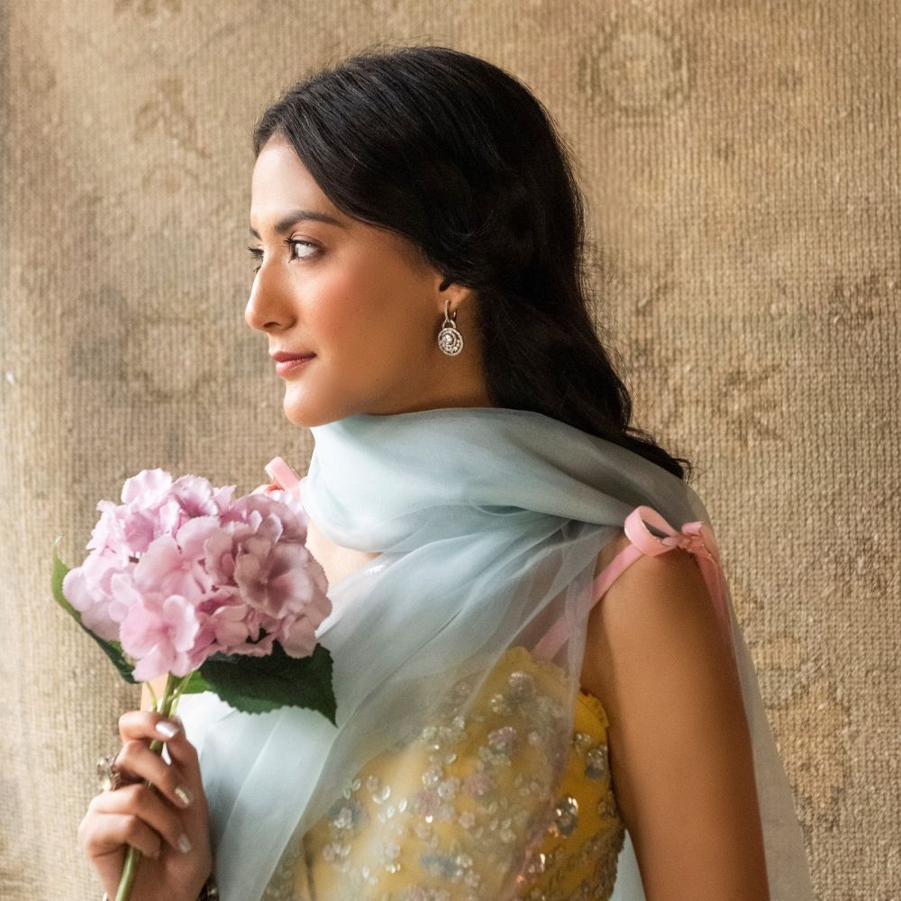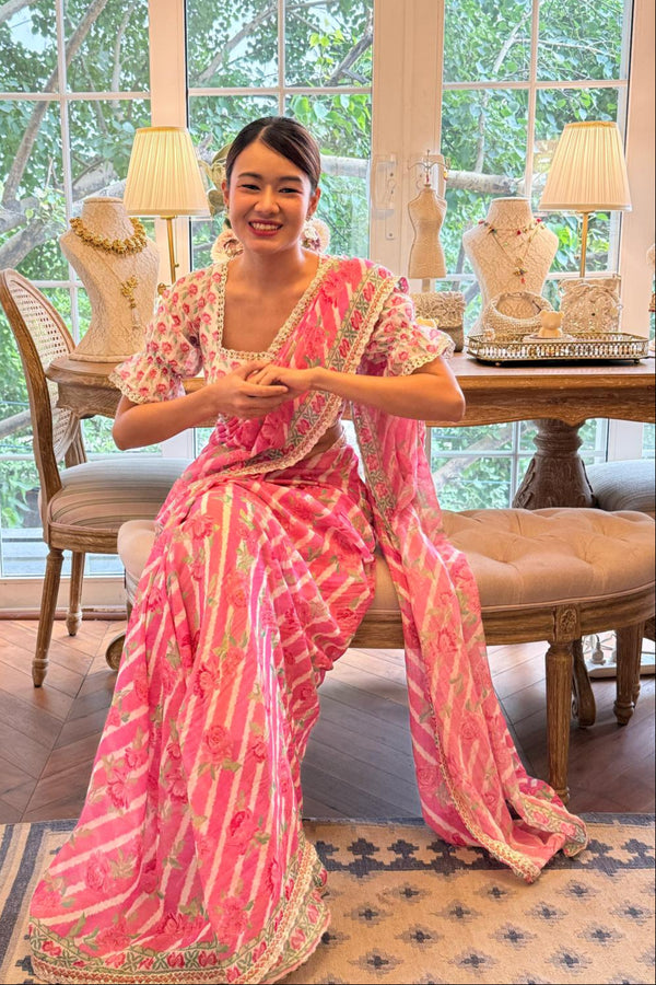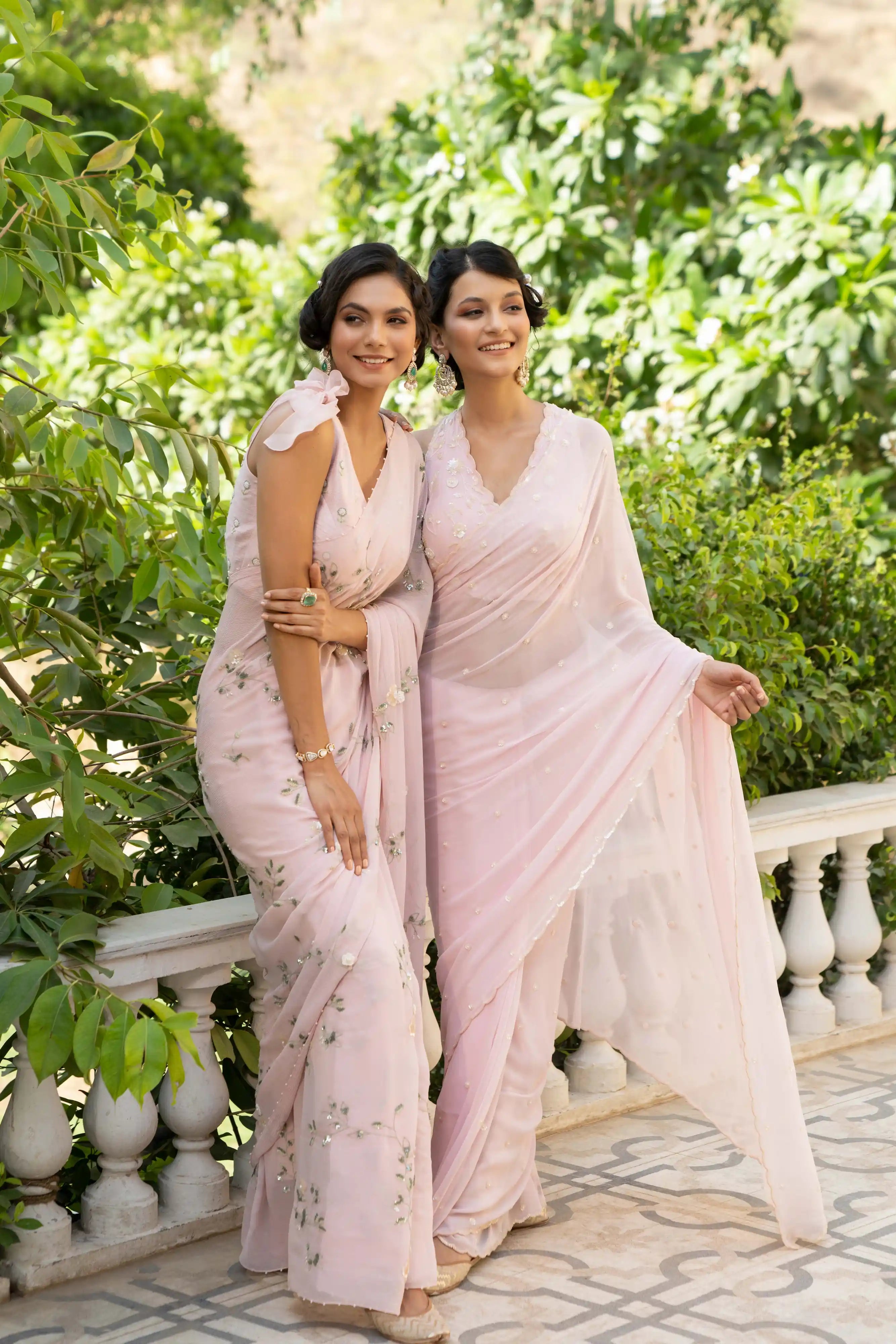 Three women in sarees posing against different colored backgrounds Three women in traditional outfits celebrating with bowls of snacks in a decorated room.