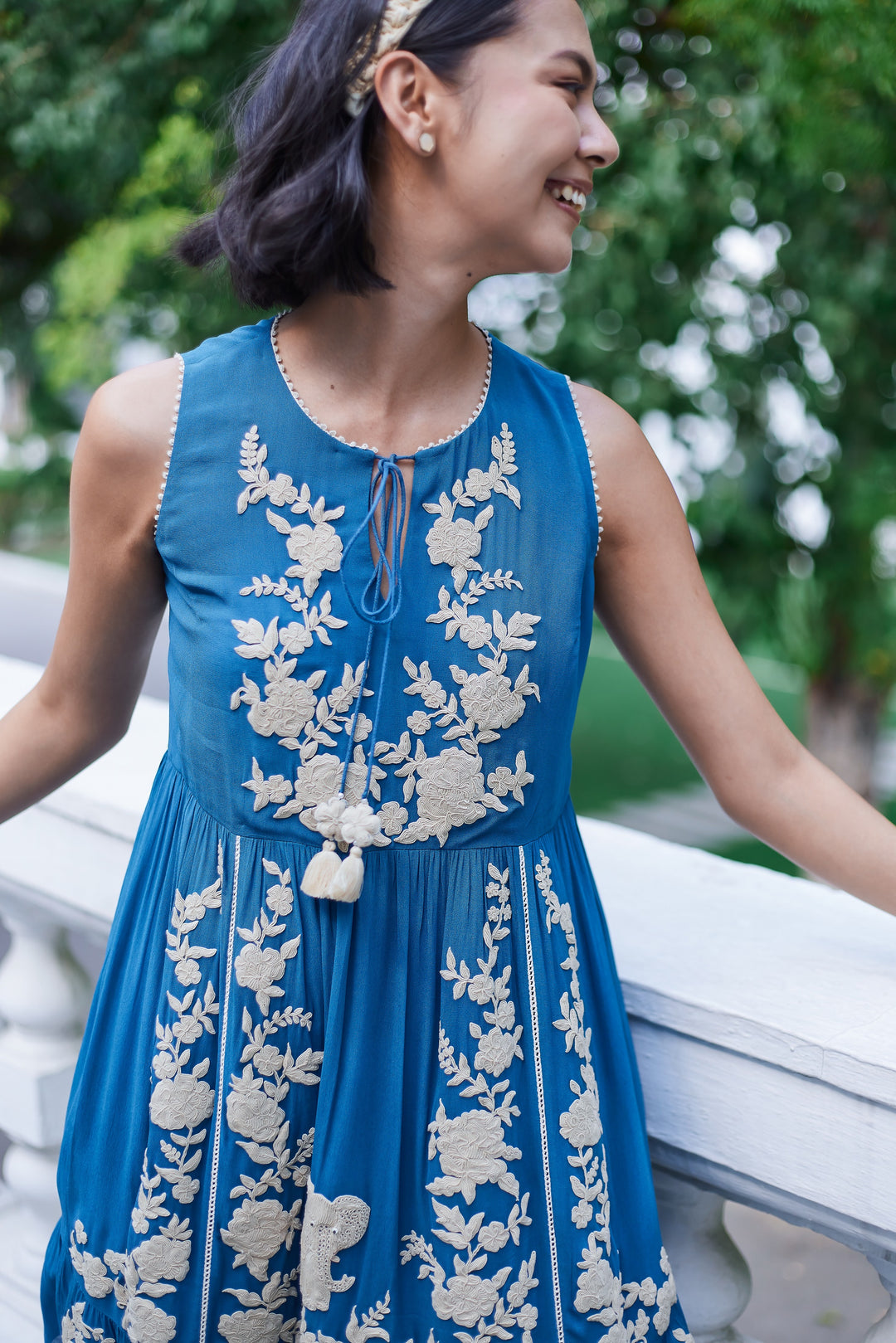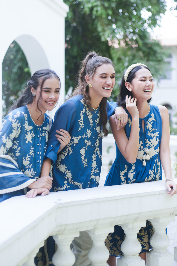 Elevate your style with the Ambar Blue Elephant Dress, featuring intricate dori work and charming motifs. This dress beautifully combines traditional craftsmanship with modern elegance, making it perfect for special occasions or festive events.