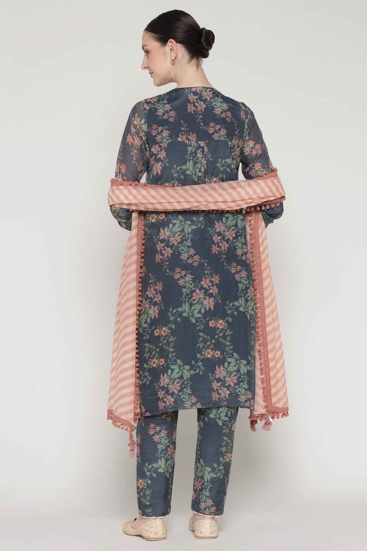 Woman wearing a floral kurta with a matching dupatta on a white background