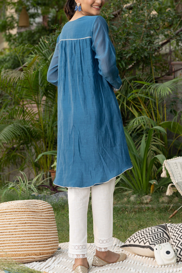 A stunning blend of tradition and modernity with intricate Dori work detailing. Effortlessly chic, this ensemble combines cultural allure and contemporary style in perfect harmony. Crafted from luxurious silk mul fabric, pastel ethnic wear the Blue Ambar Dori Tunic is ideal for making a captivating statement while feeling at ease.