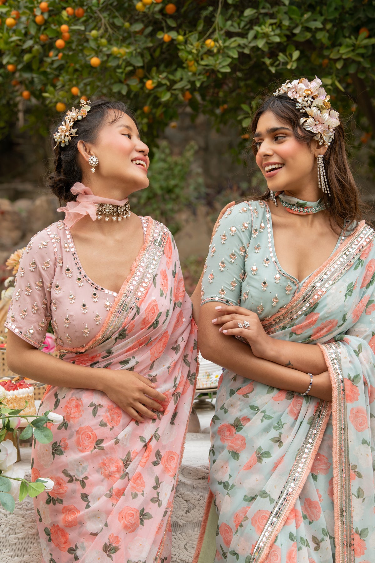Elevate your style with our Pink Citrus Rose Mirror Border Saree. Shop now and embrace the elegance of mirror embroidery and delicate rose prints. Make a statement wherever you go.