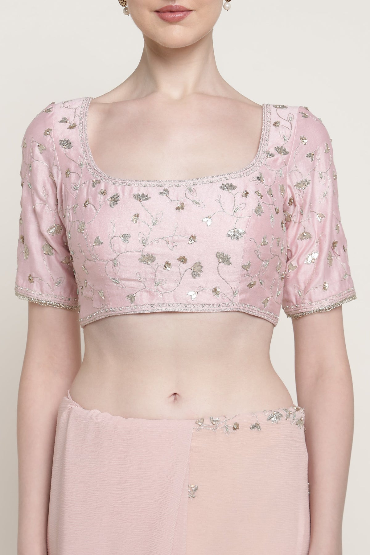 Delara Saree Set featuring a soft blush saree with delicate floral embellishments, paired with a beautifully embroidered blouse. Subtle shimmer details and refined craftsmanship make it perfect for intimate festivities, weddings, or graceful evening occasions.