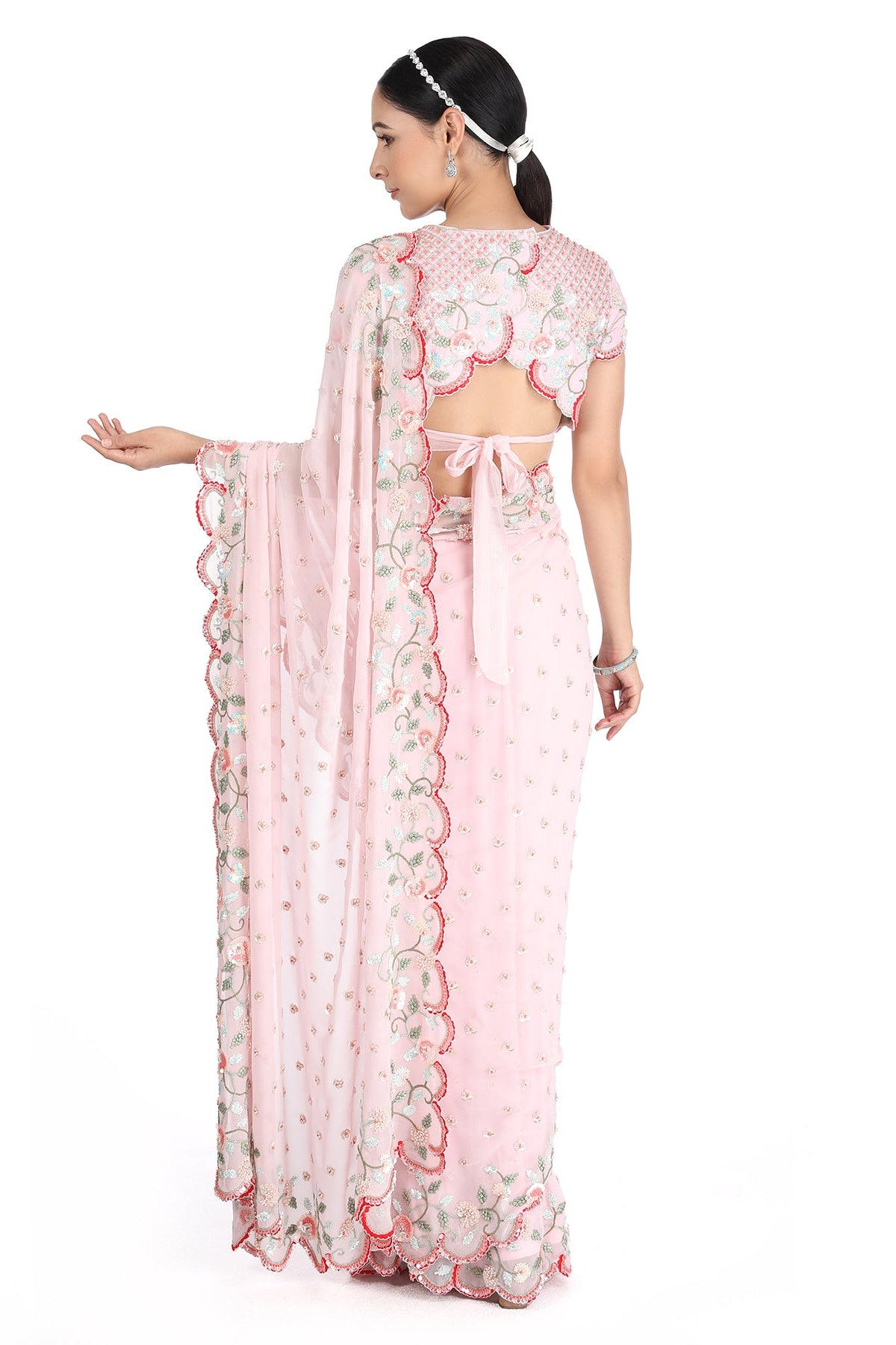 Introducing our Pink Ribbon Scallop Saree crafted from luxurious Bemberg Georgette, a fabric renowned for its softness and sheen. This saree is a testament to elegance, with delicate hand embroidery adorning its entirety. Adorned with exquisite pearls, shimmering sequins, intricate beads, and dainty ribbons, this saree captures the essence of timeless beauty and grace.