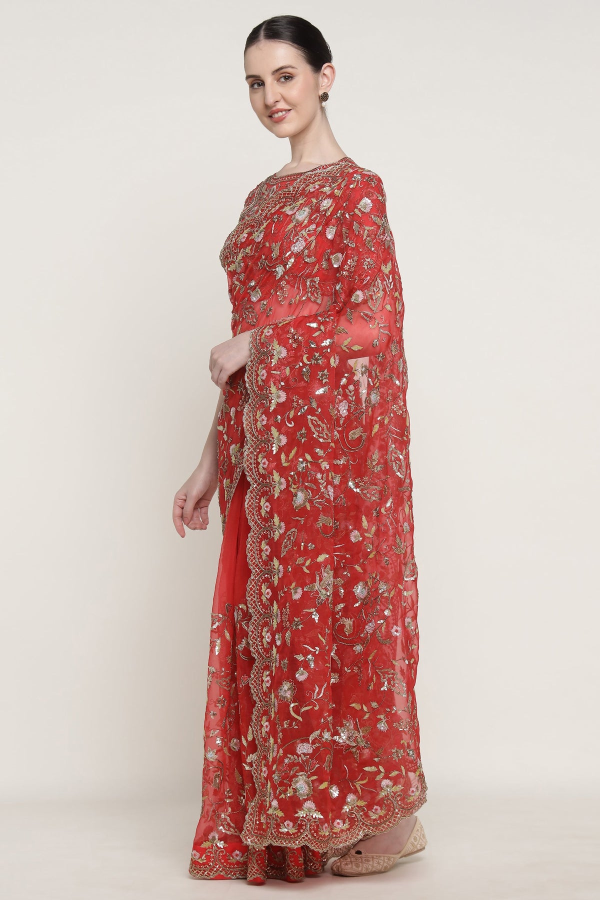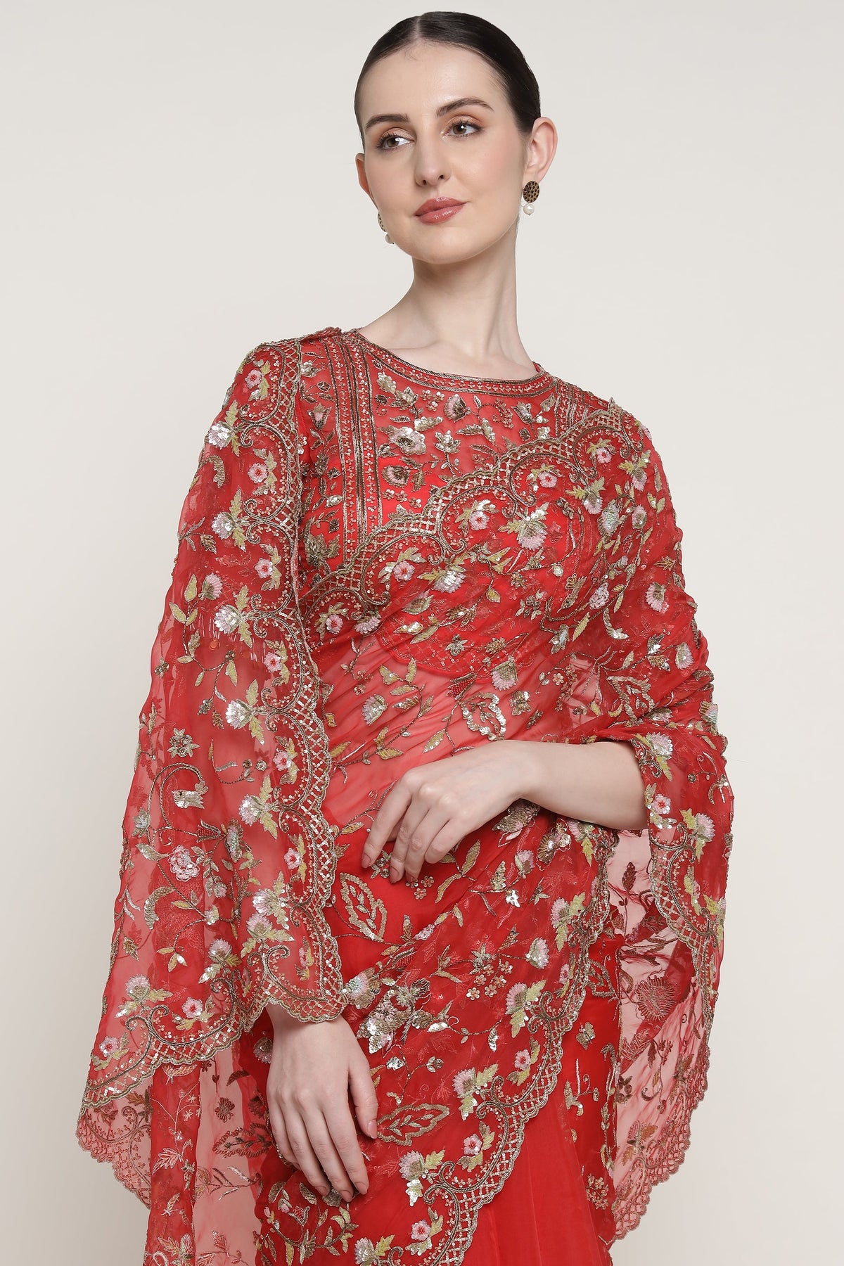 A bridal saree in a rich crimson hue, intricately hand-embroidered with delicate floral motifs and ornate borders. Crafted with exceptional detail, it drapes beautifully for wedding ceremonies and traditional celebrations. A timeless piece designed to feel regal, refined, and truly special for the bride.