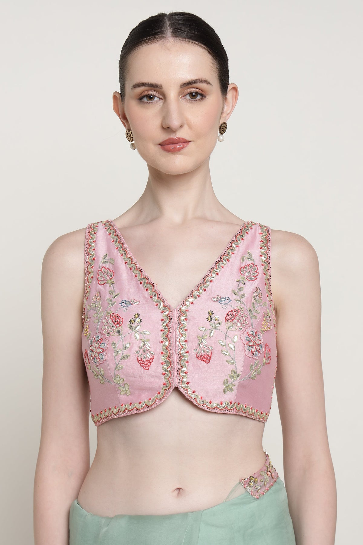 A soft aqua organza saree adorned with delicate floral embroidery and a scalloped border, paired with a blush pink hand-embroidered blouse. Light, graceful, and effortlessly elegant, it’s designed for daytime wedding functions and festive occasions that call for refined, modern charm.