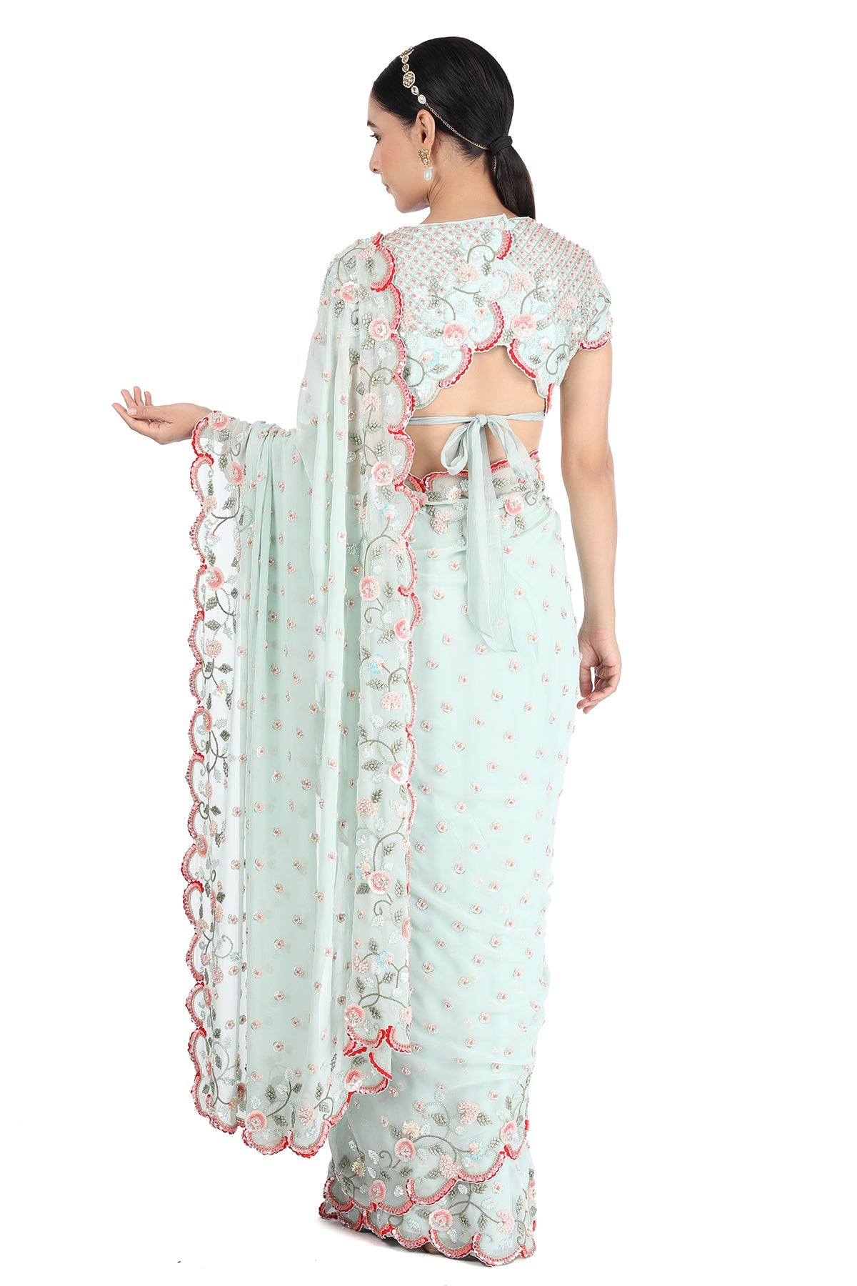 Introducing our Teal Ribbon Scallop Saree crafted from luxurious Bemberg Georgette, exuding elegance and charm. This saree is a masterpiece, adorned with intricate hand embroidery featuring delicate pearls, shimmering sequins, lustrous beads, and vibrant ribbons. The scallop pattern adds a touch of sophistication, making this saree perfect for special occasions and celebrations.
