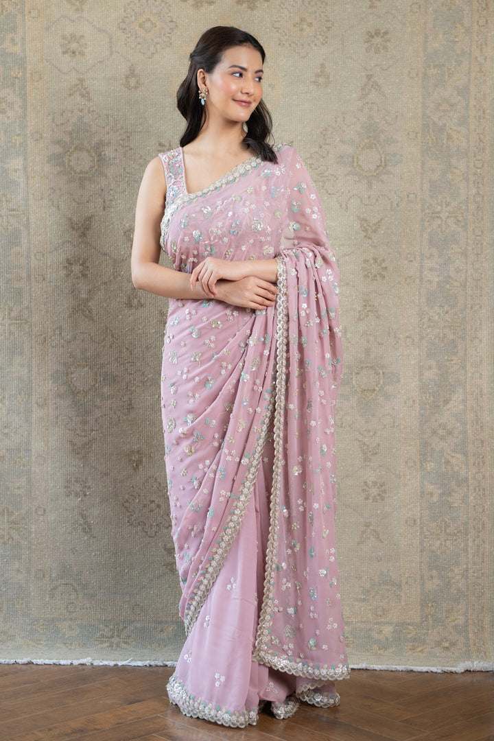 Elegance meets tradition in our Lavender Persian Scattered Flower Saree, a masterpiece crafted for the modern woman who appreciates timeless beauty. This georgette saree is delicately hand-embroidered with intricate sequins and beads, forming a mesmerizing pattern reminiscent of scattered Persian flowers. The lightweight georgette fabric drapes gracefully, ensuring you move with effortless grace.