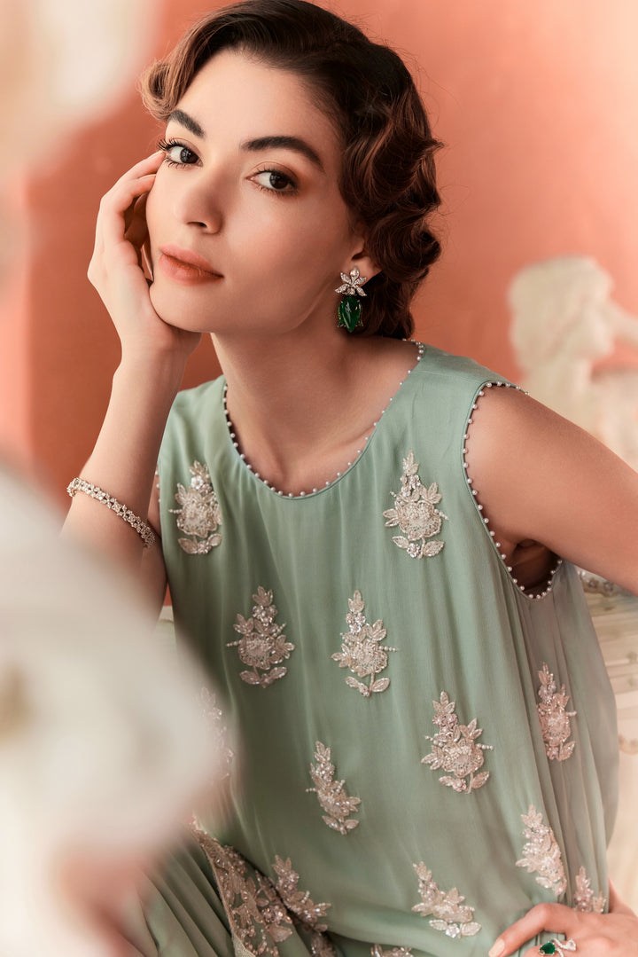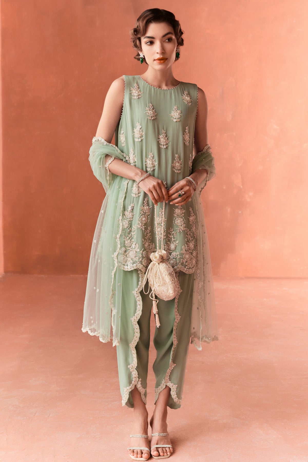 Introducing the "Teal Amaria A-line Short Designer Kurta Set" - a stunning addition to your wardrobe! Crafted with the finest georgette fabric for both the top and bottom, this kurta set promises comfort and style in one elegant package.