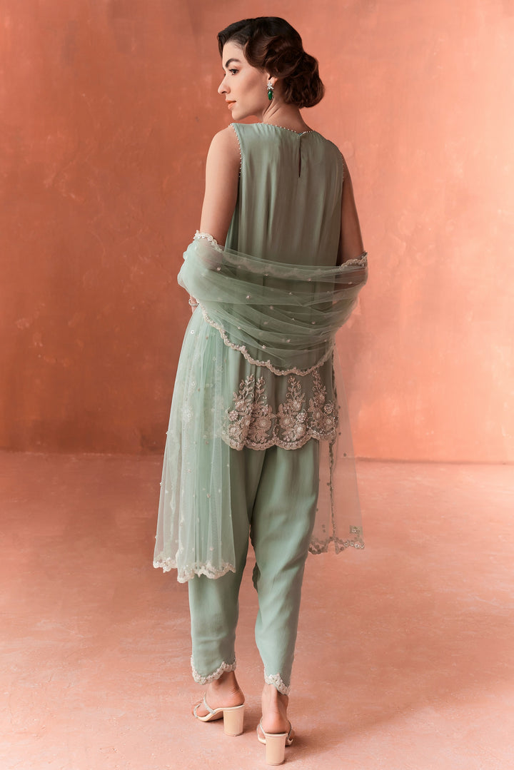 Complete with a delicate net dupatta, this set is perfect for any occasion, from casual gatherings to festive celebrations. Elevate your ethnic wear game with the Teal Amaria A-line Short Designer Kurta Set and make a statement wherever you go!