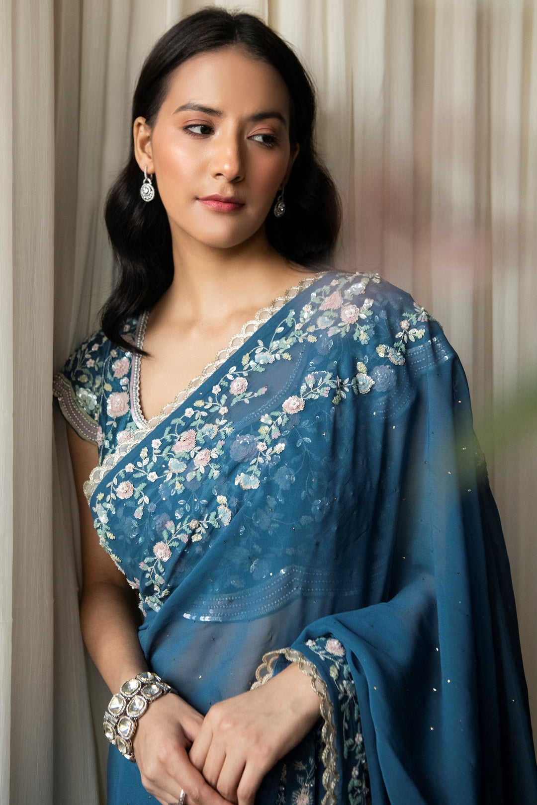 Blue Georgette Saree With beautiful Hand-Embroidery