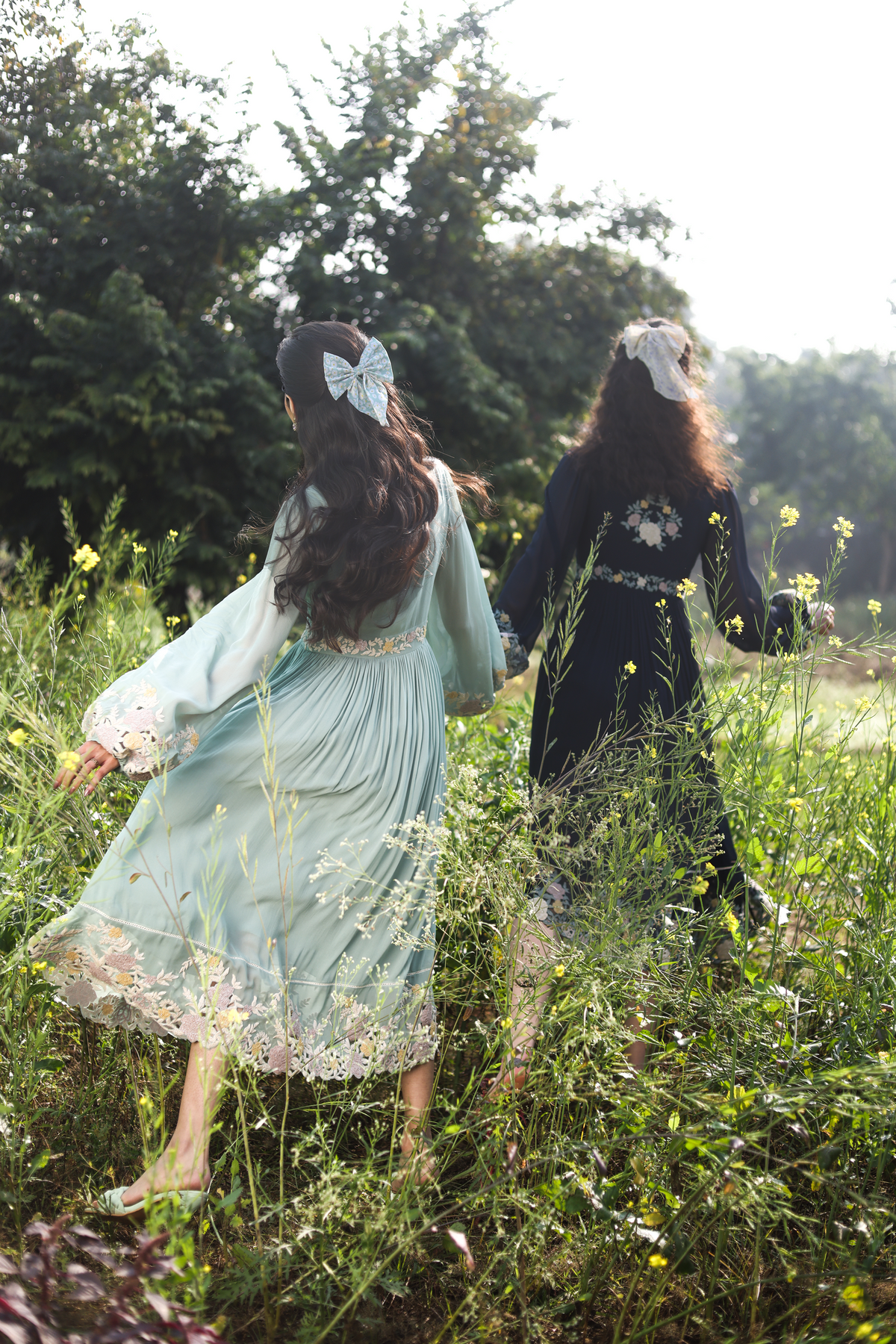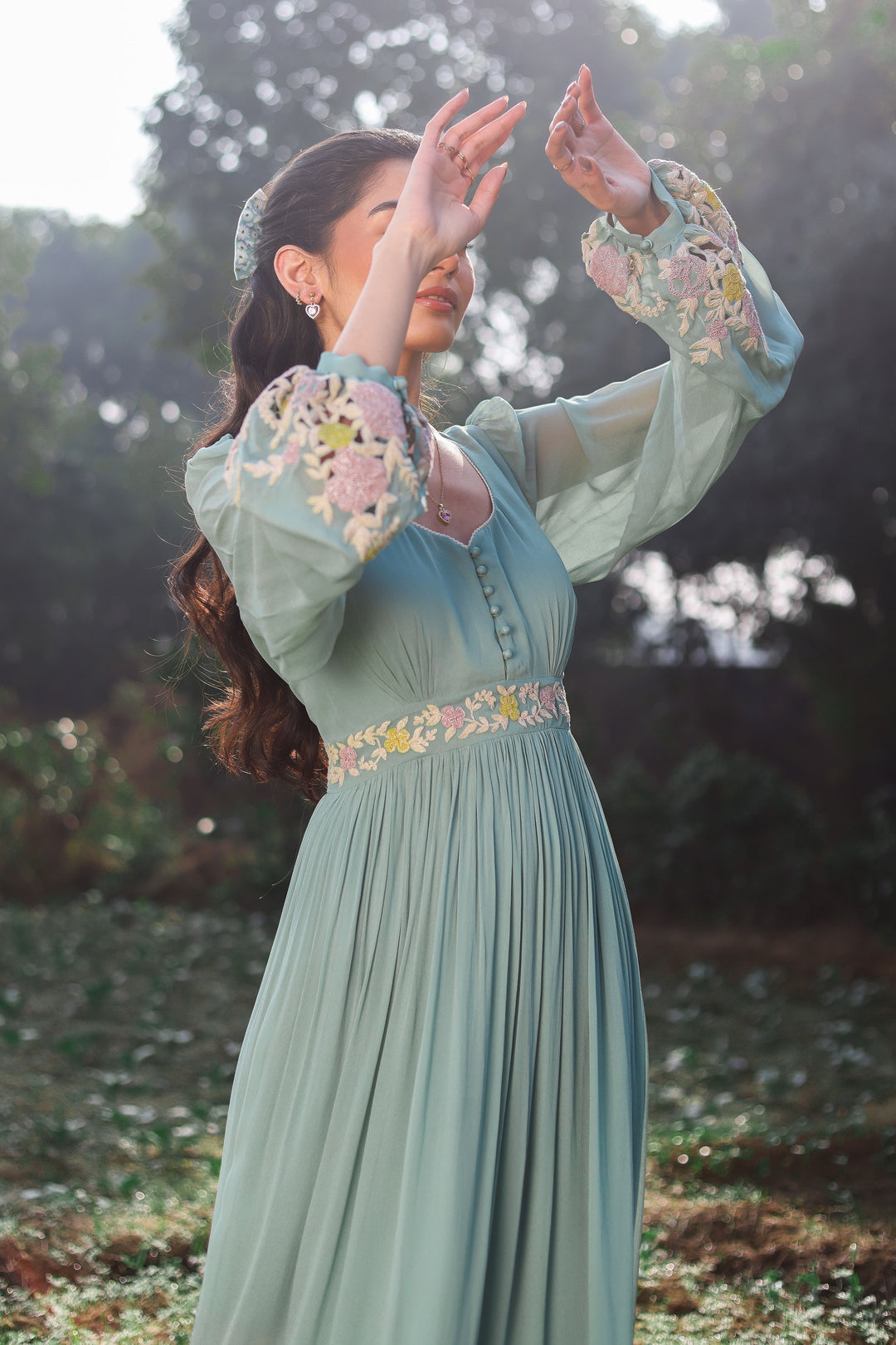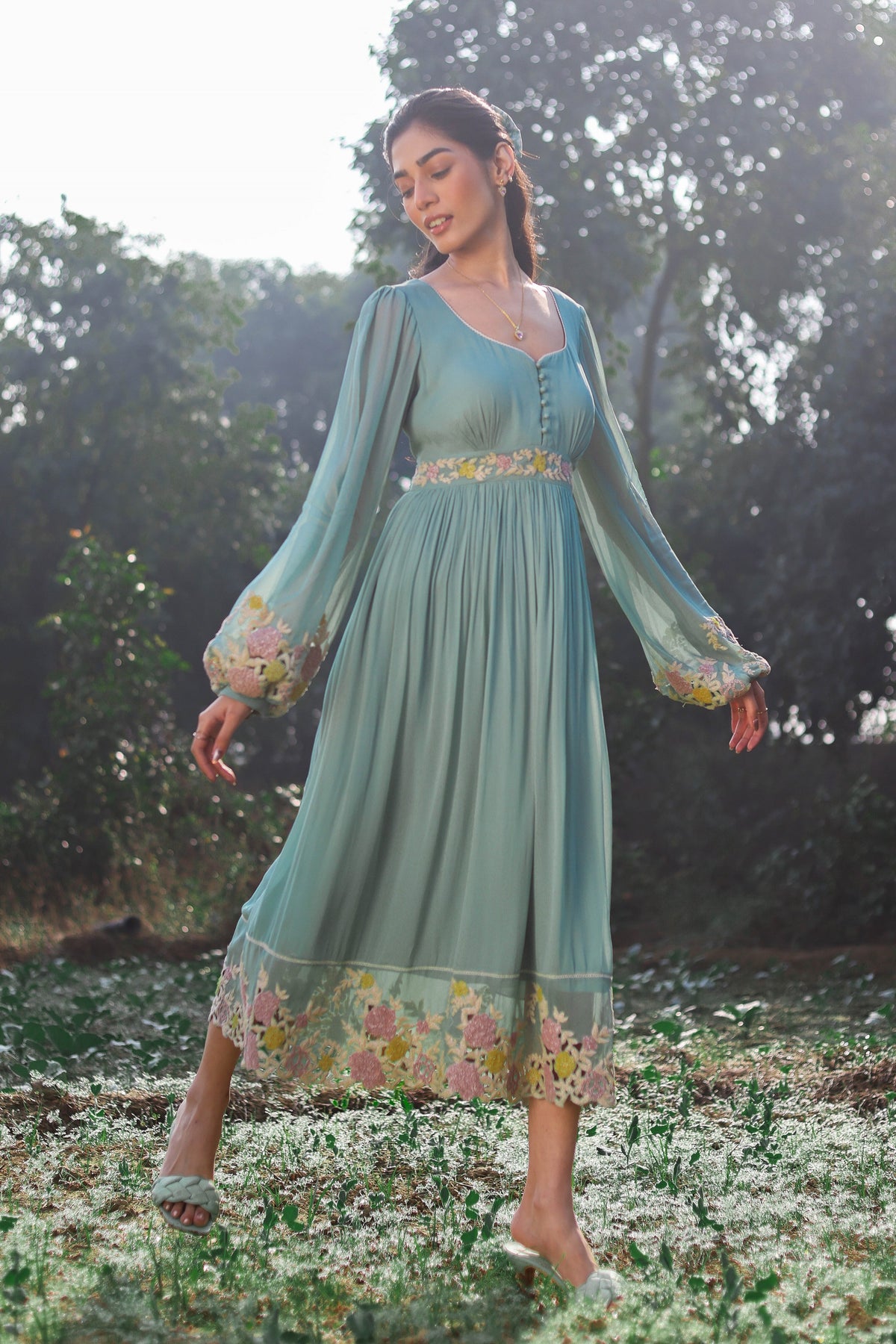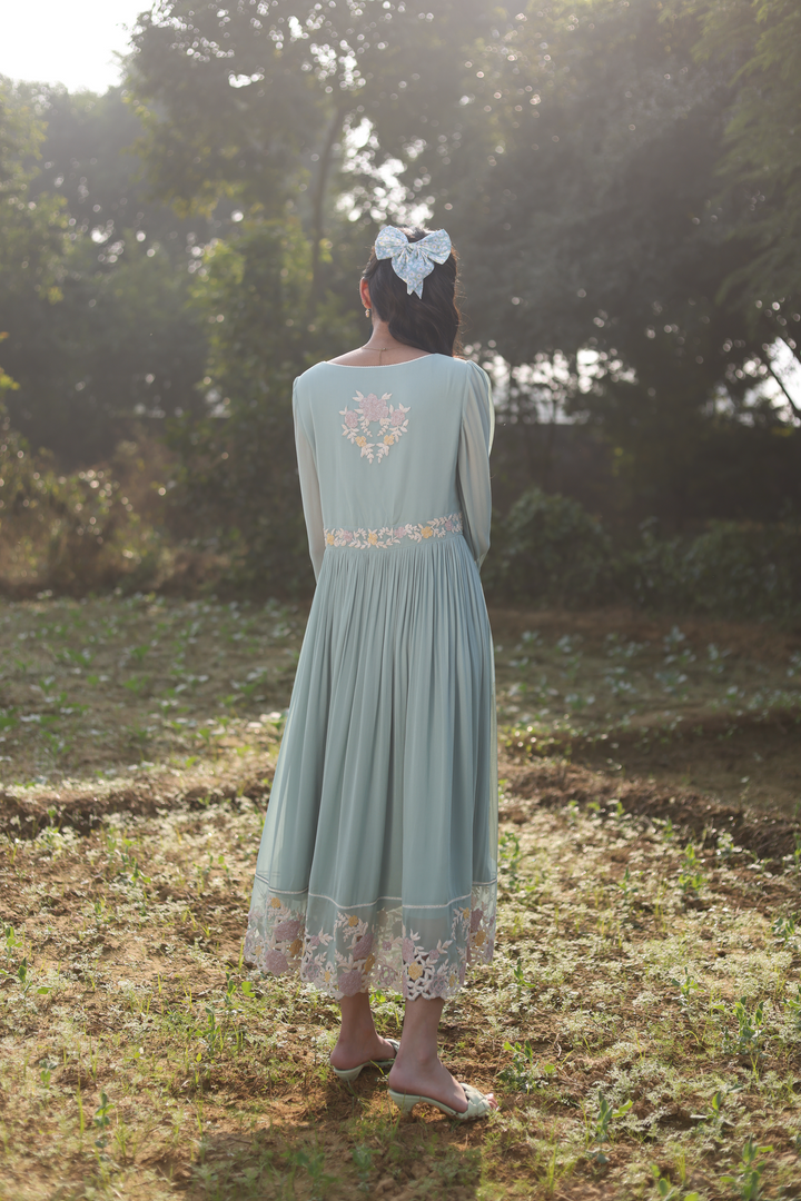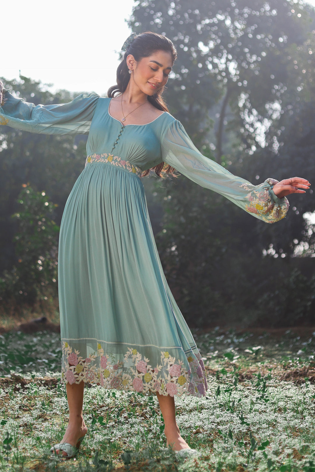 Elegance blooms in this Gardenia Cutwork Dress, adorned with intricate Dori work detailing on graceful bell sleeves.