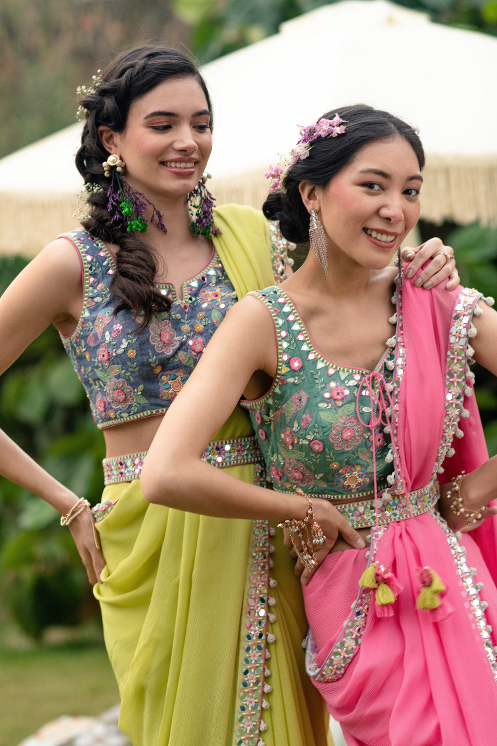 Pink Rainbow Saree With Green Magic Top With Sleeves