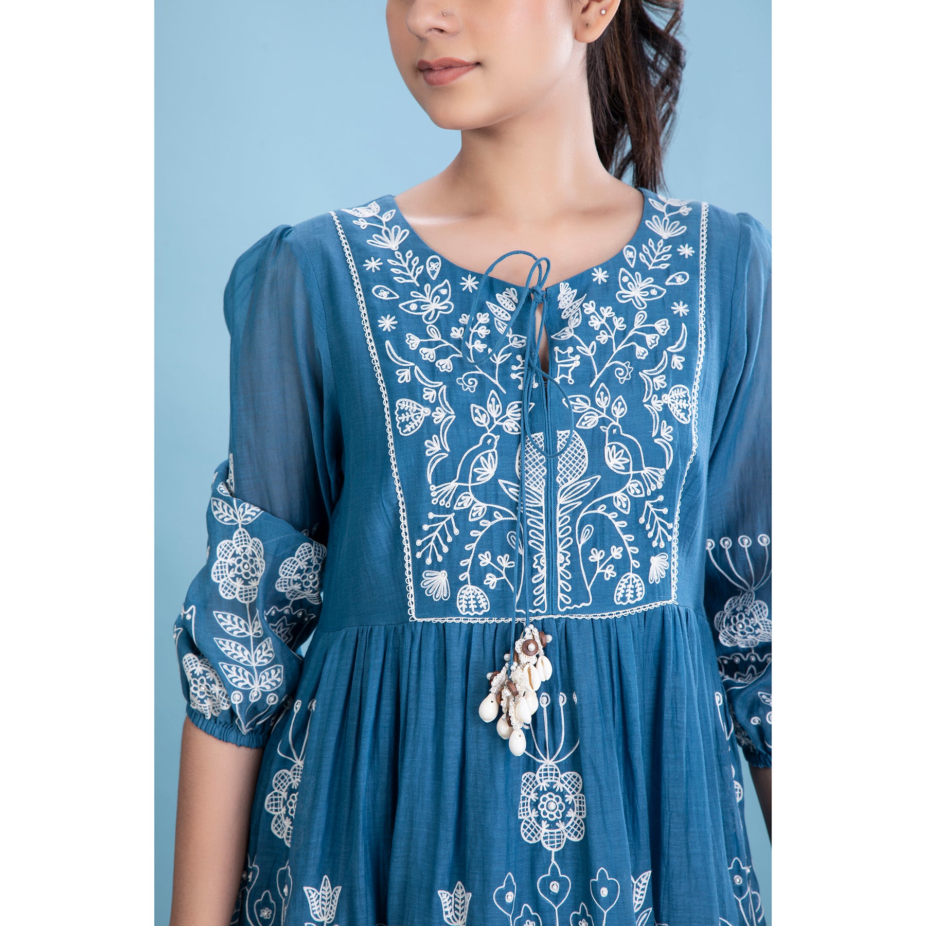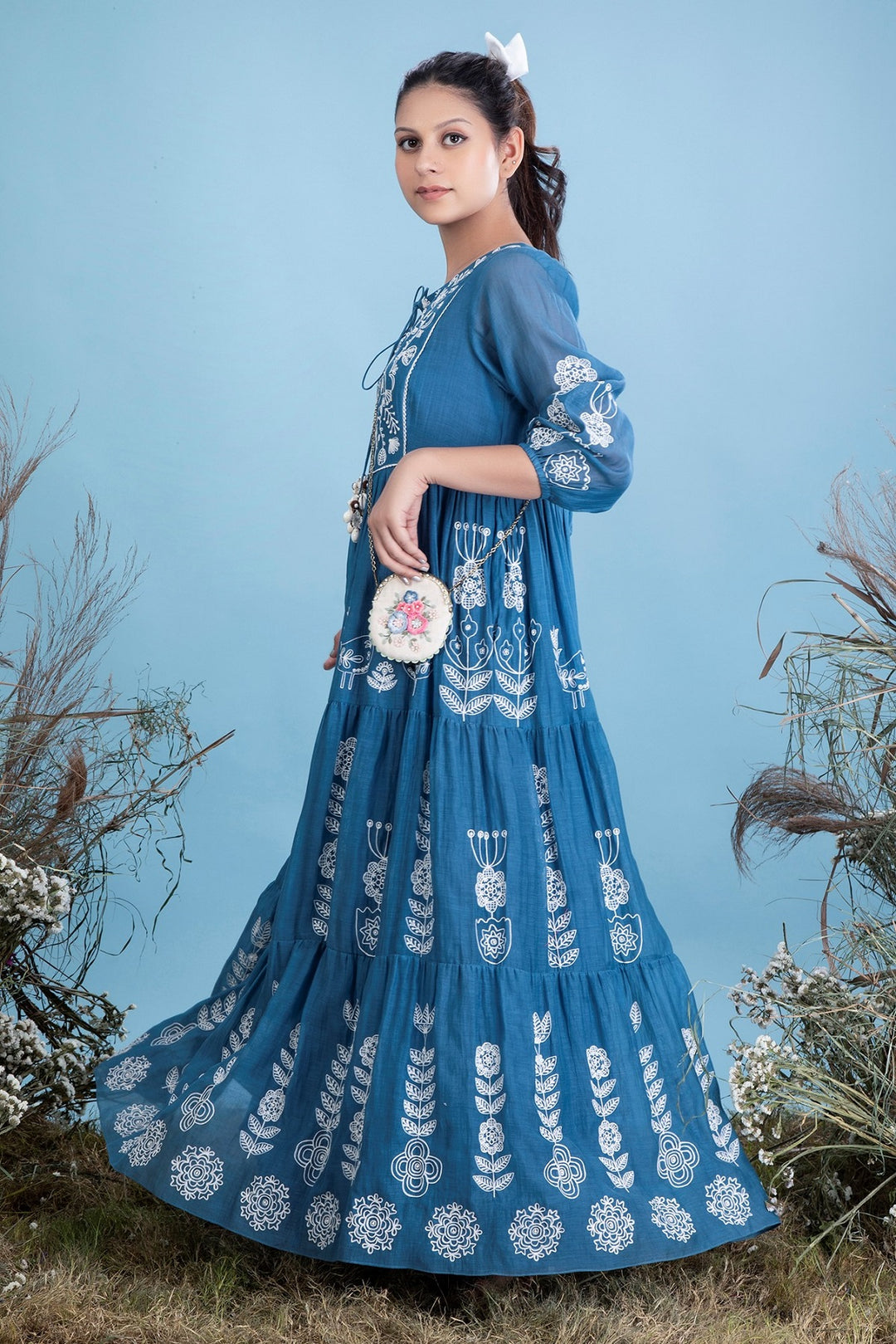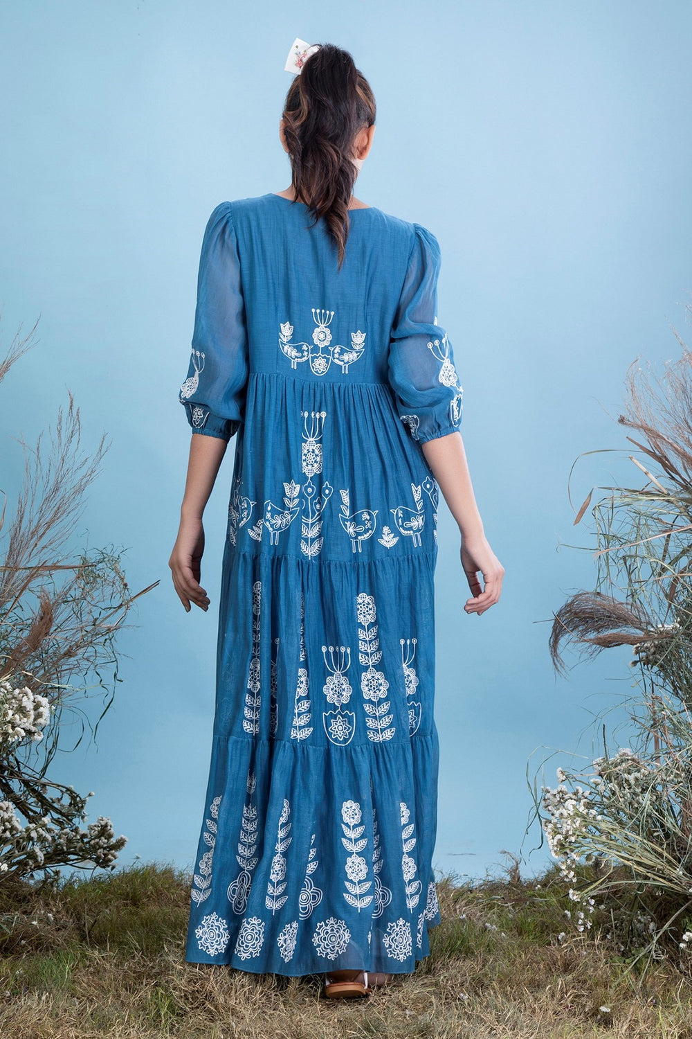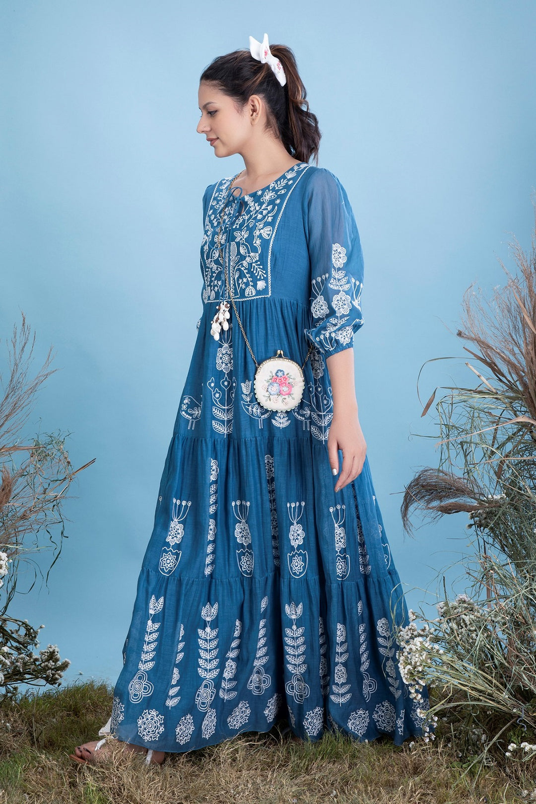 Ari embroidered silk mul long dress in ambar blue.