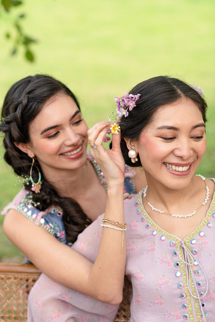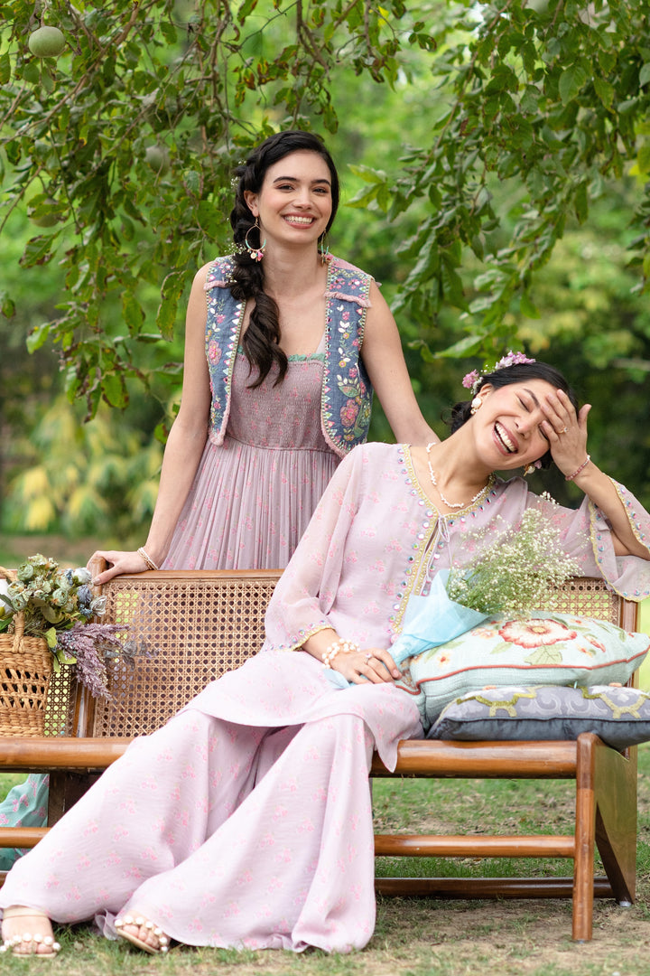Dance through dreams in our Pink Rainbow Dress, spun from georgette lurex, adorned with a spectrum of hues. Paired with a hand-embroidered Gypsy Vest, it's a tapestry of wanderlust and whimsy.