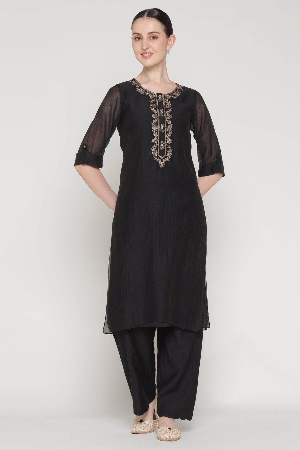 Black Gul Sadaf Coord Set, featuring intricate dabka embroidery on premium mul chanderi  fabric. Perfect for festive gatherings, weddings, and parties, this designer pink coord set blends contemporary charm with traditional craftsmanship for a timeless, graceful look.
