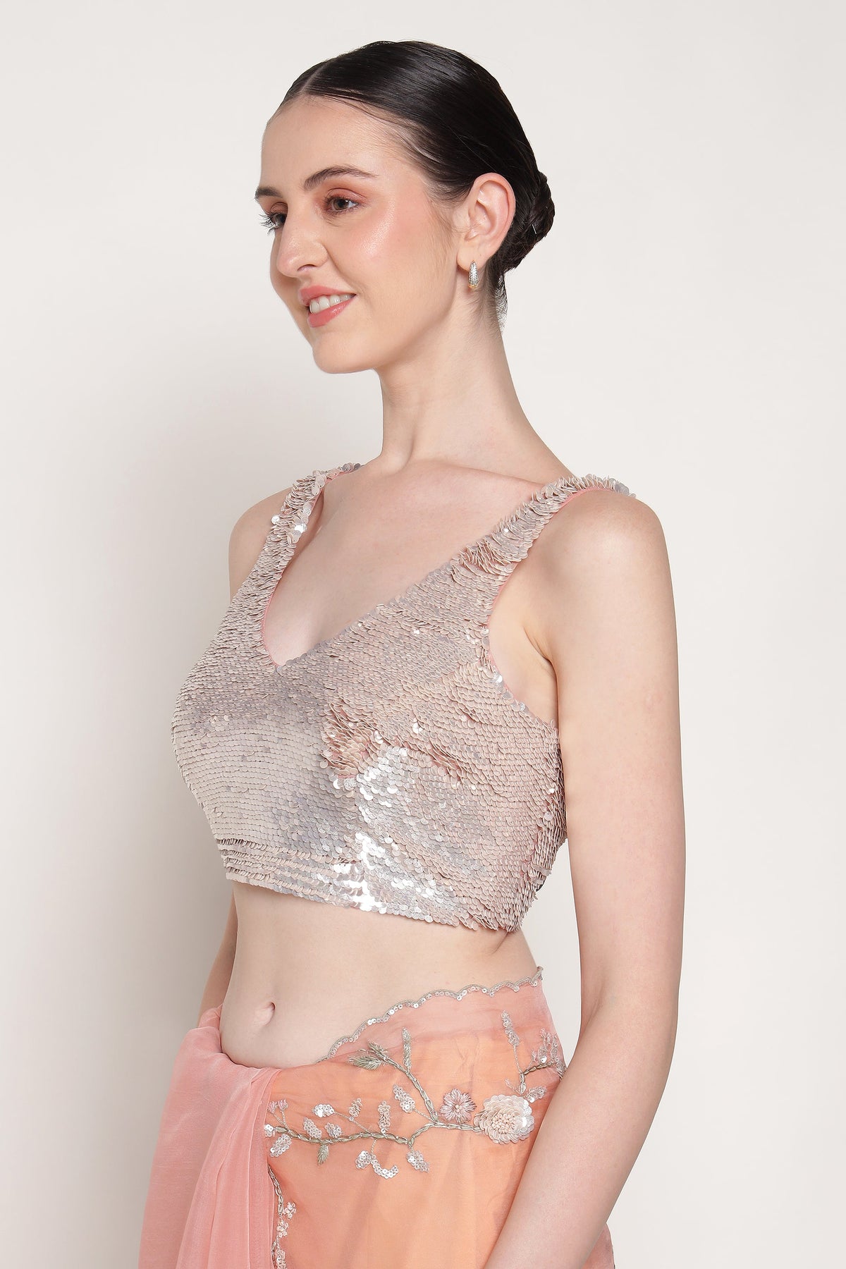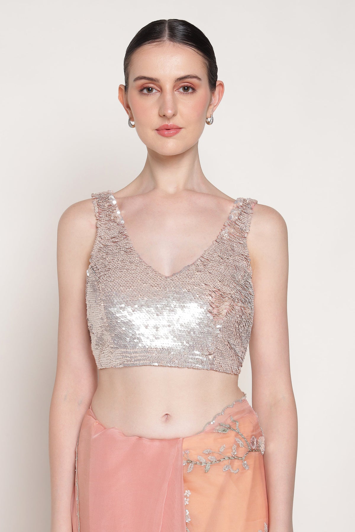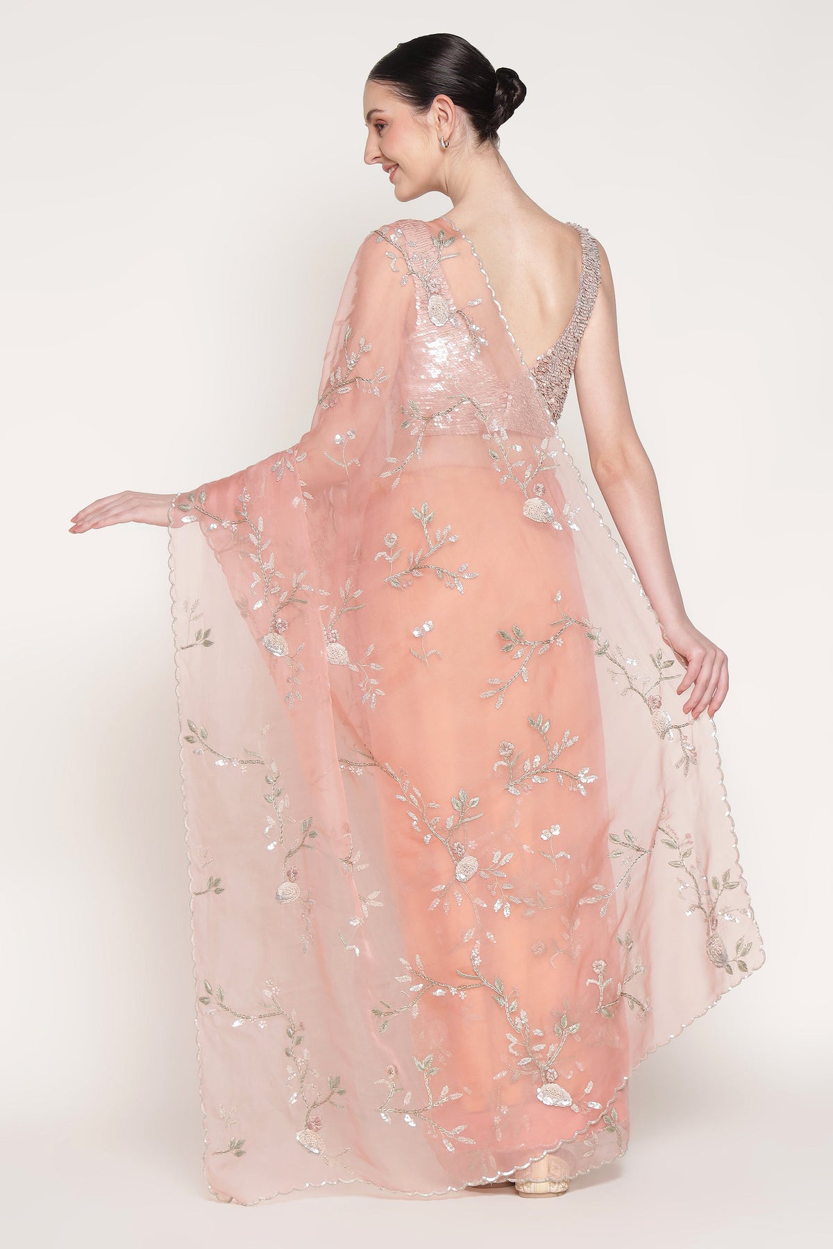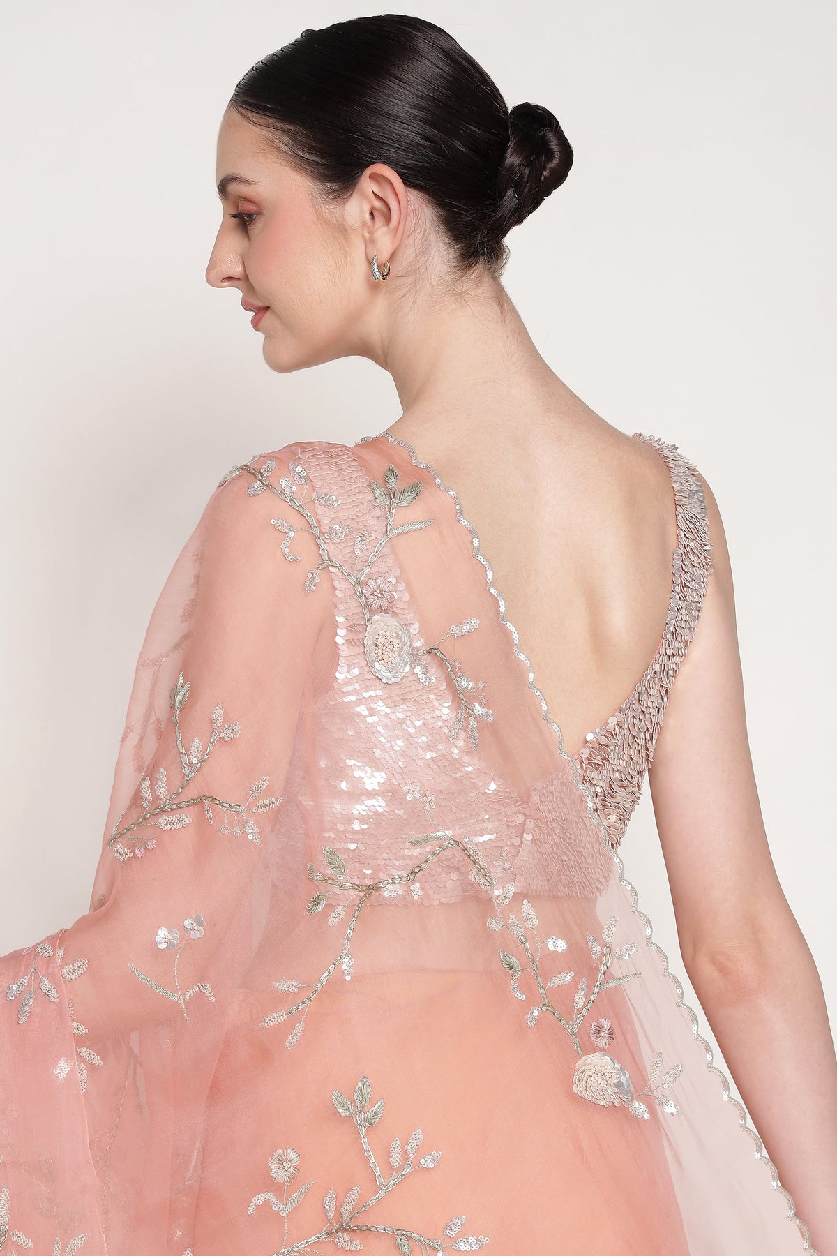A soft blush-pink organza saree adorned with delicate hand embroidery. Lightweight, elegant, and effortlessly feminine perfect for festive occasions, daytime events, and refined celebrations.