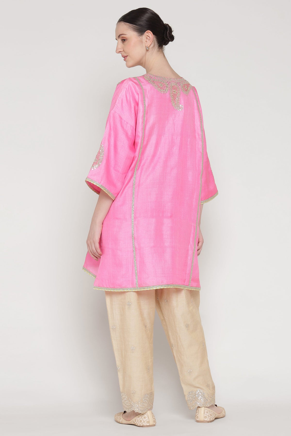 Woman wearing a pink embroidered kurta with beige pants on a white background