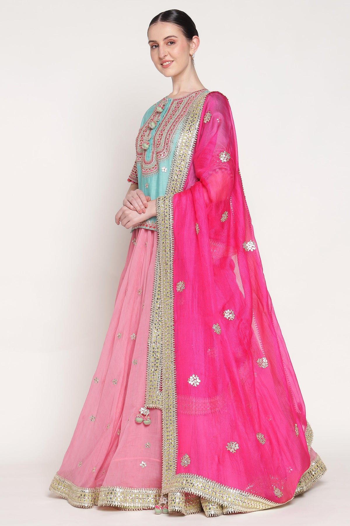 Woman wearing a traditional outfit with a pink dupatta and blue top on a white background