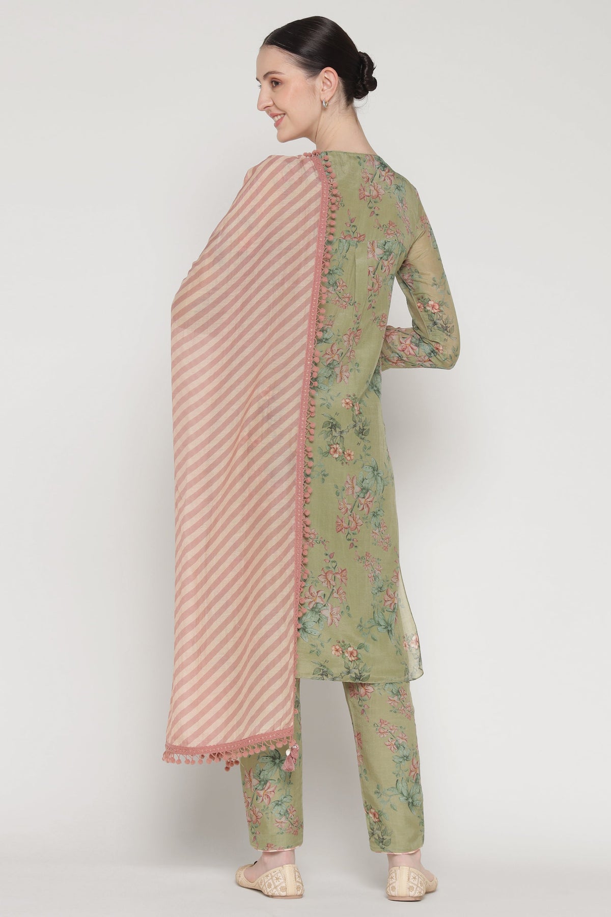 Woman wearing a green floral kurta with matching pants and a pink dupatta on a white background