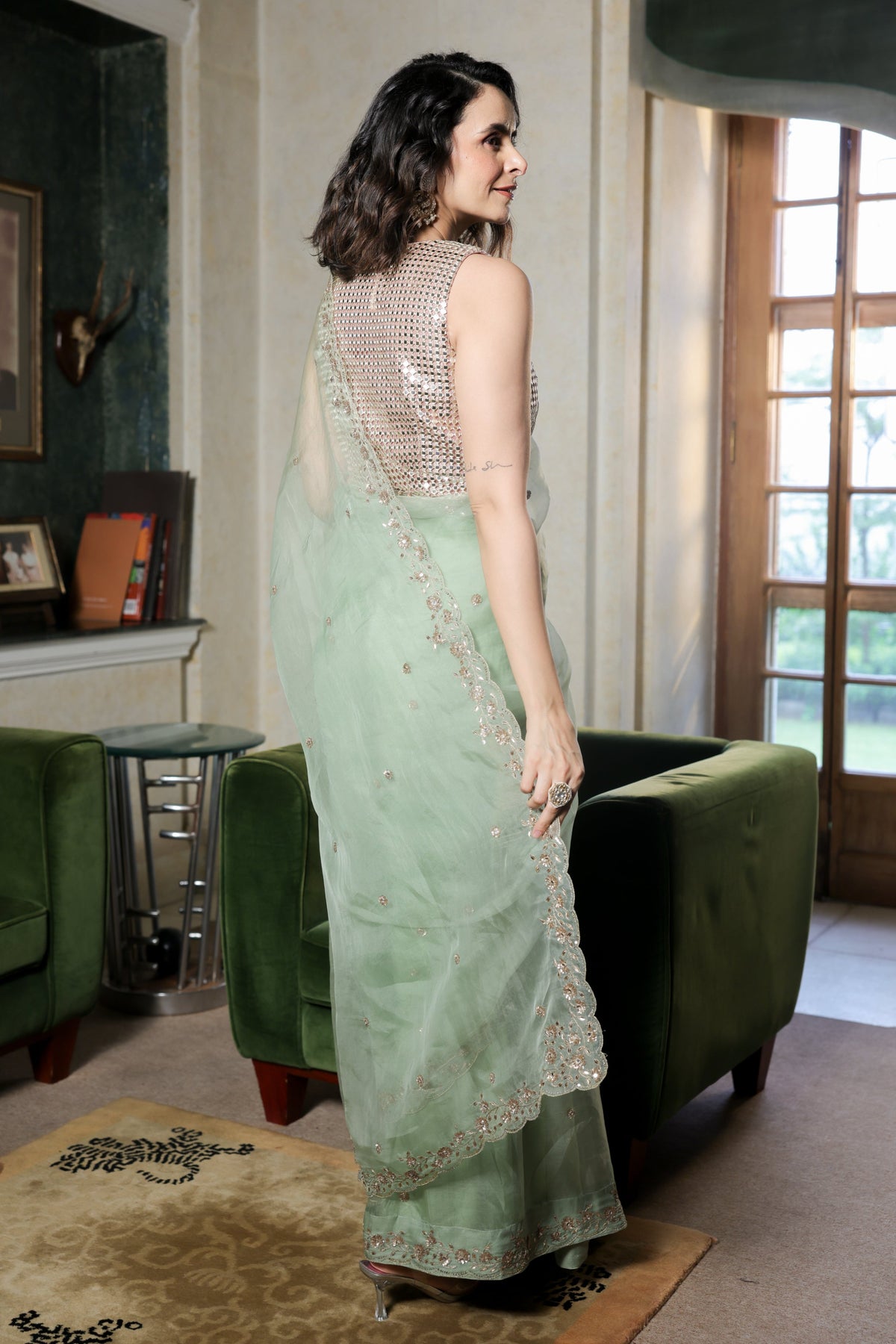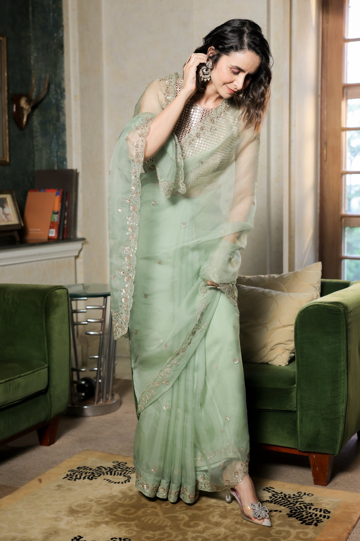 Crafted in fine organza, the Mirror Sitara Saree Set is adorned with delicate hand embroidery. Designed with a lightweight fall and a young blouse, it moves with ease and elegance, ideal for evening festivities and dusky soirées. An heirloom in the making for the discerning wardrobe.