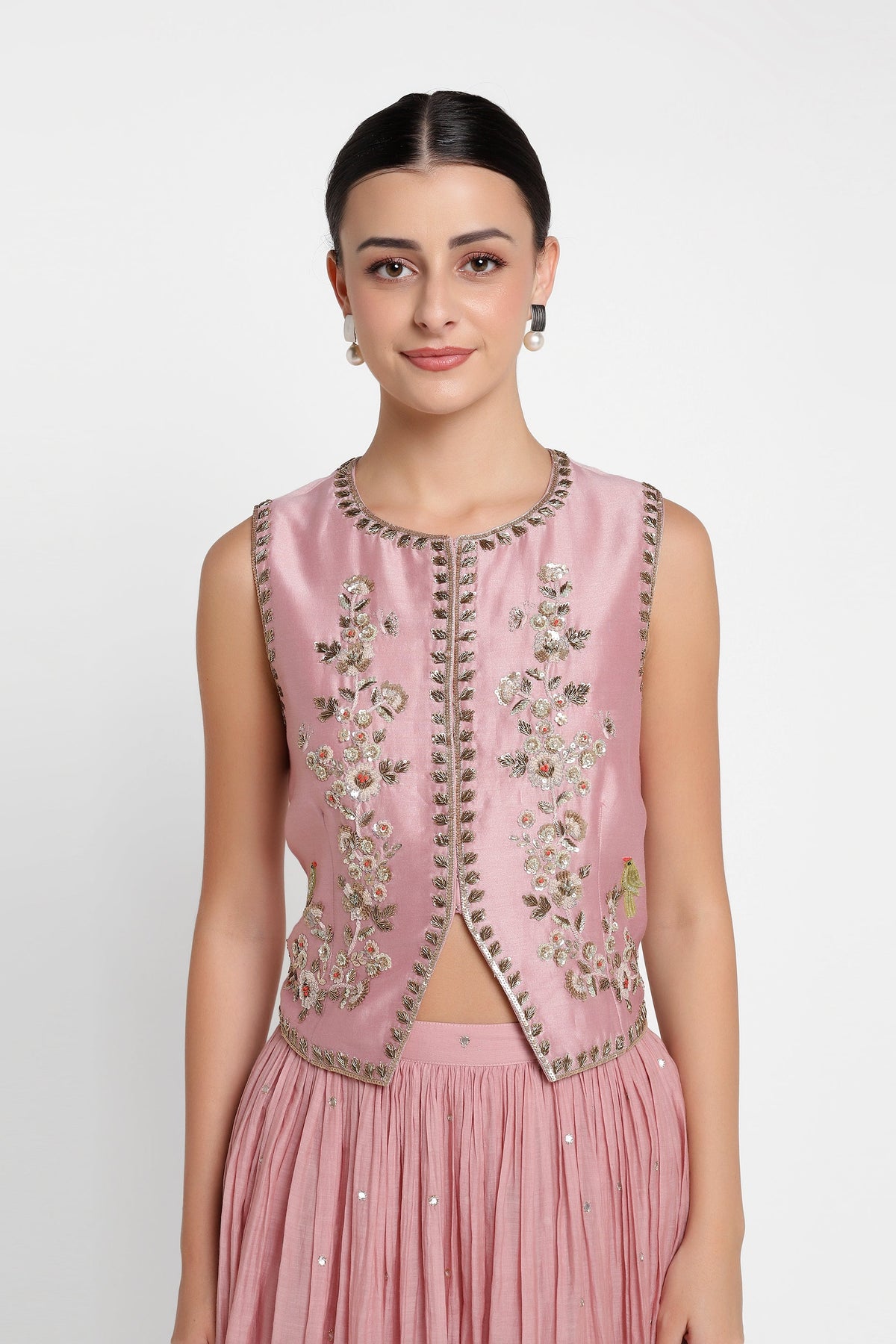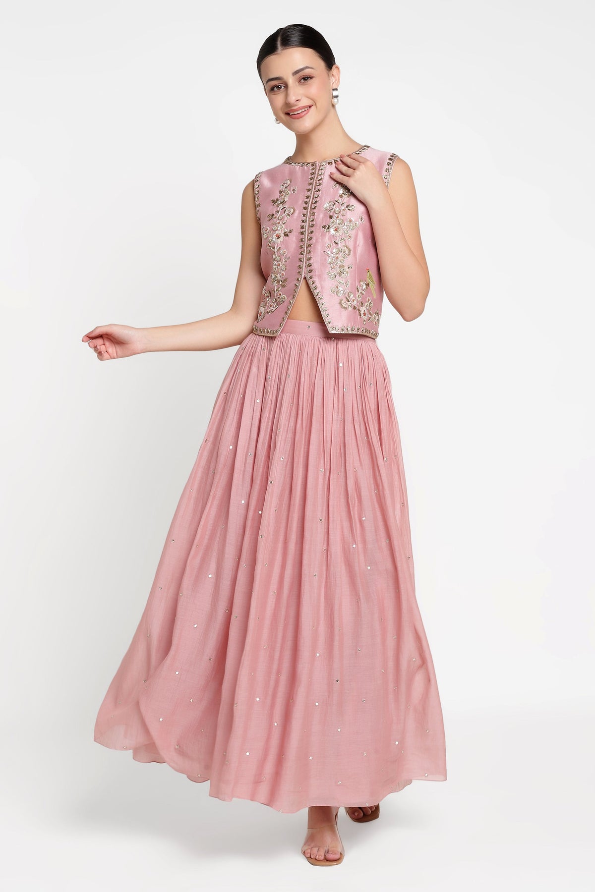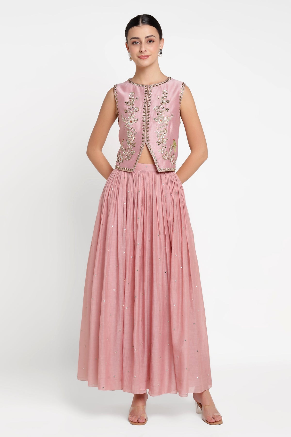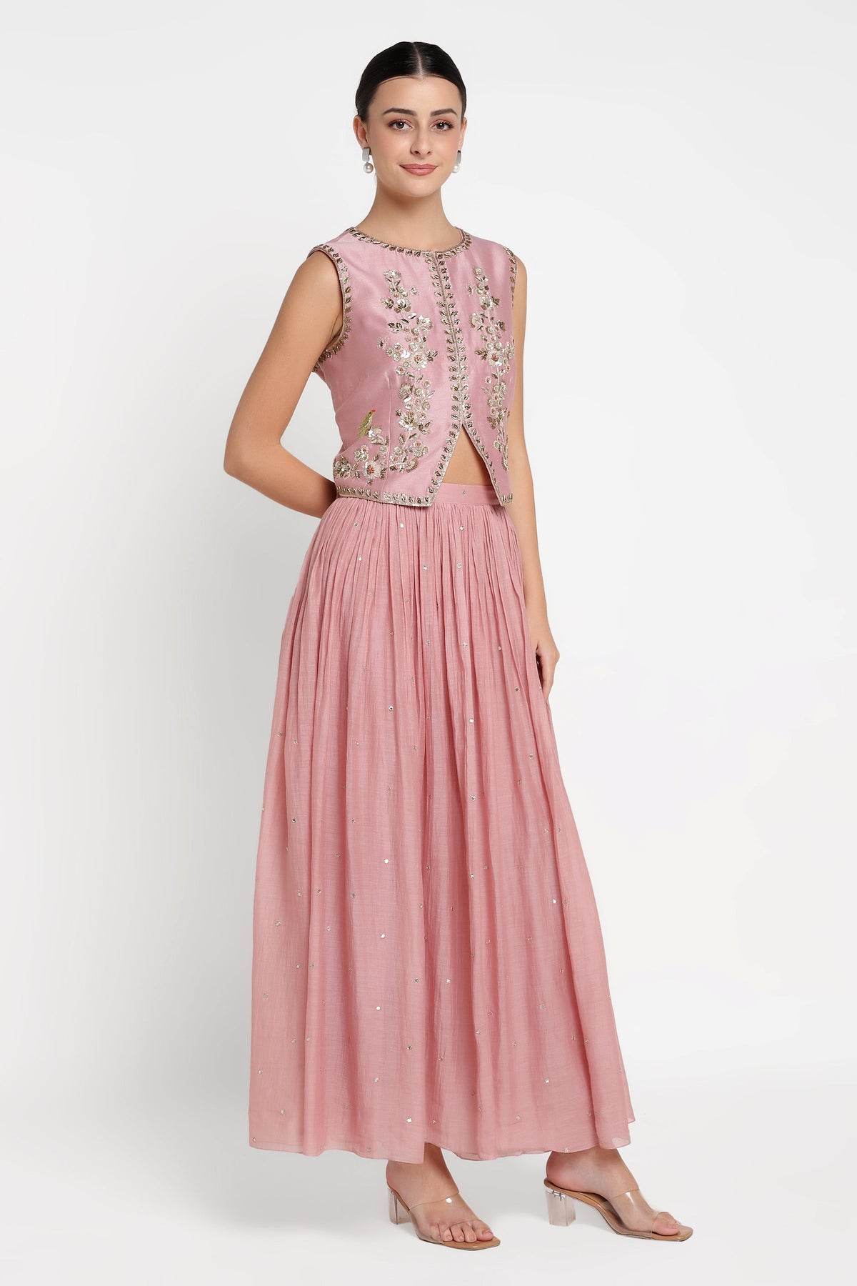 Woman wearing a pink embroidered vest over a matching skirt on a white background