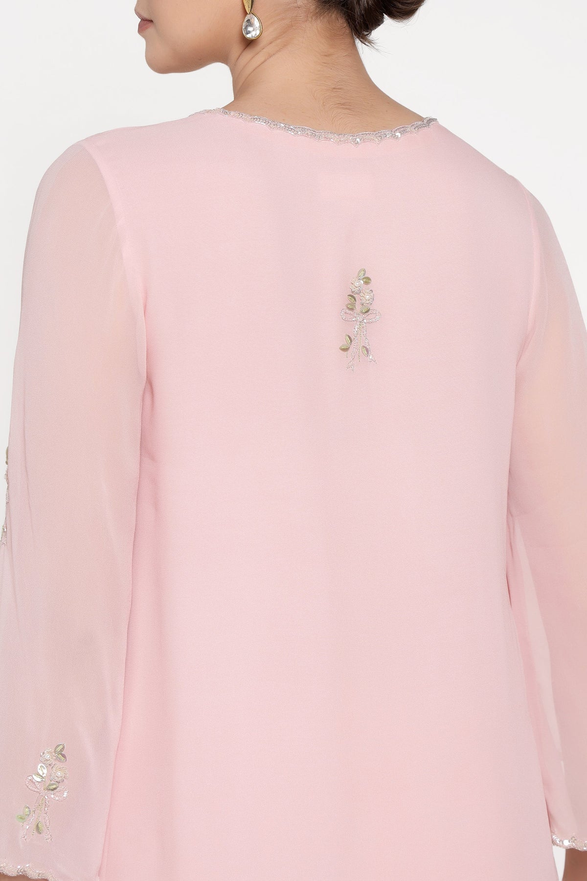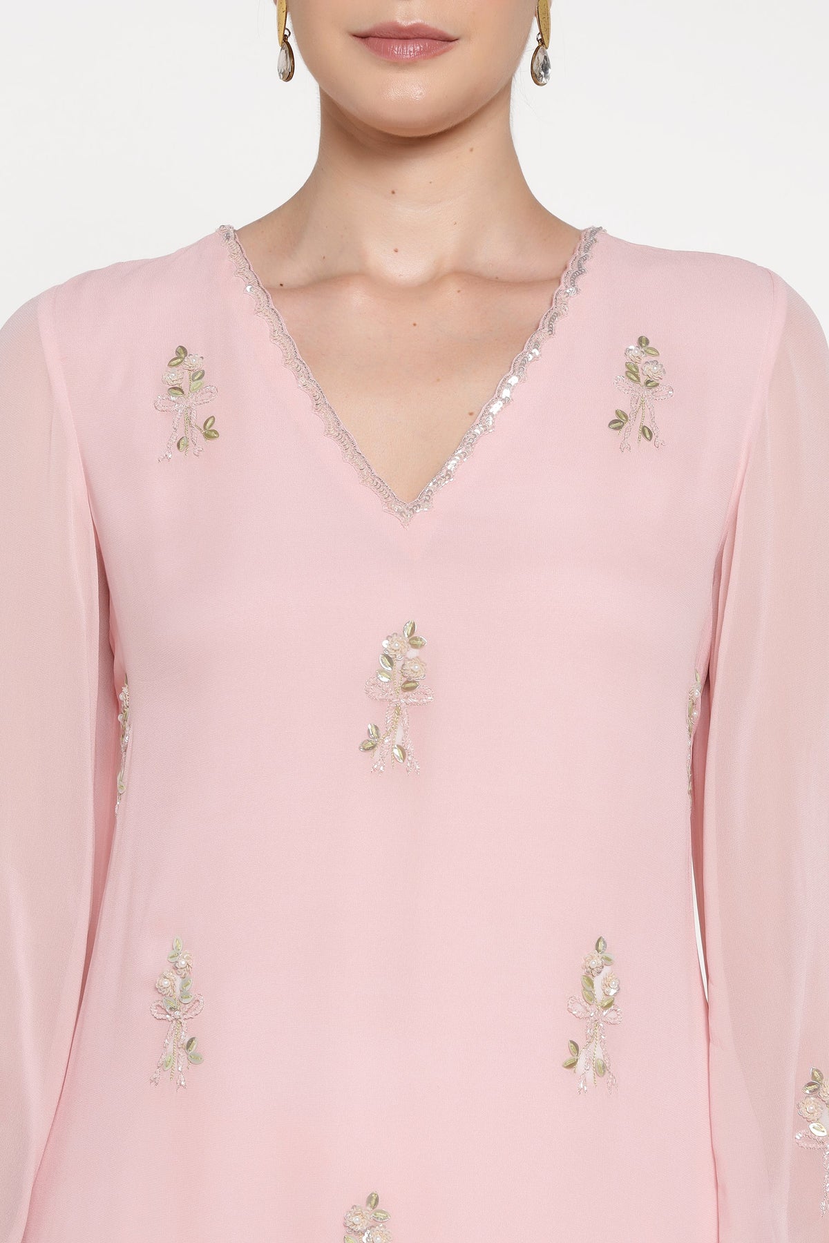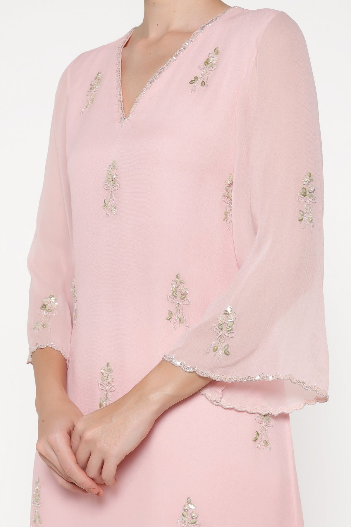 Woman wearing a light pink blouse with floral embroidery on a white background