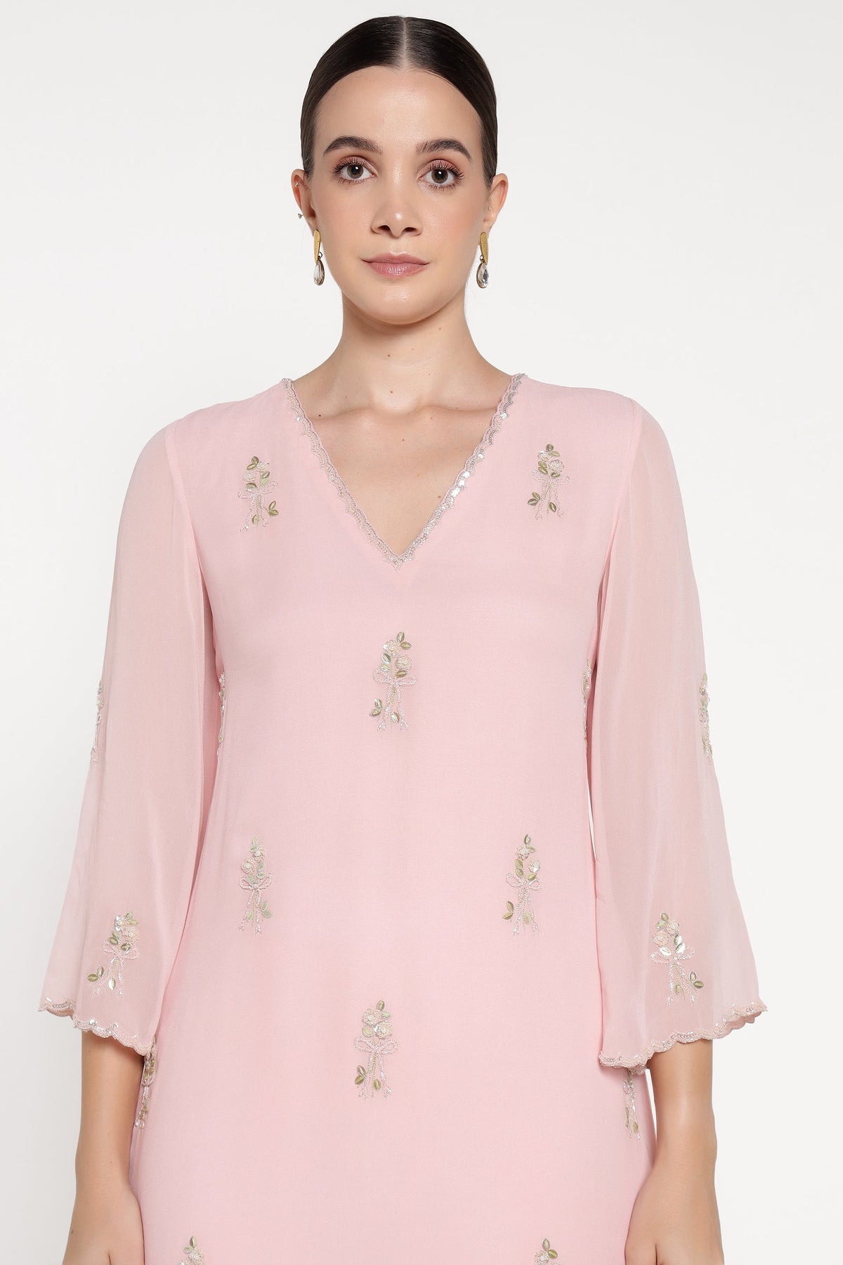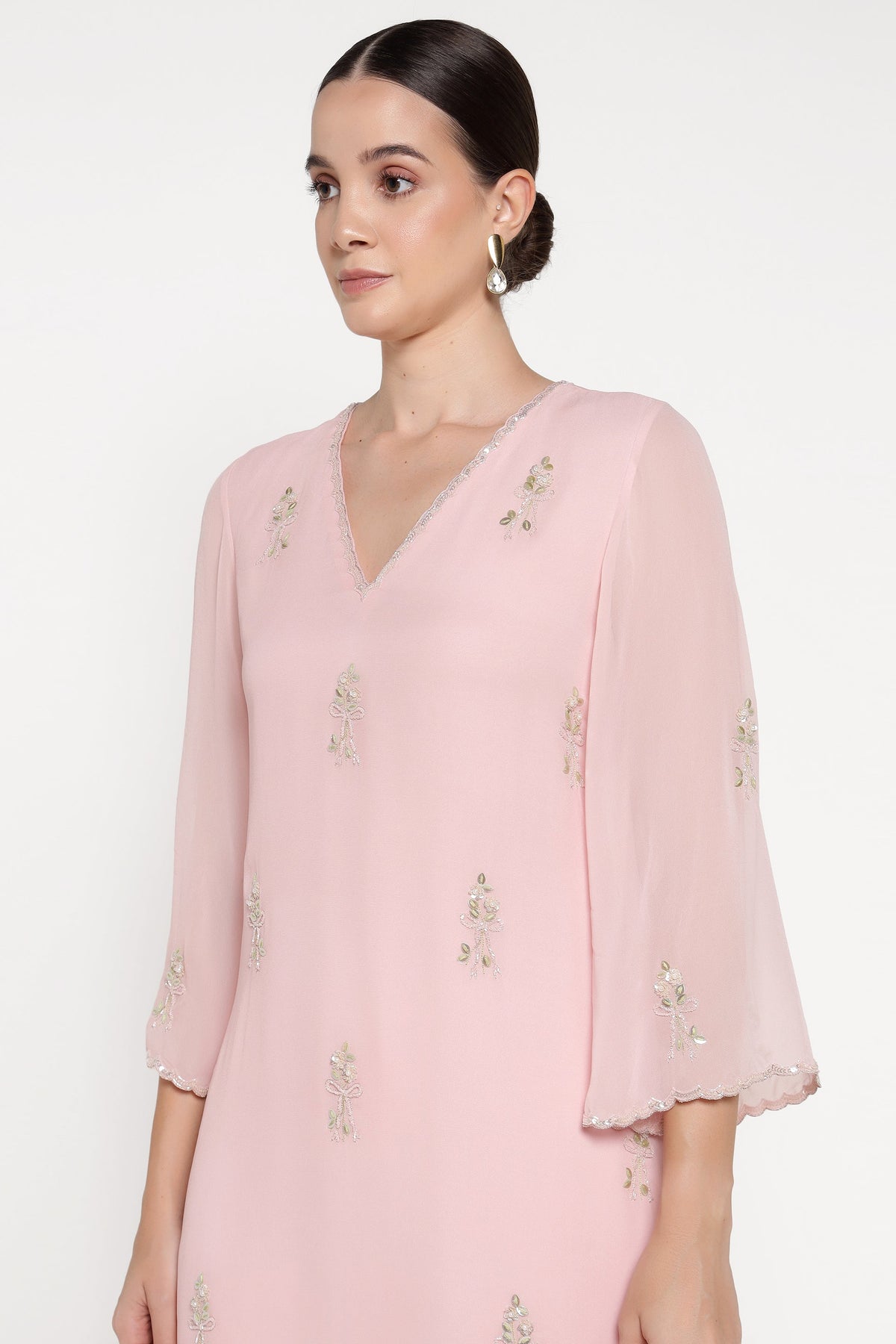 Woman wearing a light pink dress with floral embellishments on a white background