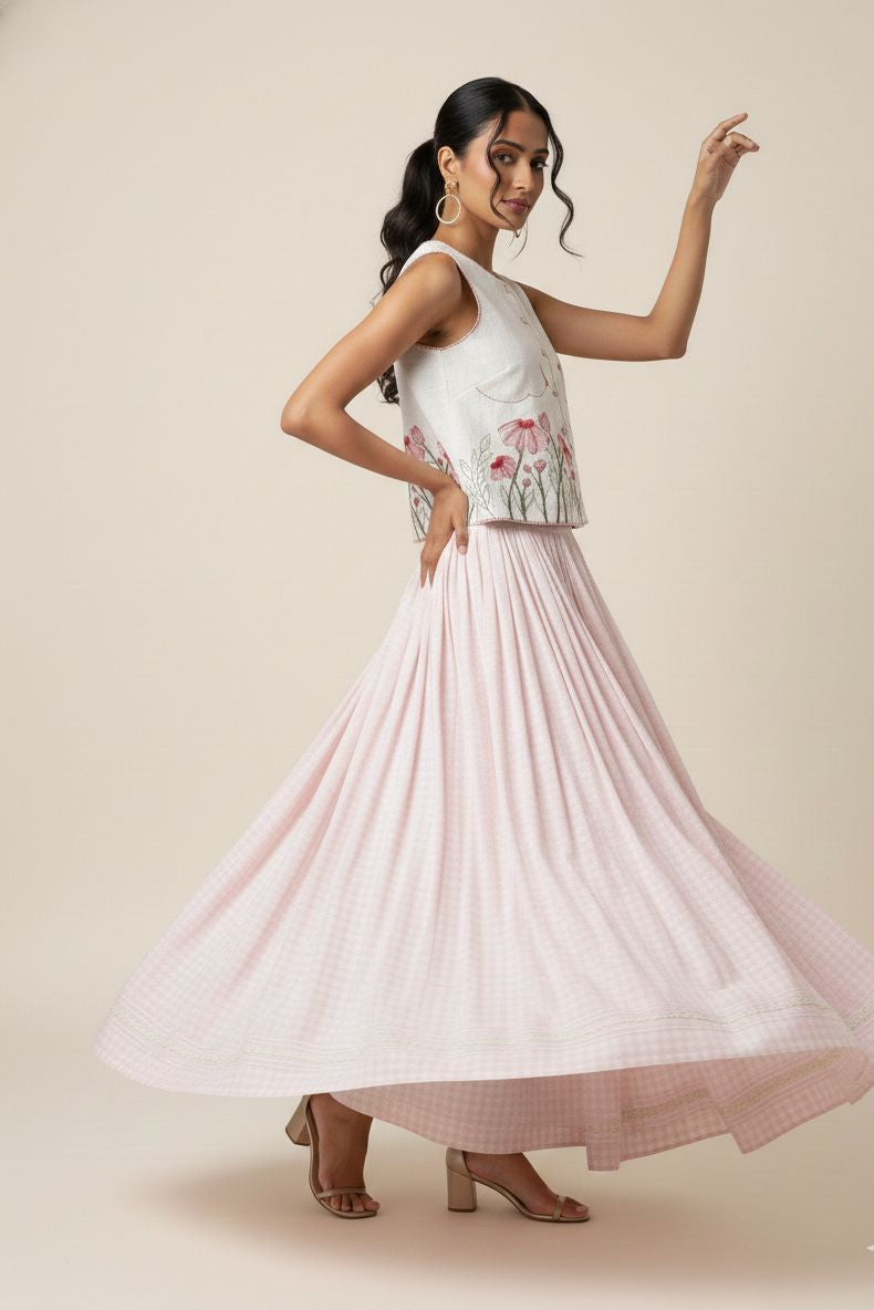 Blossom Field Skirt & Top set featuring an ivory sleeveless top with delicate floral embroidery, paired with a flowy blush gingham skirt. Designed in a lightweight cotton slub fabric with soft pleats, this set offers effortless comfort and timeless charm. Perfect for daytime festivities, summer events, and resort wear.