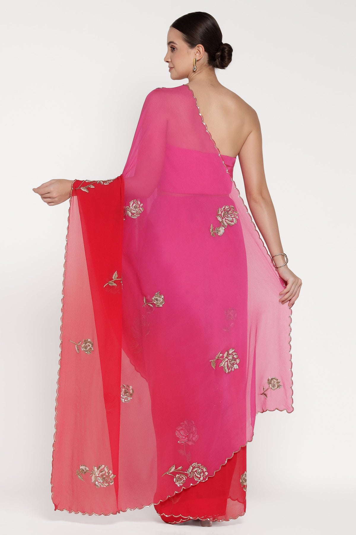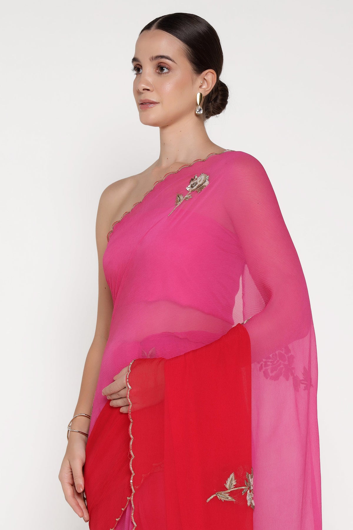 Woman wearing a pink and red saree with floral embroidery on a white background
