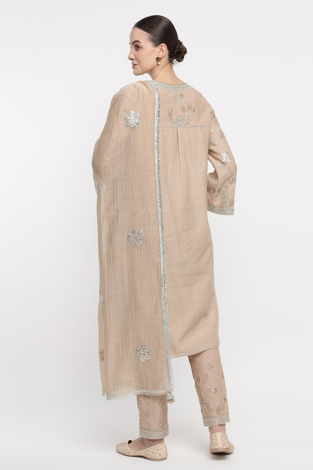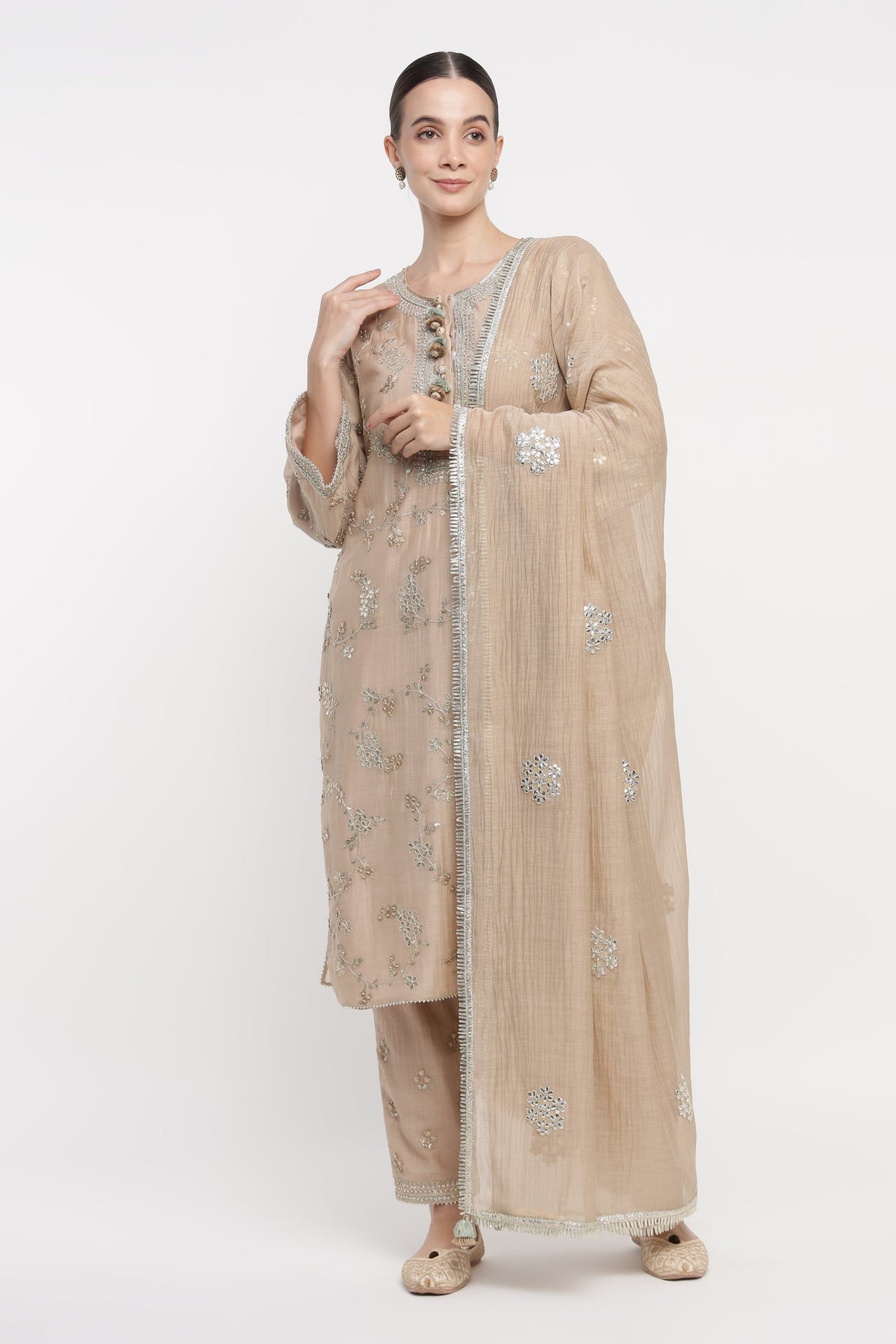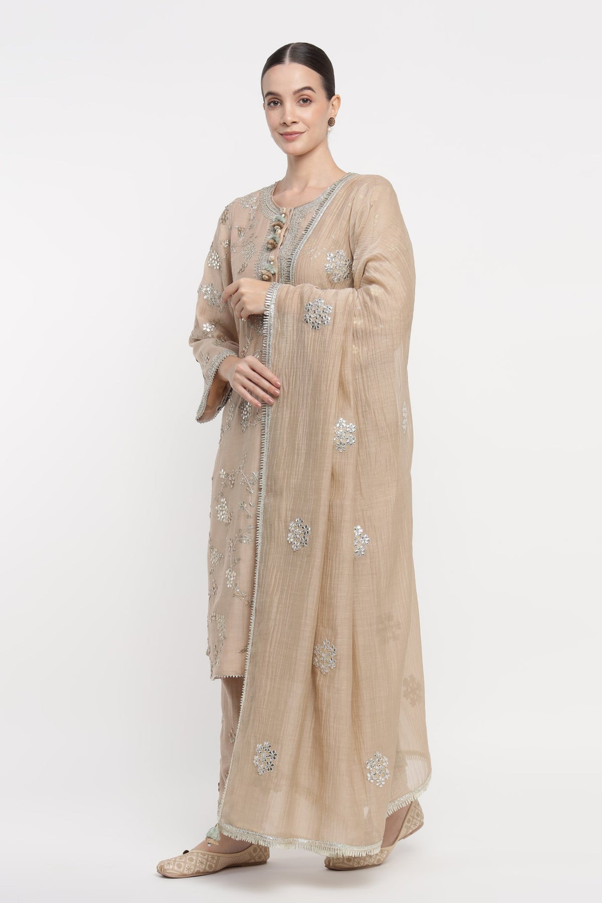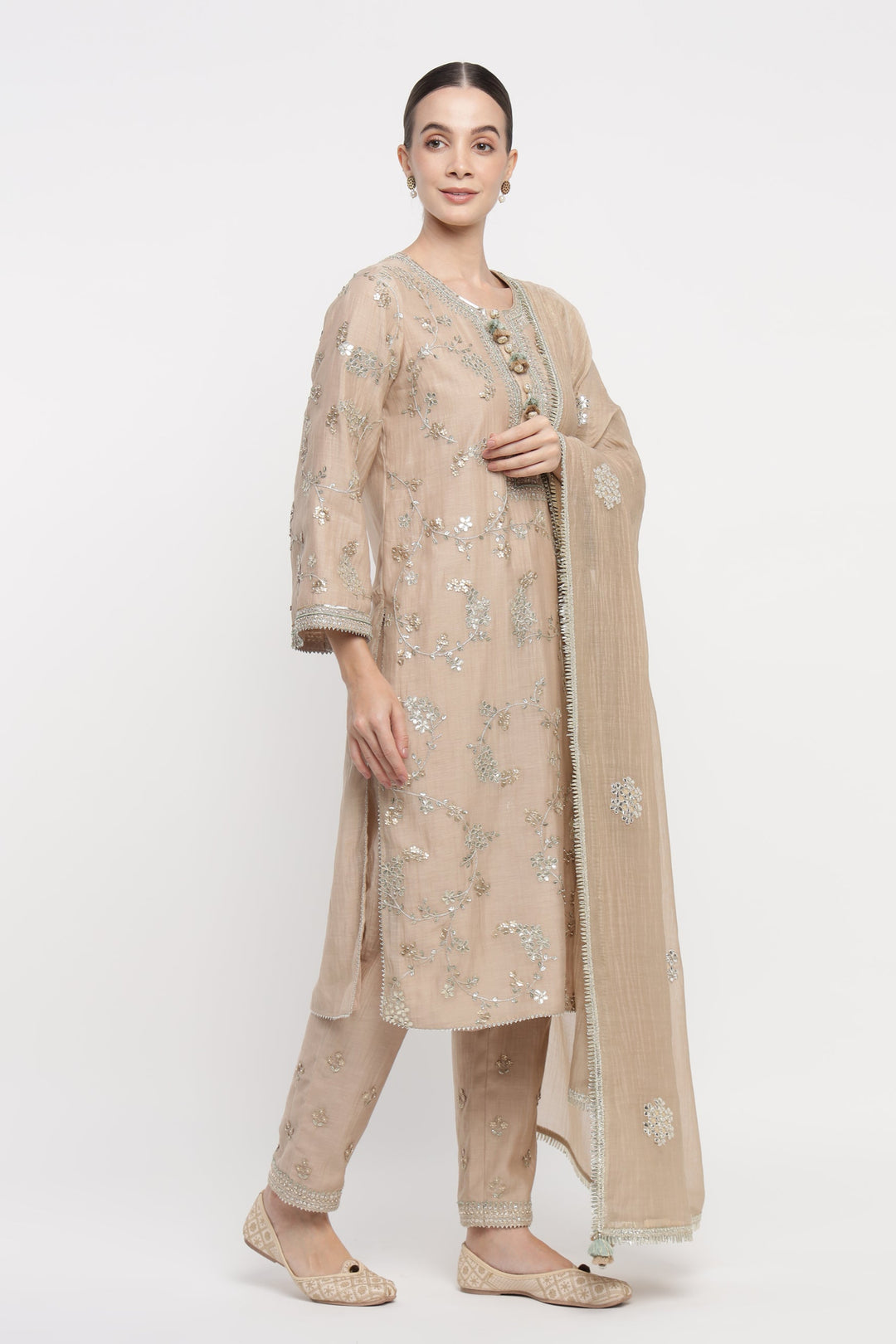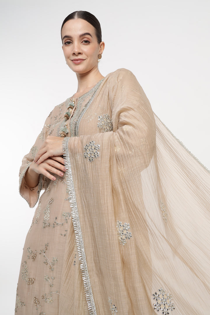 Drape yourself in the Beige Vrinda Gota Jaal Kurta Set, crafted from soft Mul Chanderi. Adorned with delicate Gota Patti, this beige embroidered kurta set offers timeless elegance. A light, festive kurta set perfect for Rakhi, Diwali, Eid, Satsang, and wedding functions. Your essential summer kurta set for refined comfort and celebration.