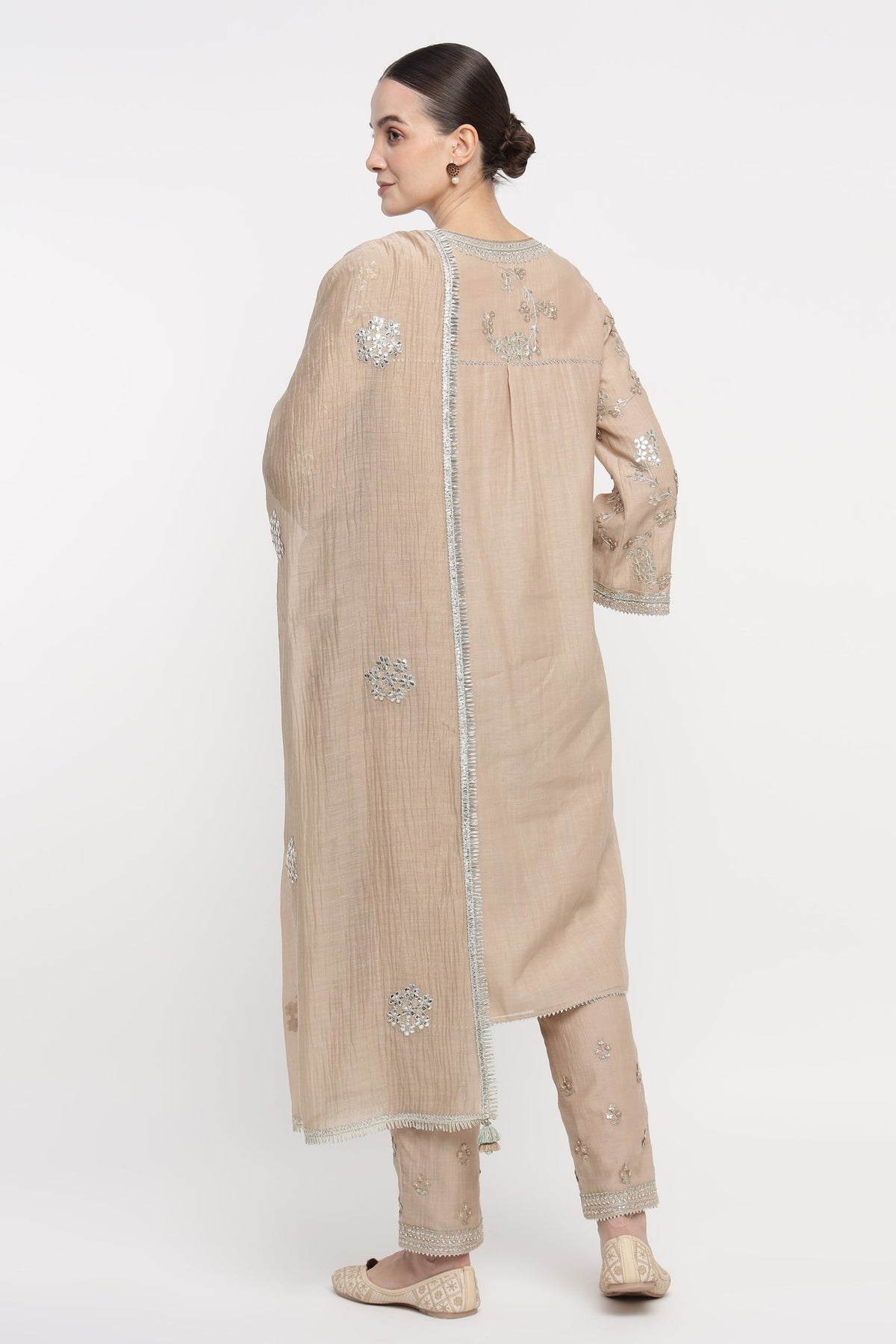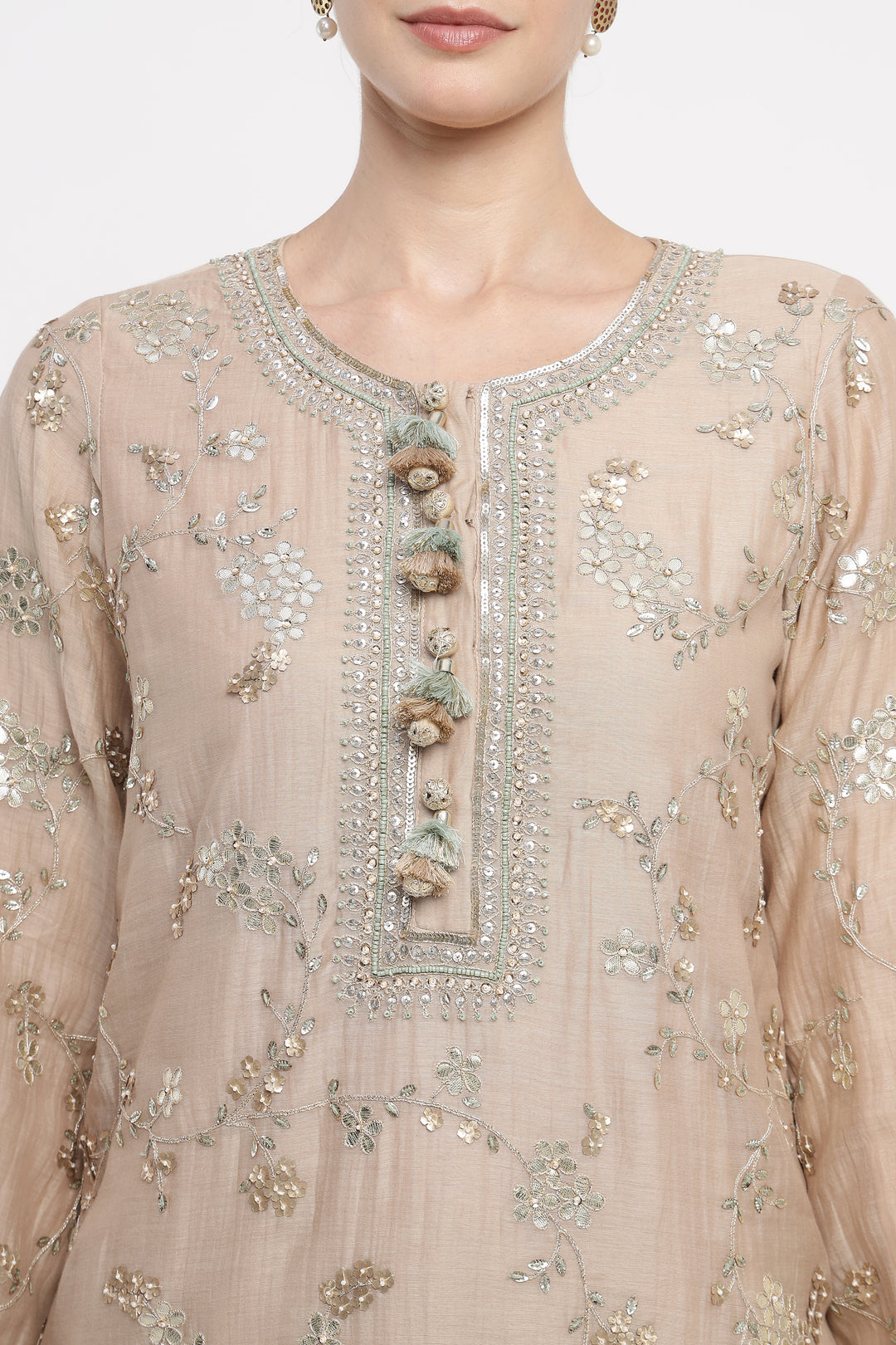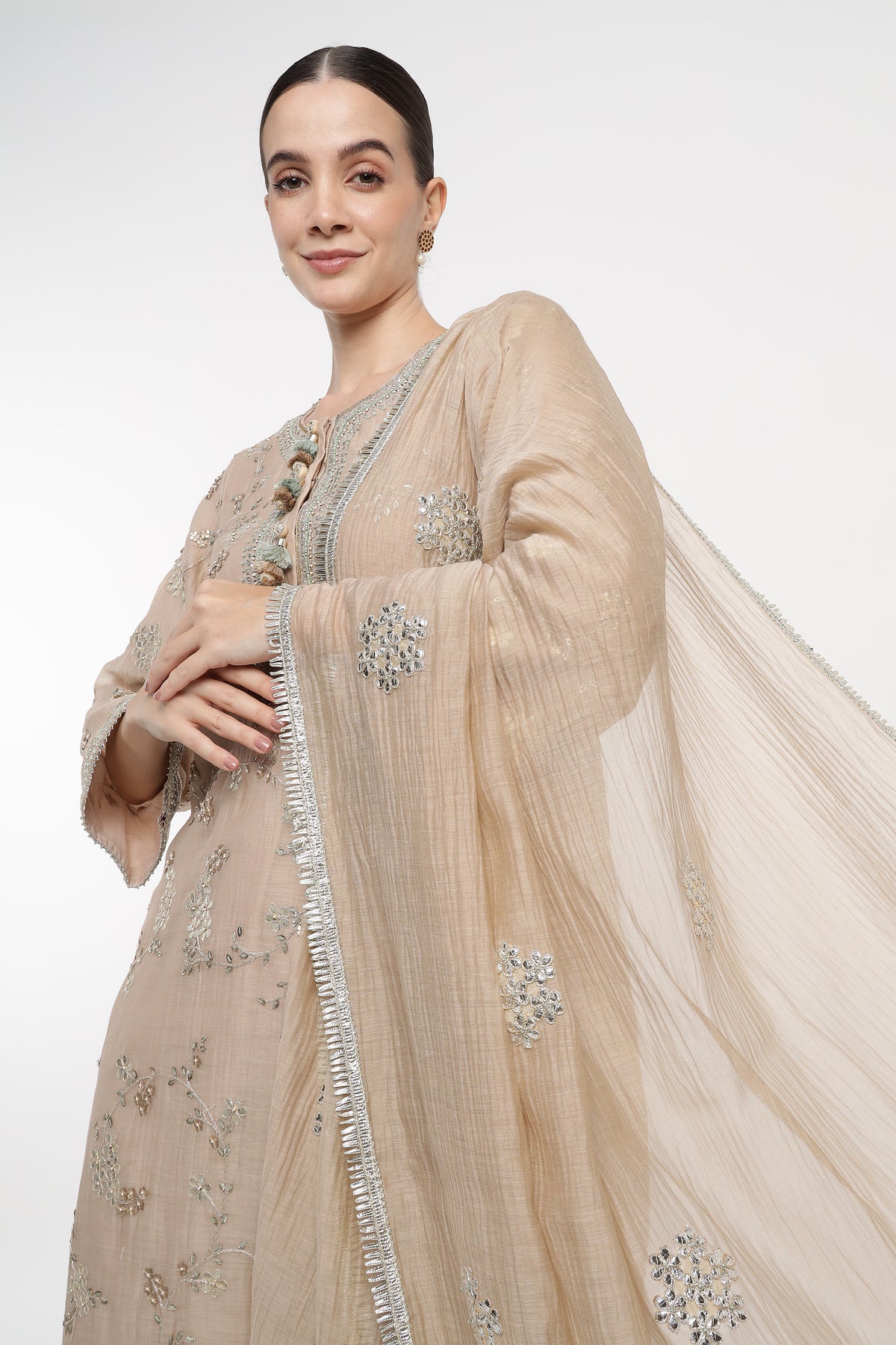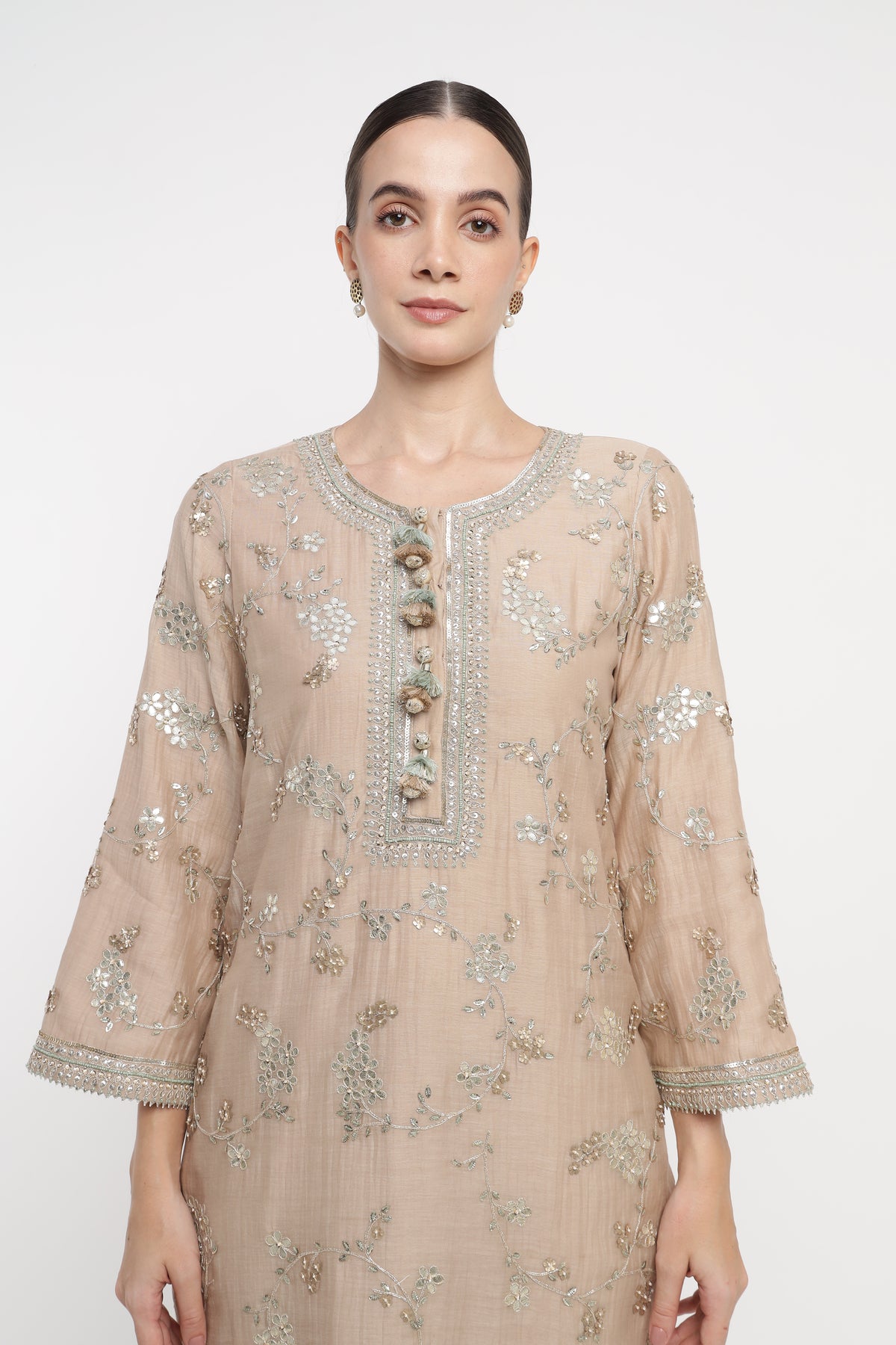 Woman wearing a beige traditional outfit with intricate designs on a white background