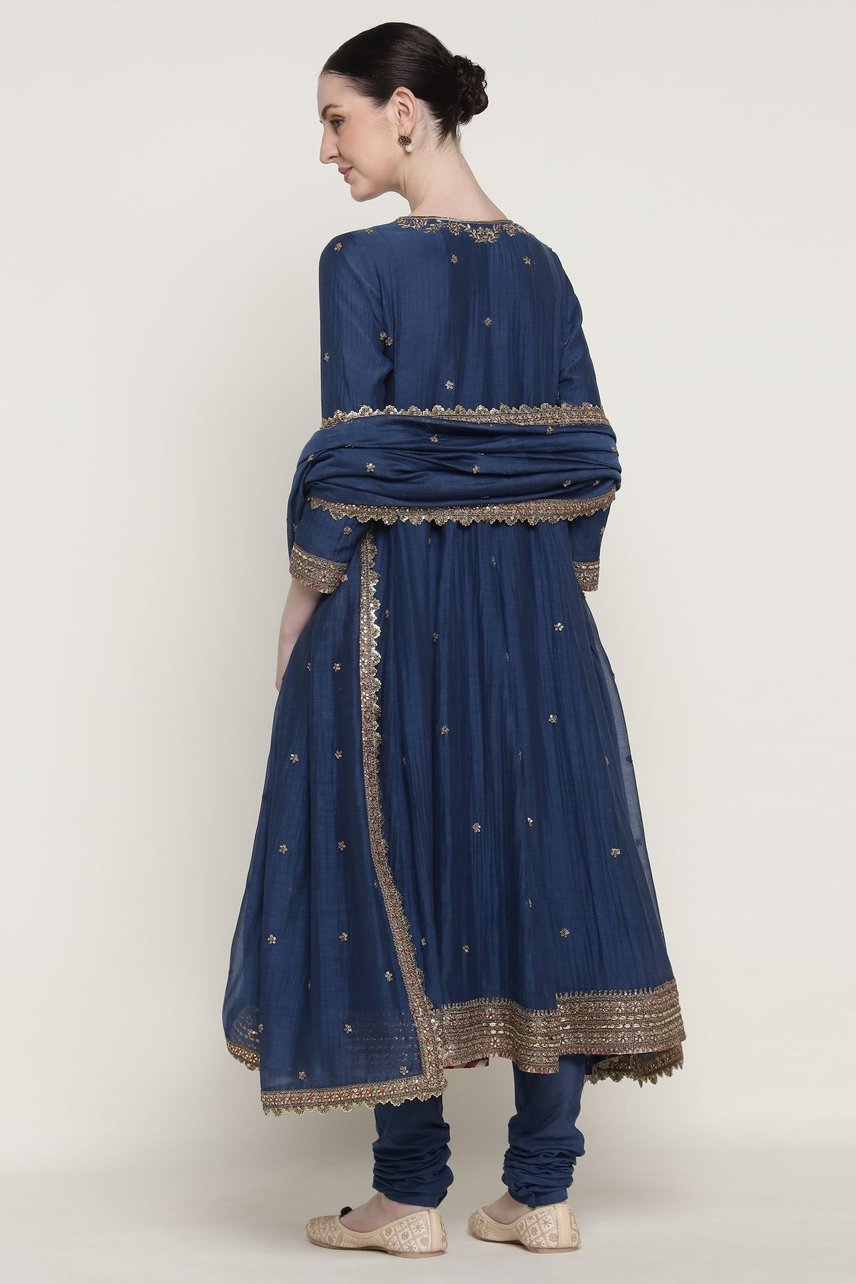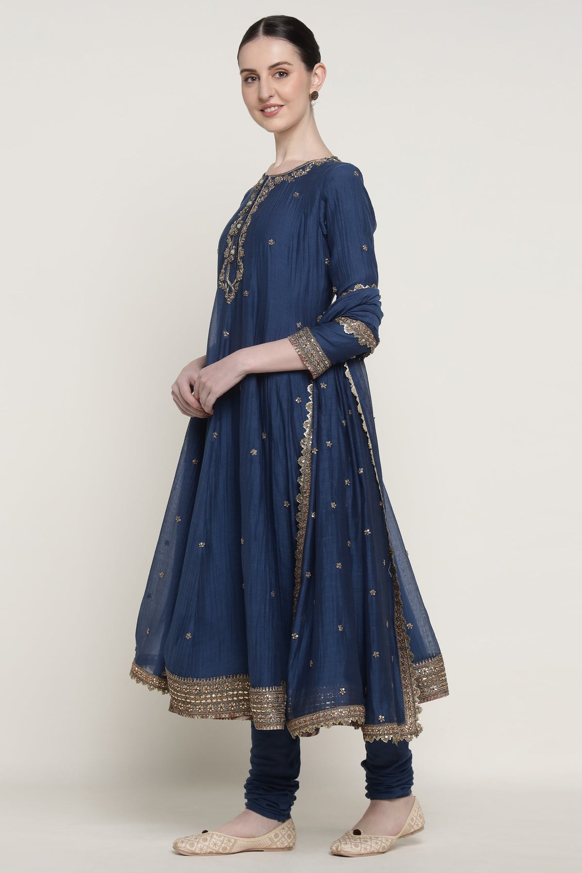 Woman wearing a blue traditional outfit with gold embroidery on a white background