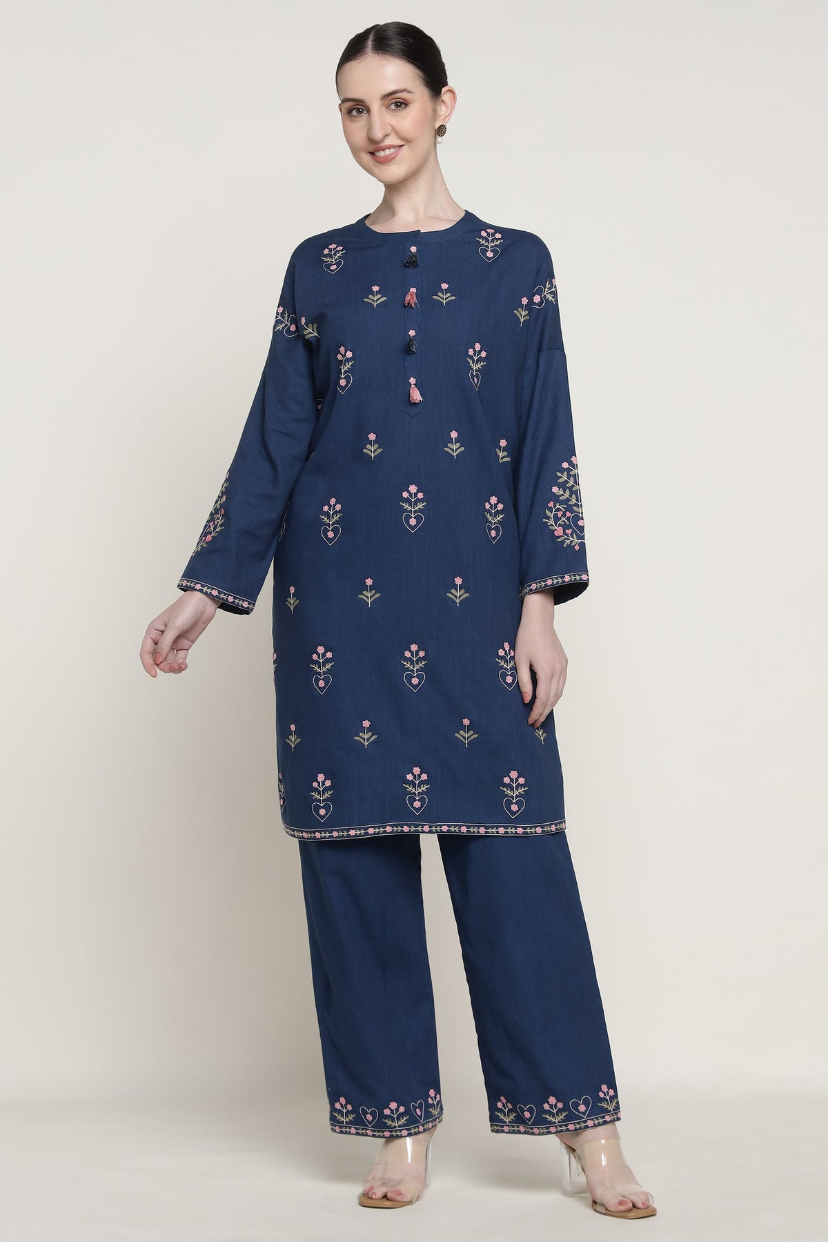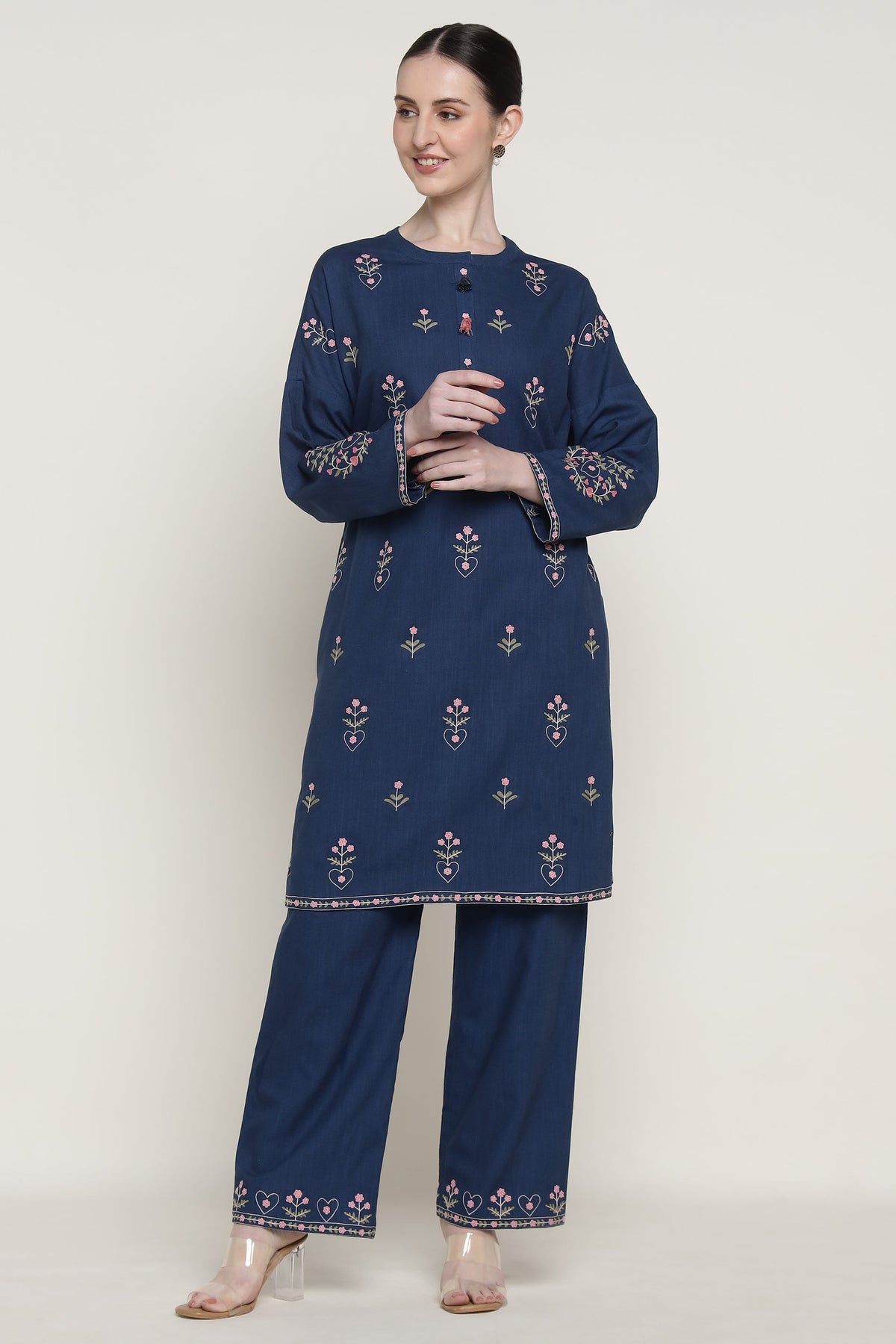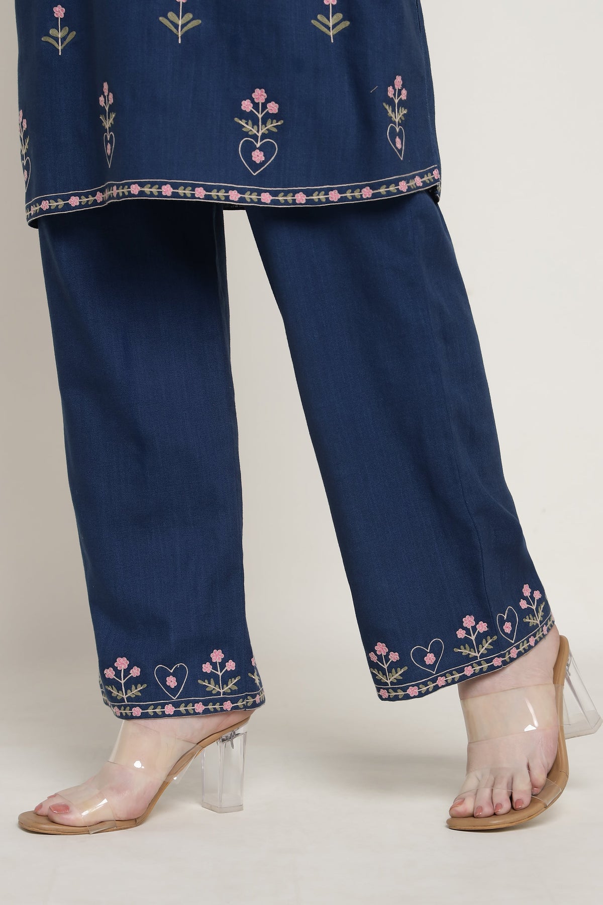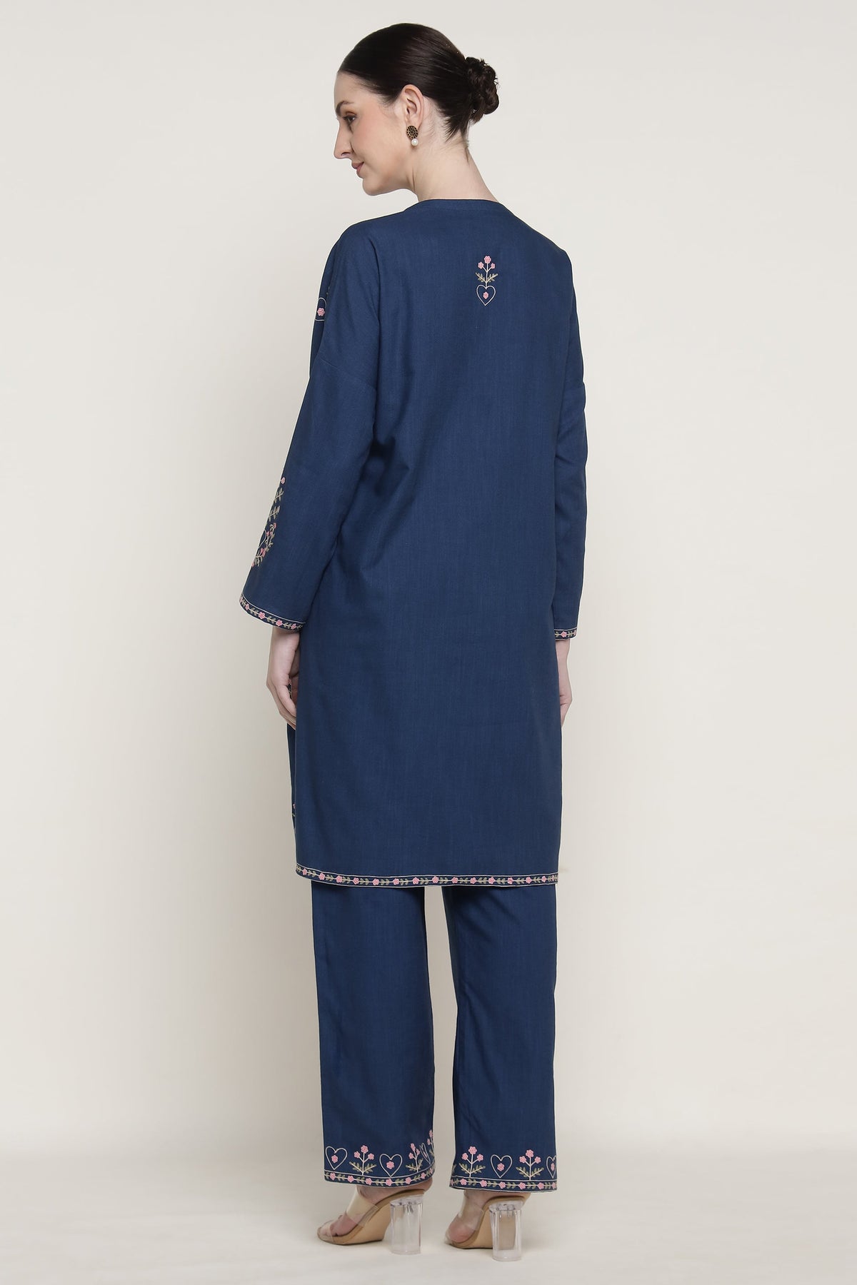 The Lia Coord Set in blue features delicate hand-embroidered floral motifs with thoughtful detailing across the kurta and trousers. Easy, elegant, and effortlessly wearable, it’s designed for daytime gatherings and festive moments, offering comfort with a refined, handcrafted finish.