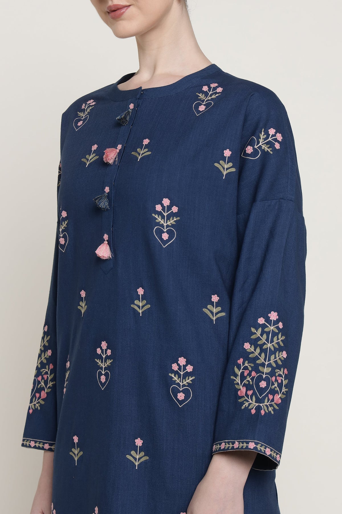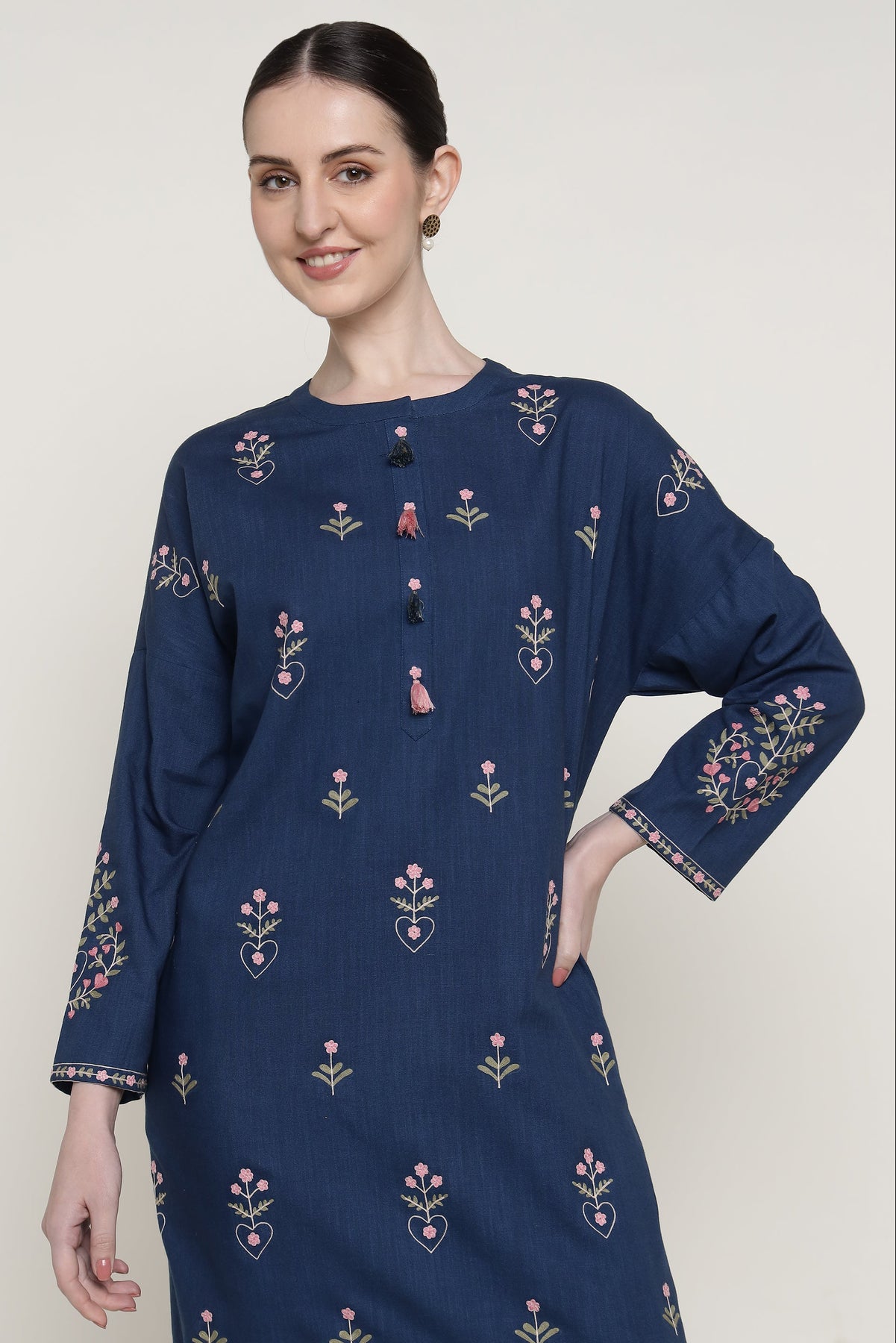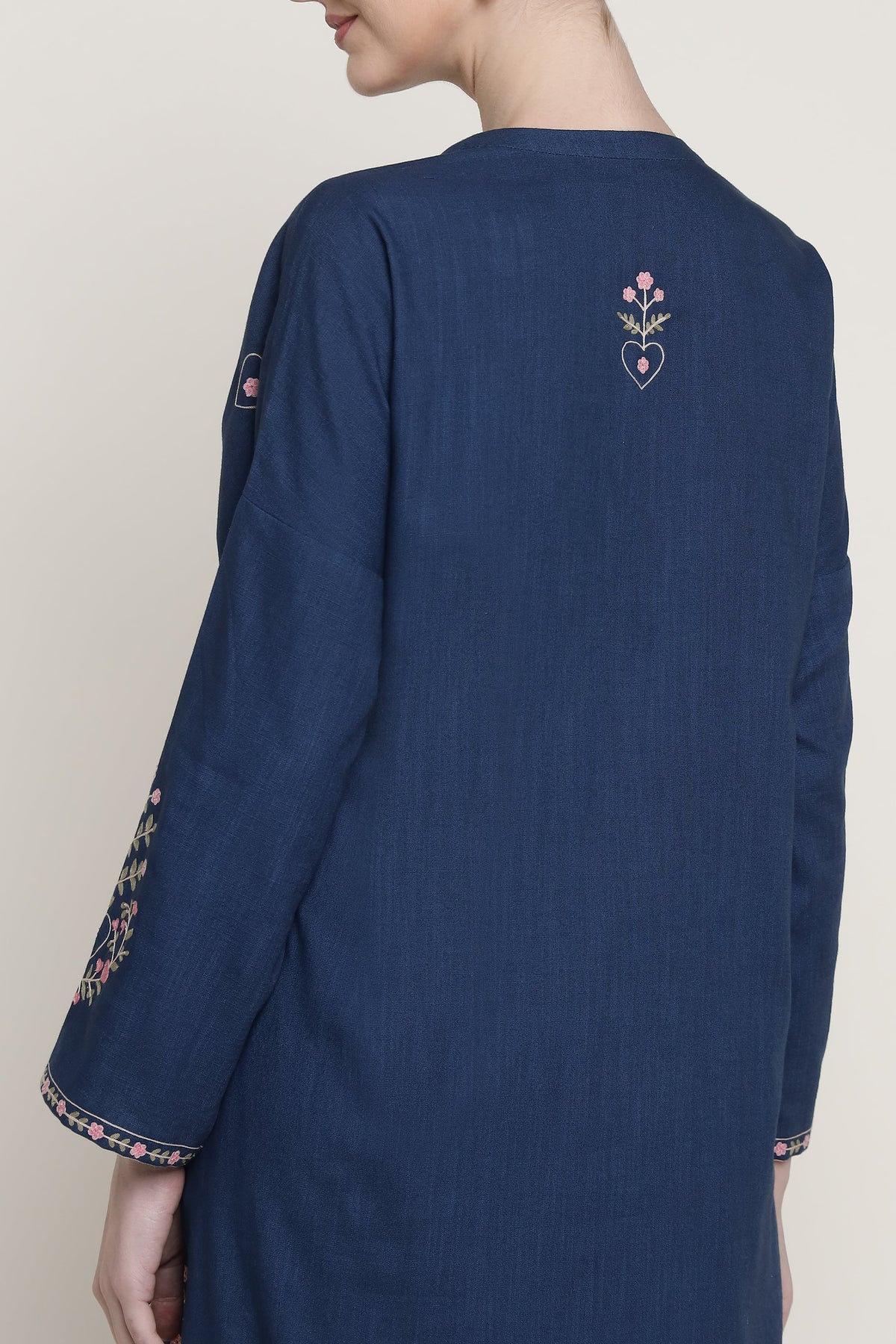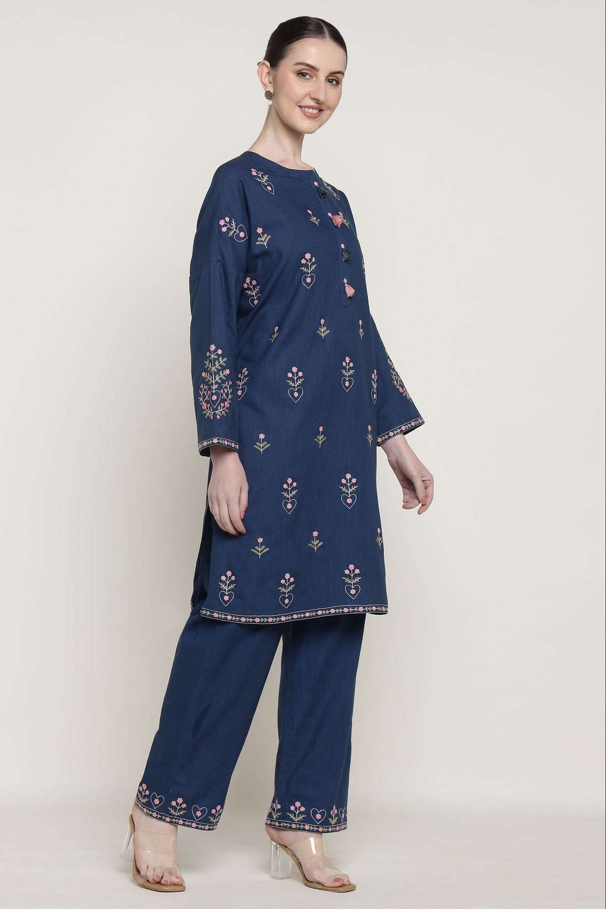 The Lia Coord Set in blue features delicate hand-embroidered floral motifs with thoughtful detailing across the kurta and trousers. Easy, elegant, and effortlessly wearable, it’s designed for daytime gatherings and festive moments, offering comfort with a refined, handcrafted finish.