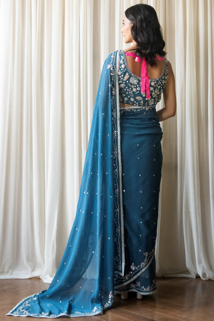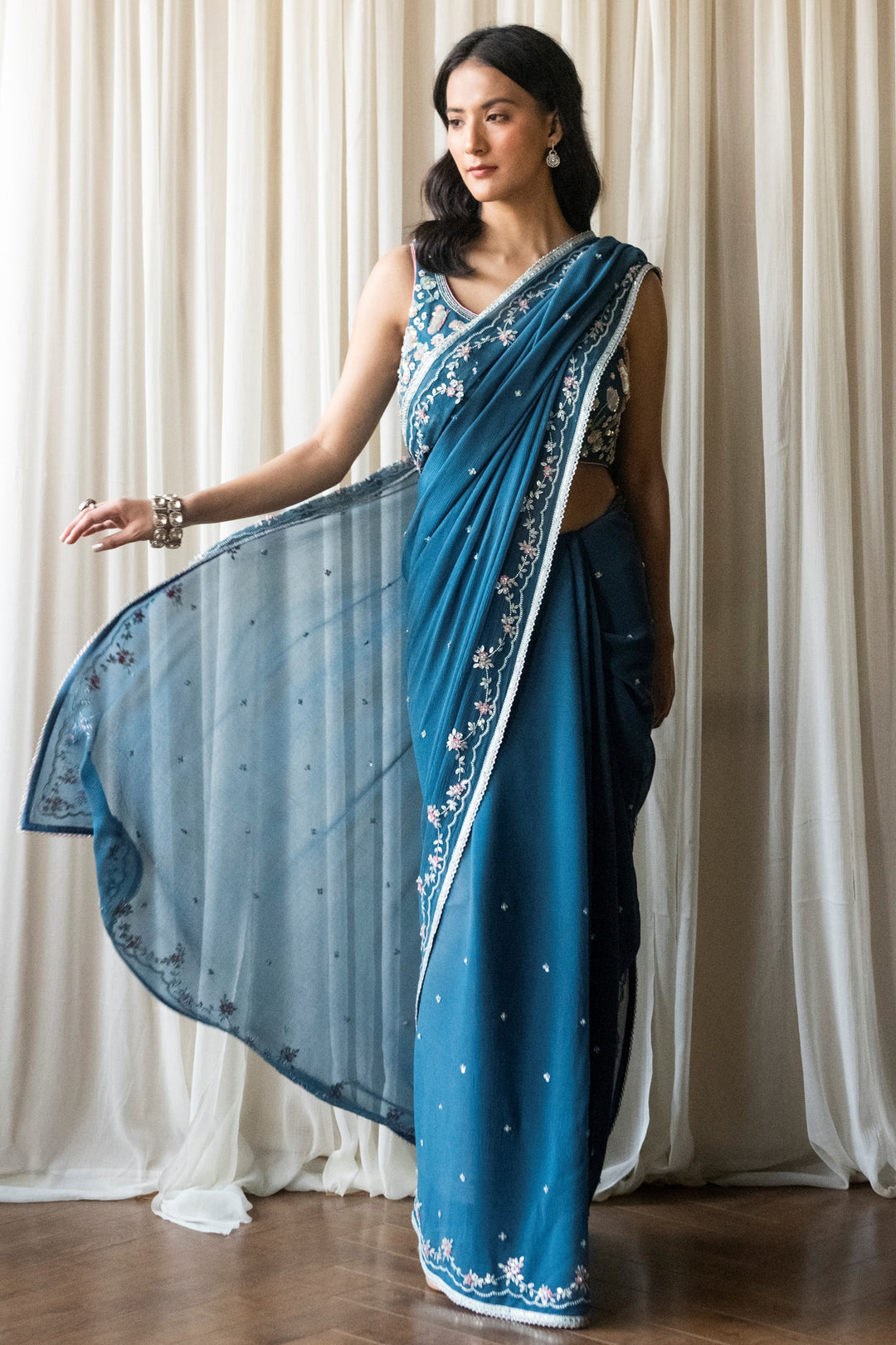 Indulge in the allure of this Blue Persian Garden Saree and let your style speak volumes at every event you attend.