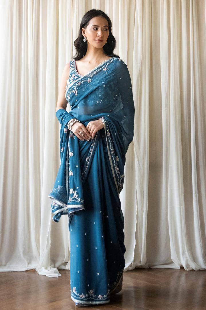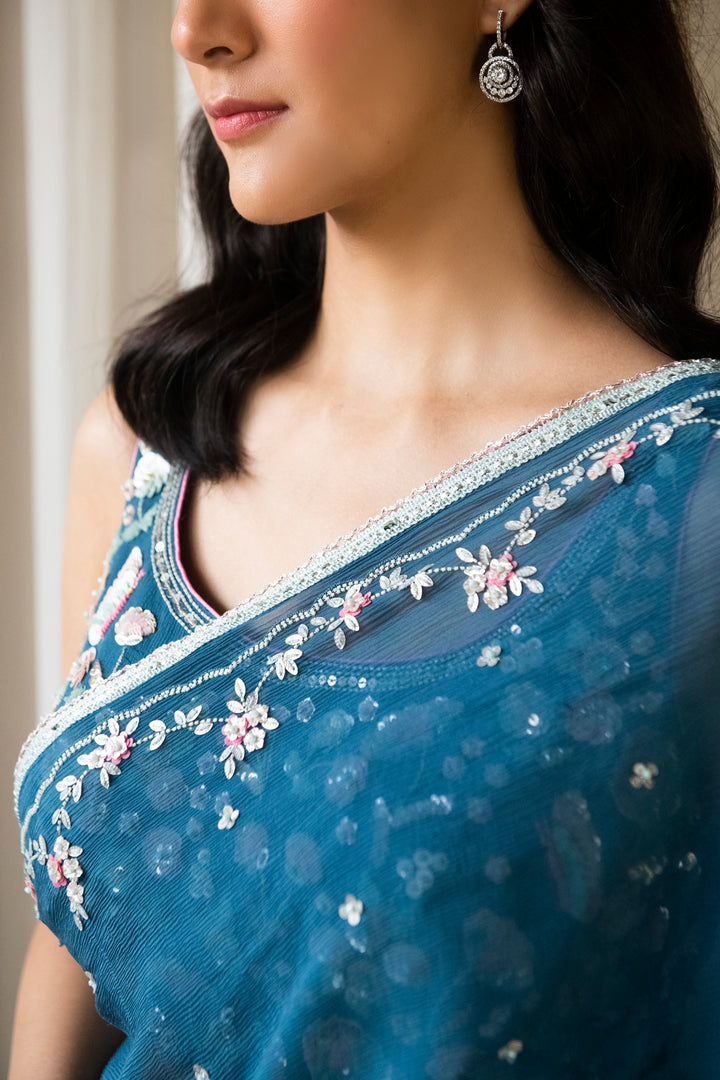 Elevate your elegance with our exquisite Blue Persian Garden Saree, a masterpiece crafted for the connoisseur of fashion. This saree is made from luxurious Chiffon fabric, renowned for its lightweight, airy texture, and graceful drape. The saree features intricate hand embroidery adorned with shimmering sequins, reminiscent of a starlit night, making it a perfect choice for special occasions and celebrations.