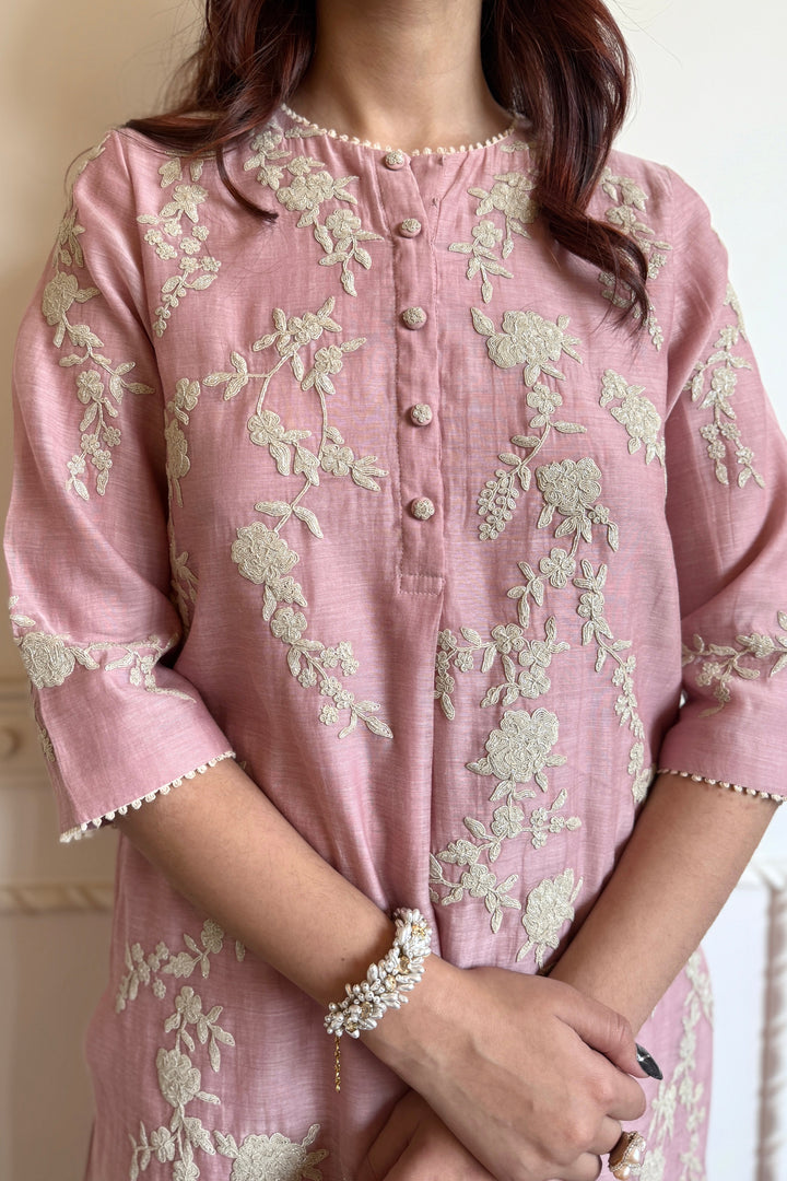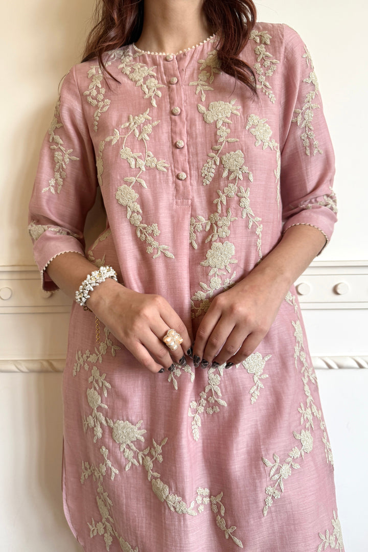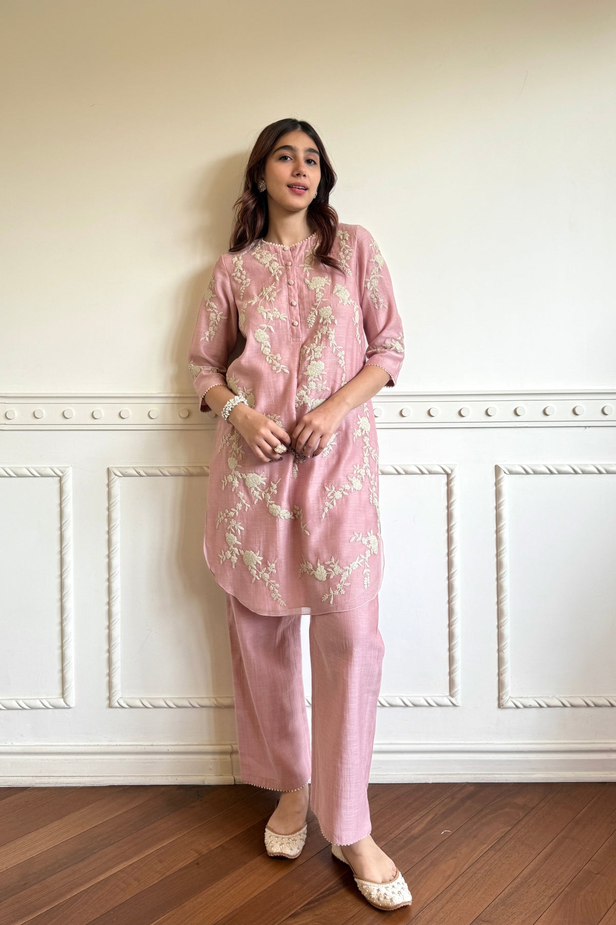 Woman wearing a pink kurta with white floral embroidery on a white background