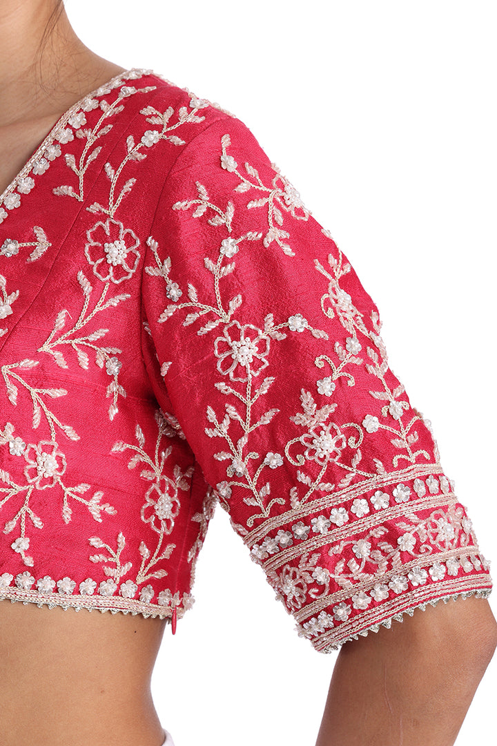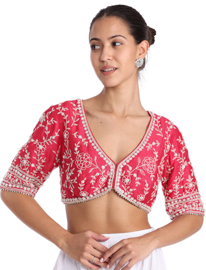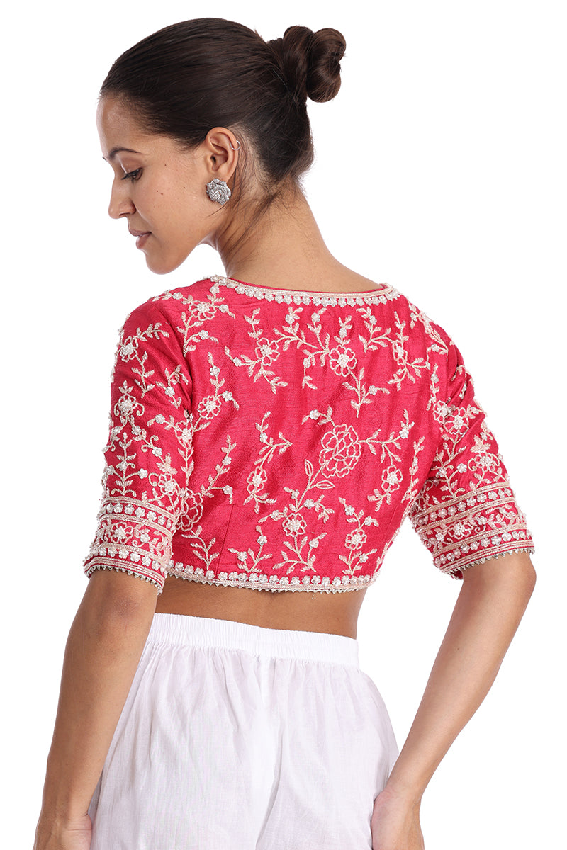 Add a touch of refined elegance to your ethnic wardrobe with our Cherry Dupion Blouse, beautifully crafted in rich raw silk fabric. The deep cherry hue exudes festive charm, while the hand-embroidered cutdana work adds a hint of sparkle and luxury.