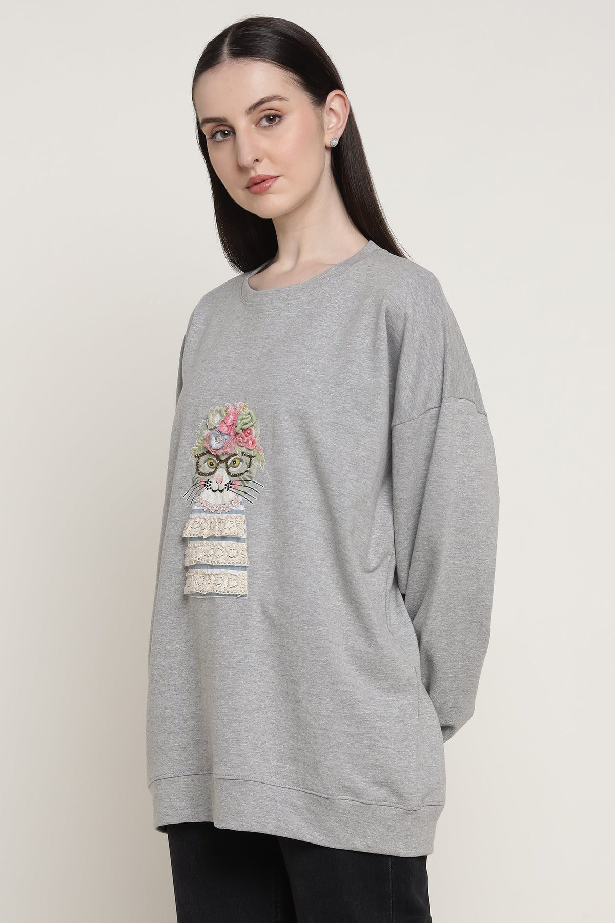 Relaxed sweatshirt featuring a charming cat appliqué with delicate detailing. Crafted in a soft, cozy fabric with an easy fit, it’s perfect for casual outings, lounging, or adding a playful touch to everyday winter wear.