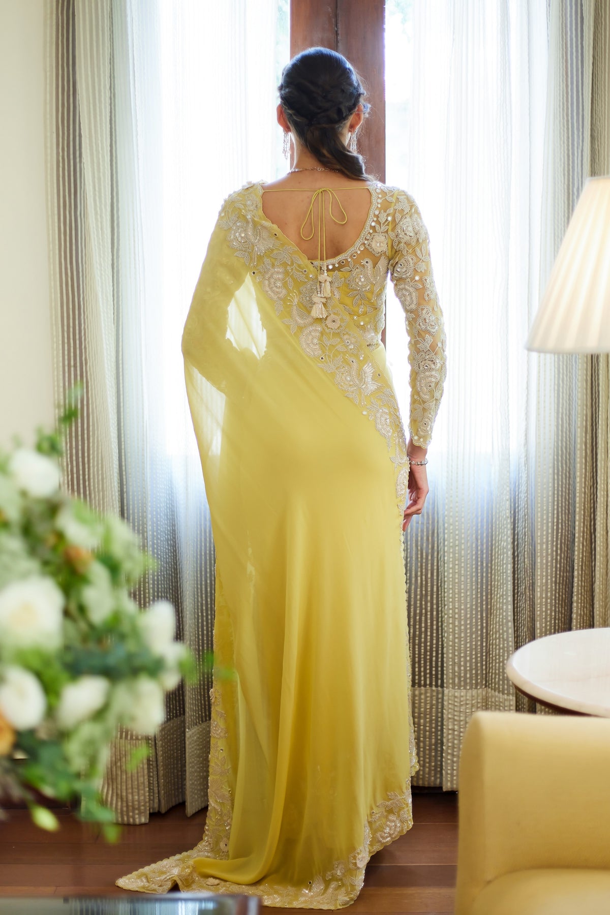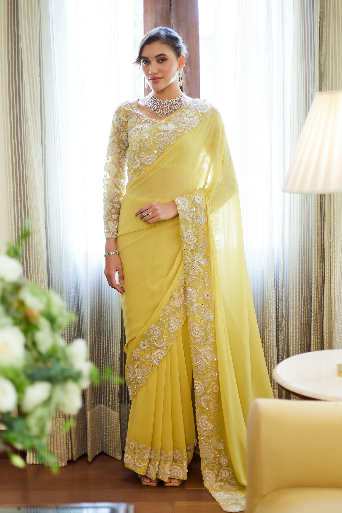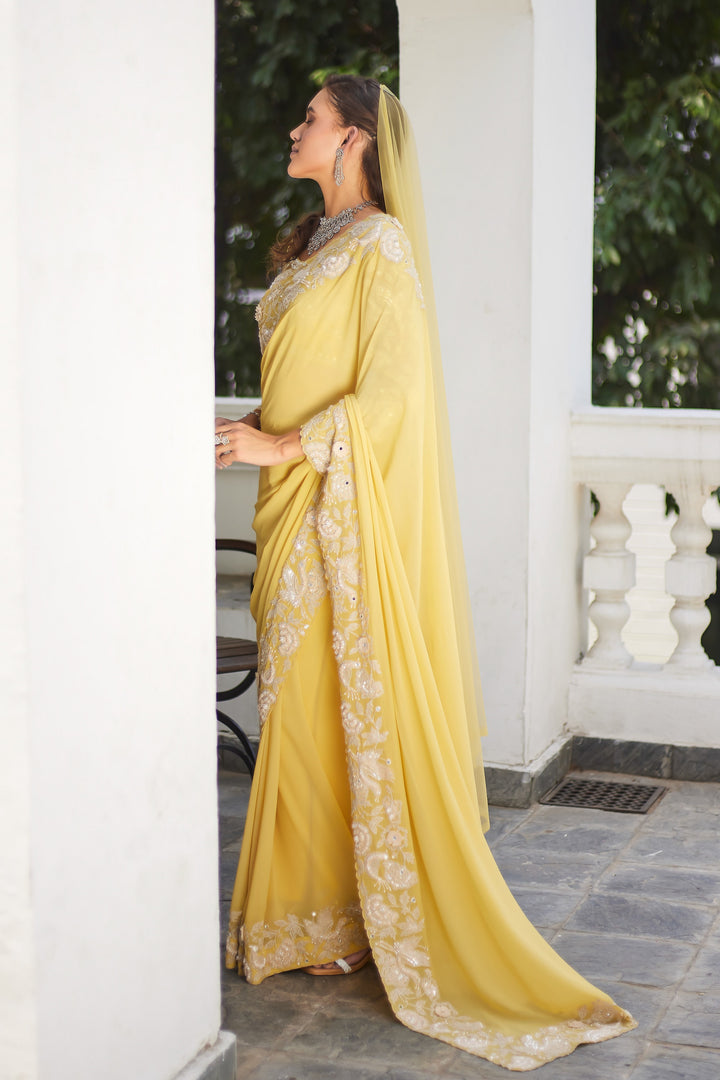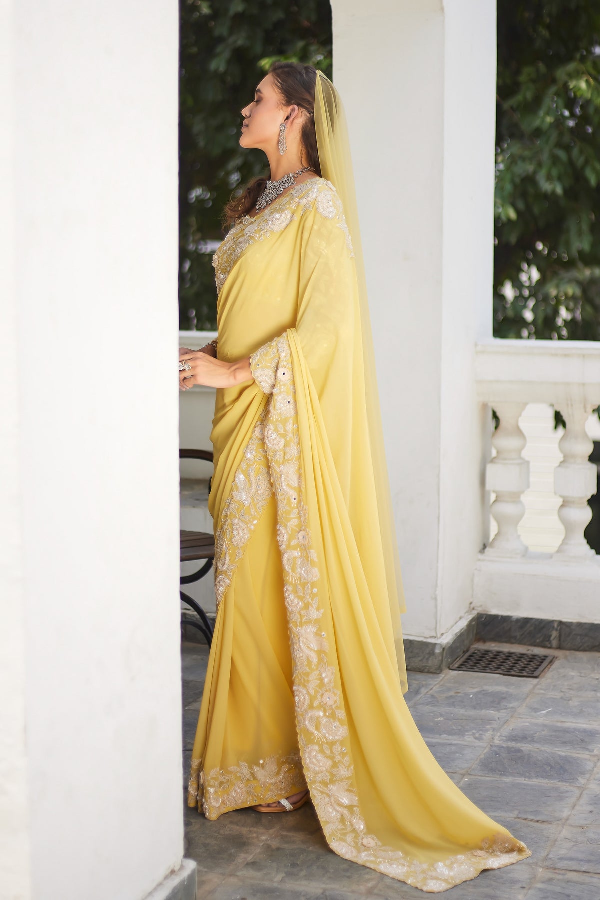 Introducing the Garden Crane Saree in luxurious georgette, adorned with beautifully embellished borders. This exquisite saree features delicate crane motifs that add a touch of elegance and grace.