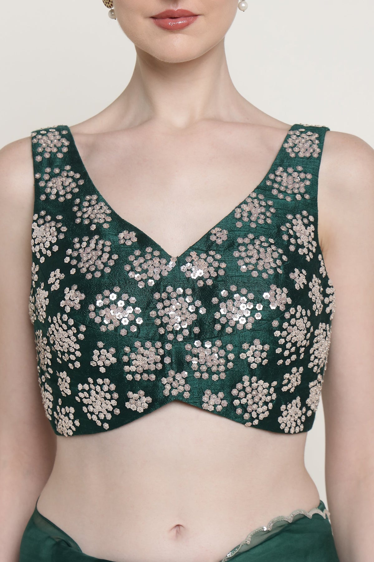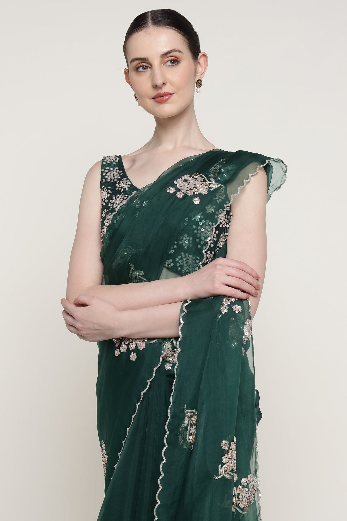 The Glowing Dandelion Saree is a fully hand-embroidered organza drape in a deep emerald hue, adorned with delicate floral motifs and scalloped detailing. Light, fluid, and luminous, it’s designed for wedding celebrations and evening occasions that call for refined elegance and quiet sparkle.