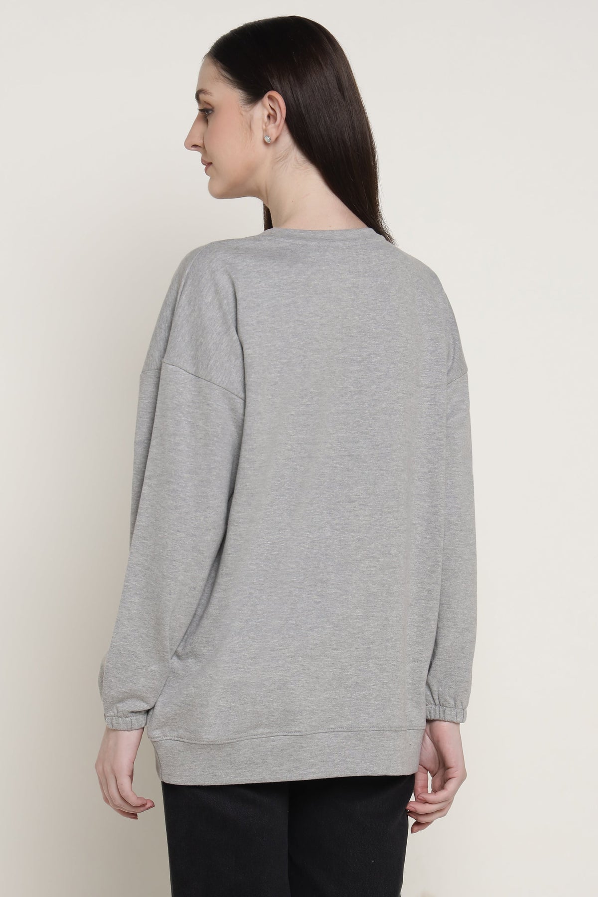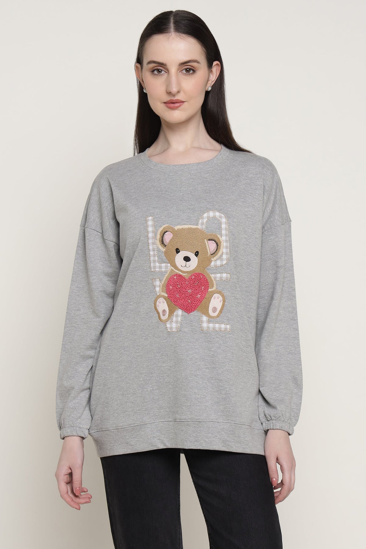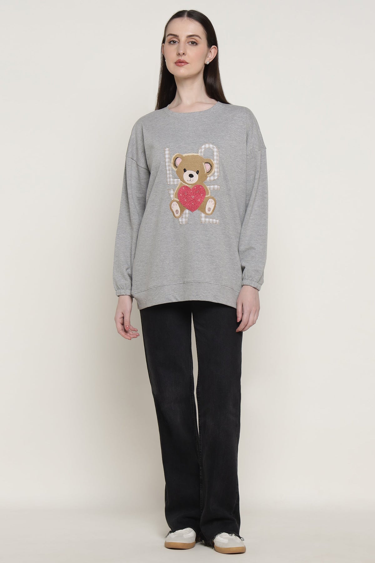 Cozy grey sweatshirt featuring a cute teddy appliqué with a heart detail. Designed in a relaxed fit with soft fabric, it’s perfect for casual days, lounging, or adding a playful touch to everyday winter wear.