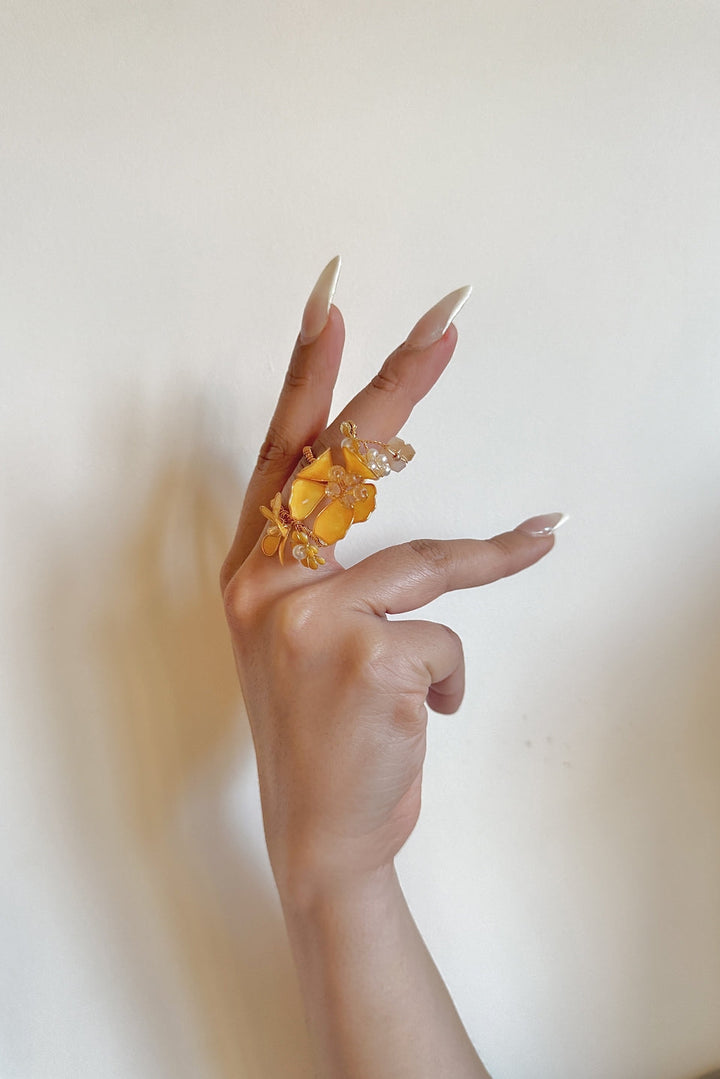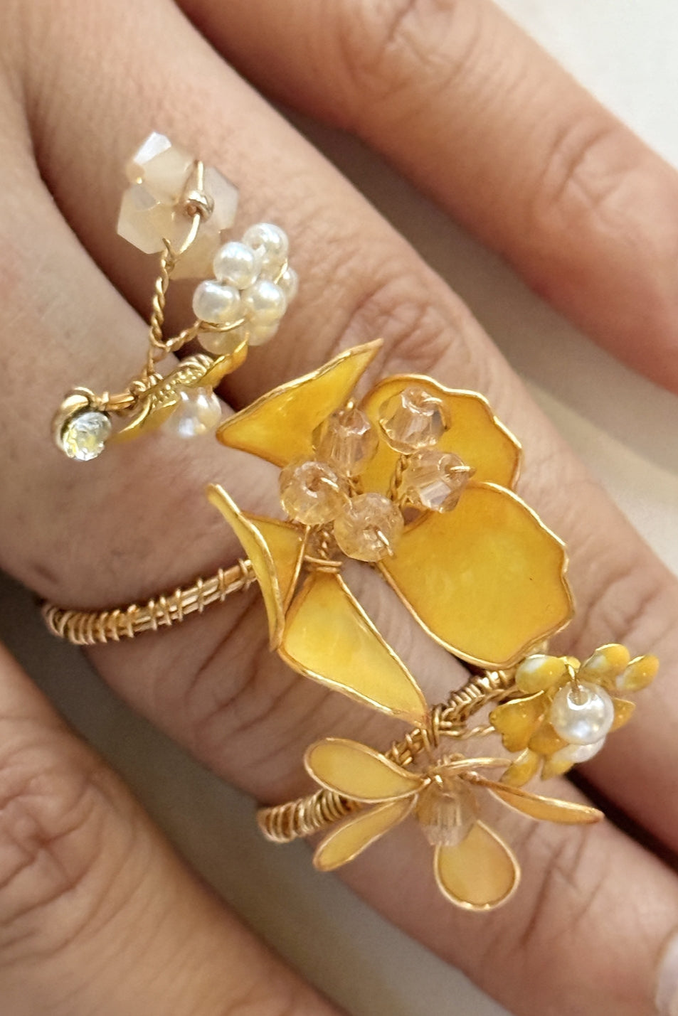 Embrace the enchanting allure of nature with this handcrafted ring, featuring intricately crafted yellow flowers in full bloom with hints of metallic shades, adding a touch of vibrance and charm to your outfit.