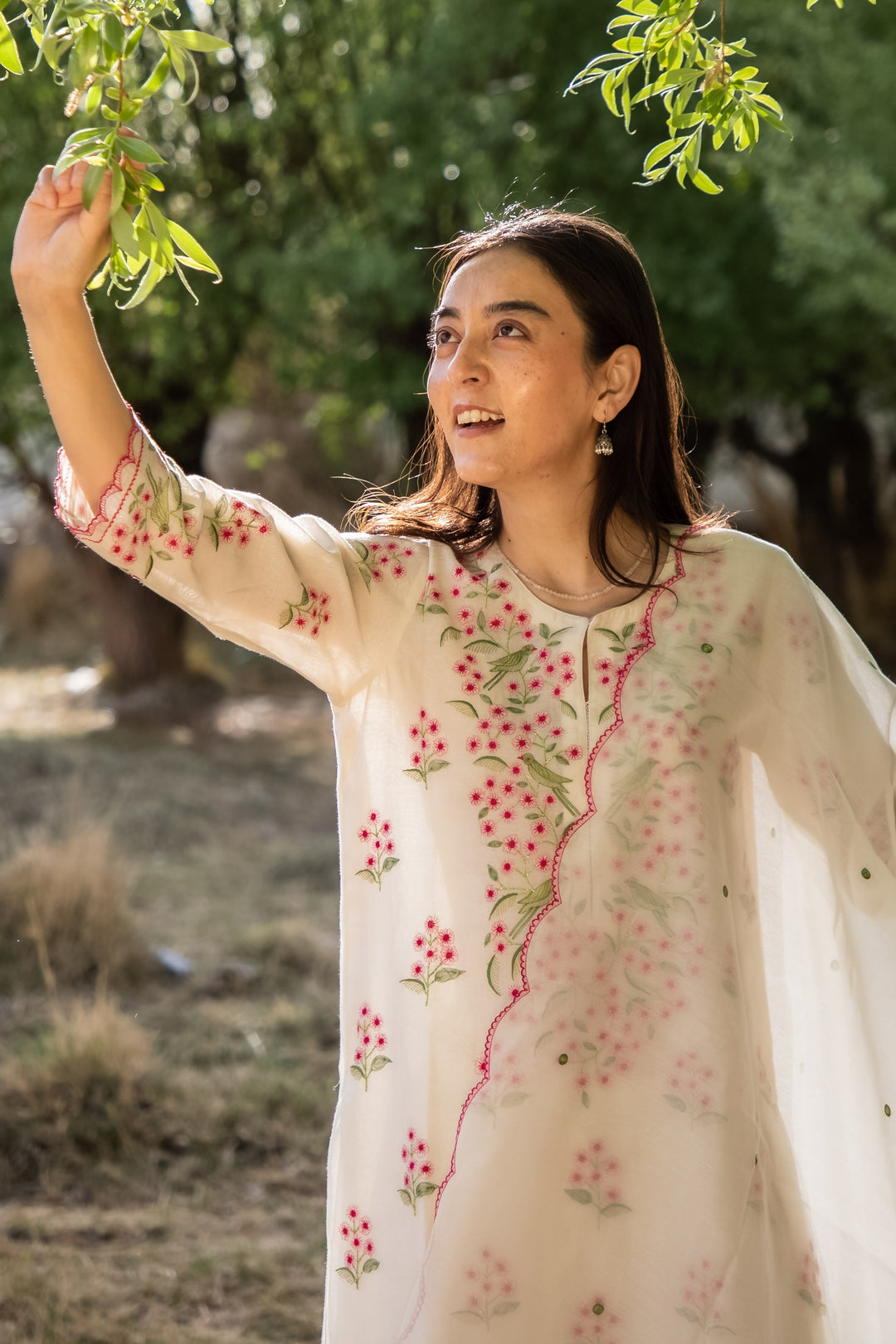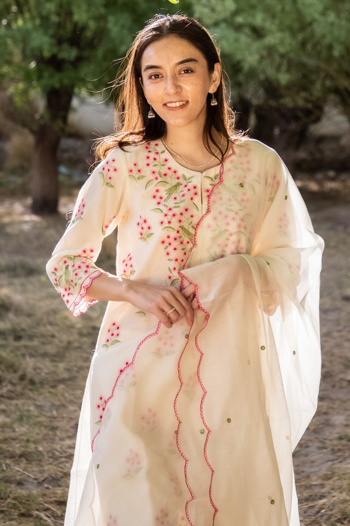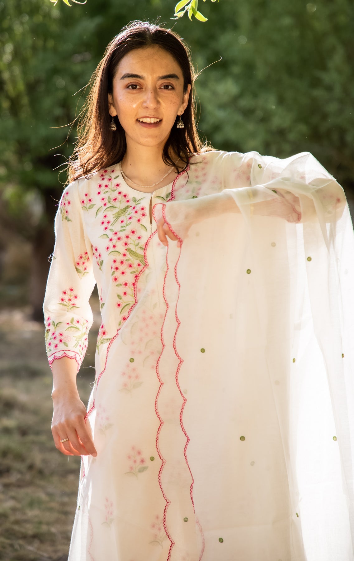 Woman wearing a floral dress with a sheer dupatta outdoors