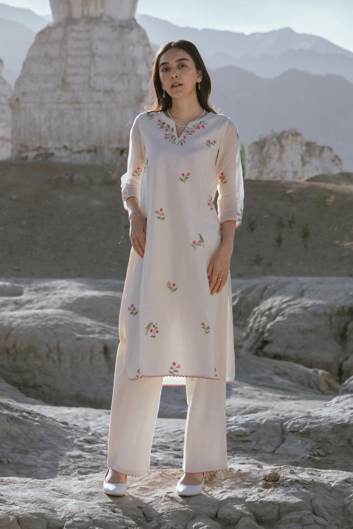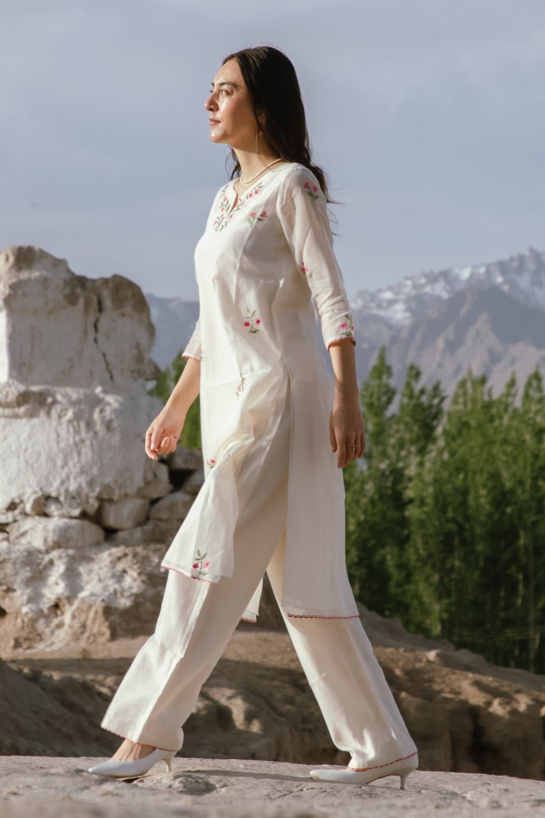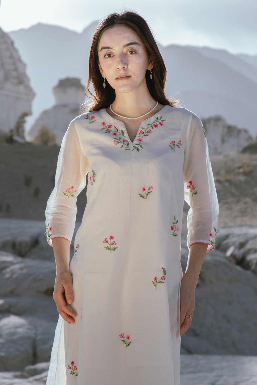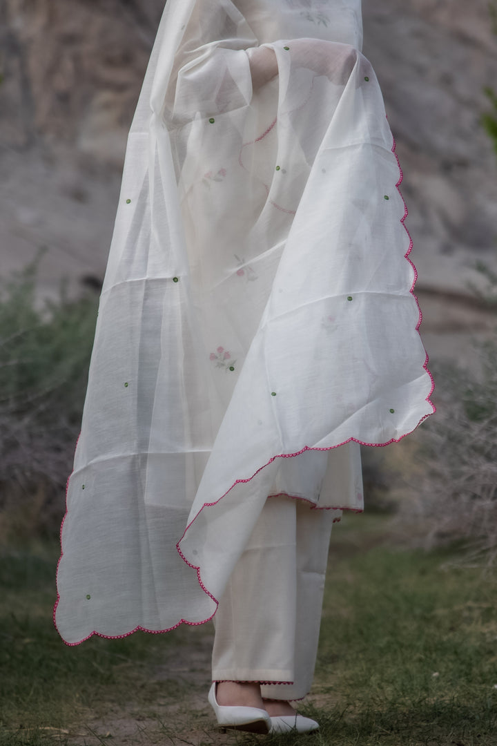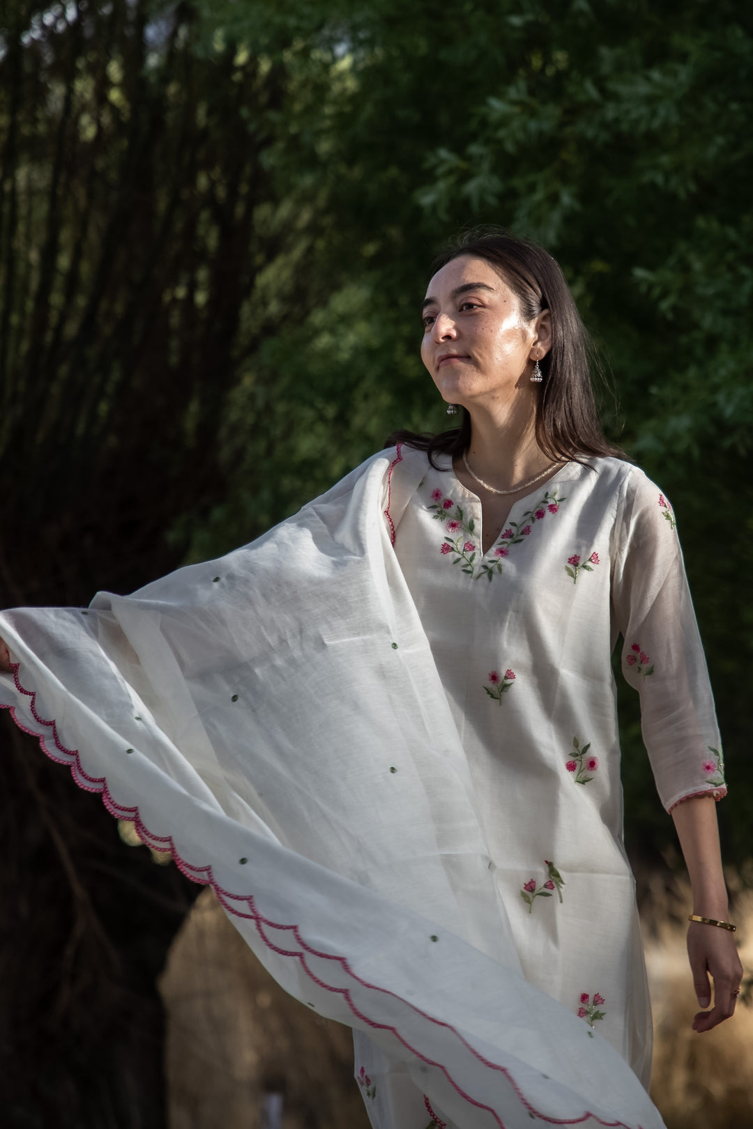 The kurta features embroidered details with vibrant floral and parrot motifs that bring colour and joy to even the simplest occasions. It drapes beautifully, offering both structure and movement, while the coordinating dupatta completes the look with subtle grace.