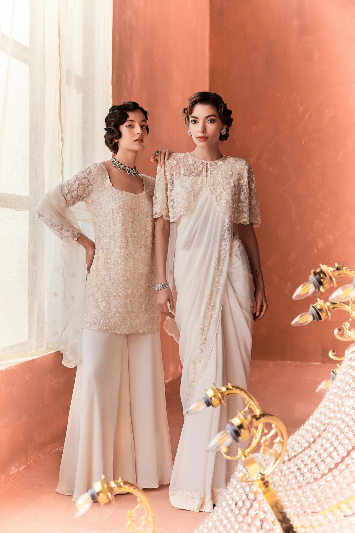Ivory Adena Poncho Chiffon Saree and Georgette Net Blouse and Ivory Folliage Kurta Set