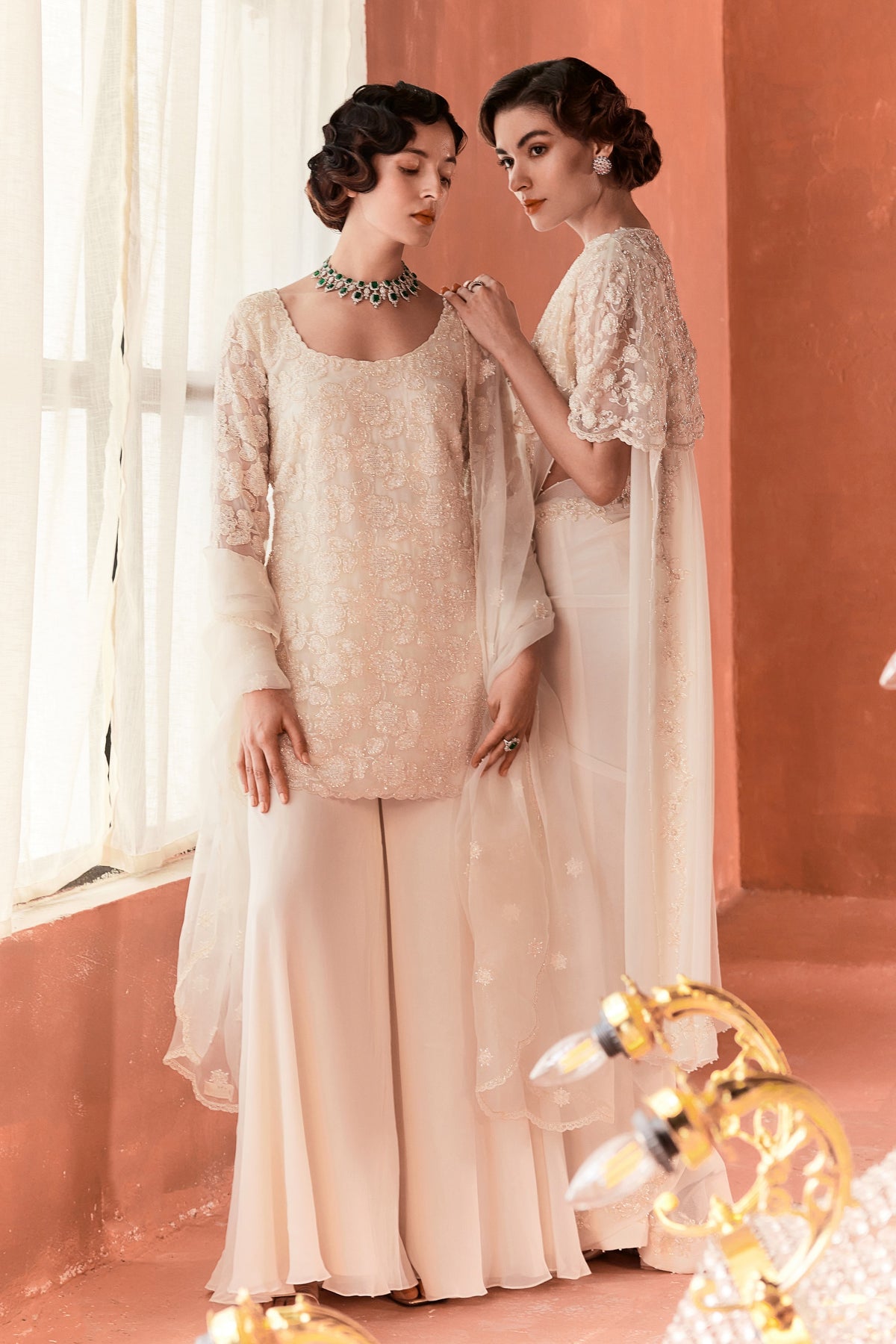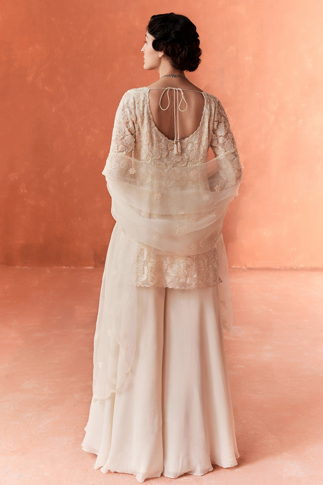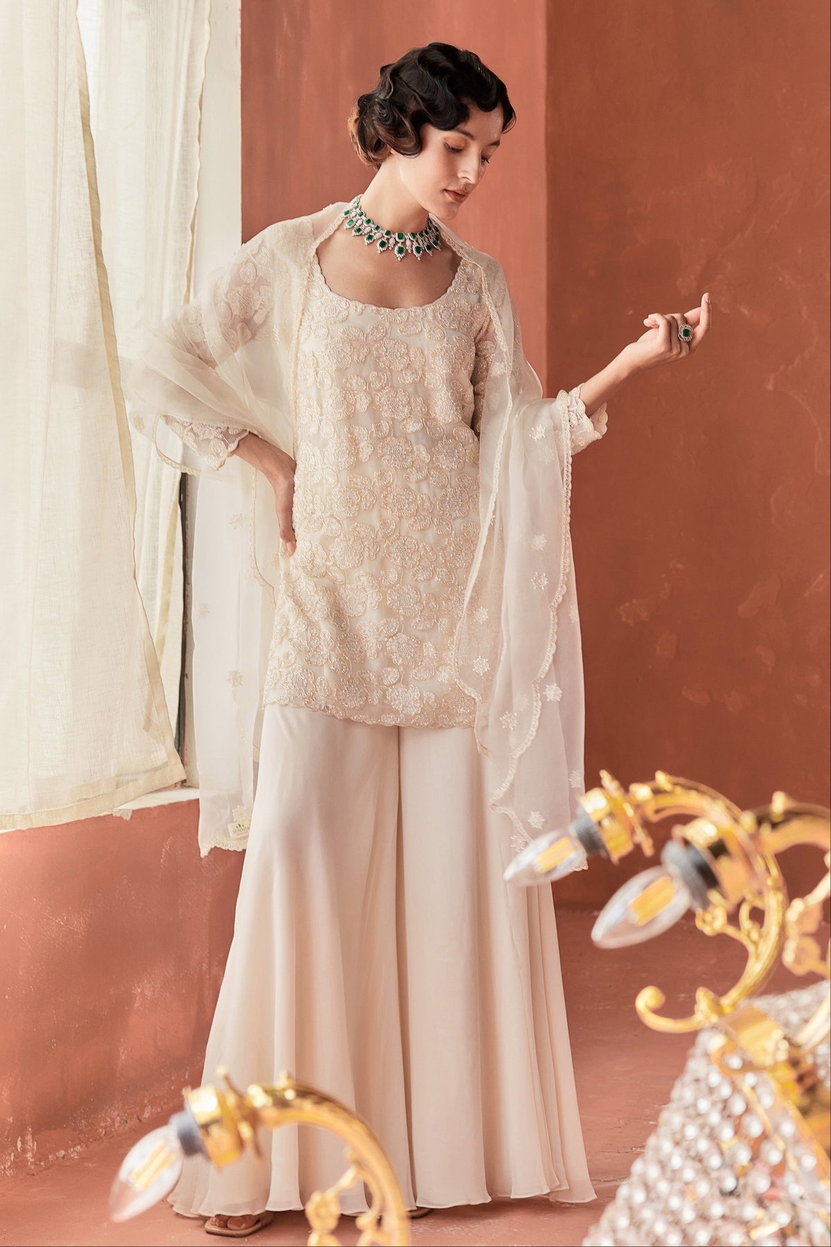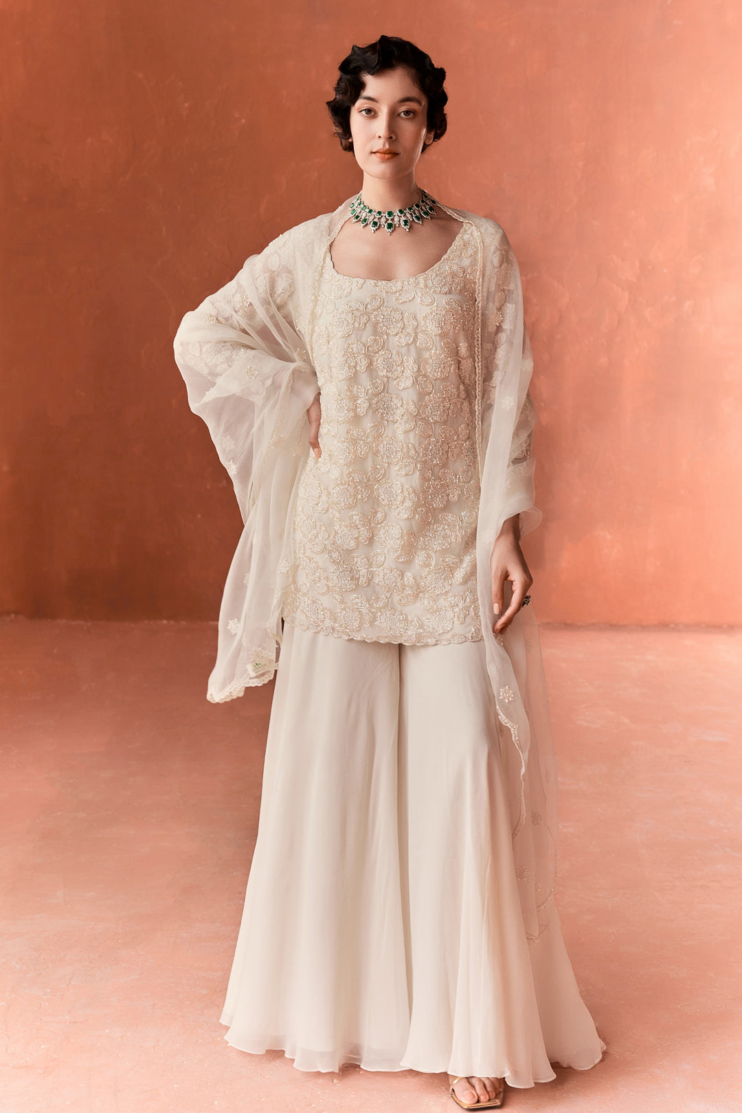 Ivory organza kurta set with intricate leaf embroidery and georgette sharara.