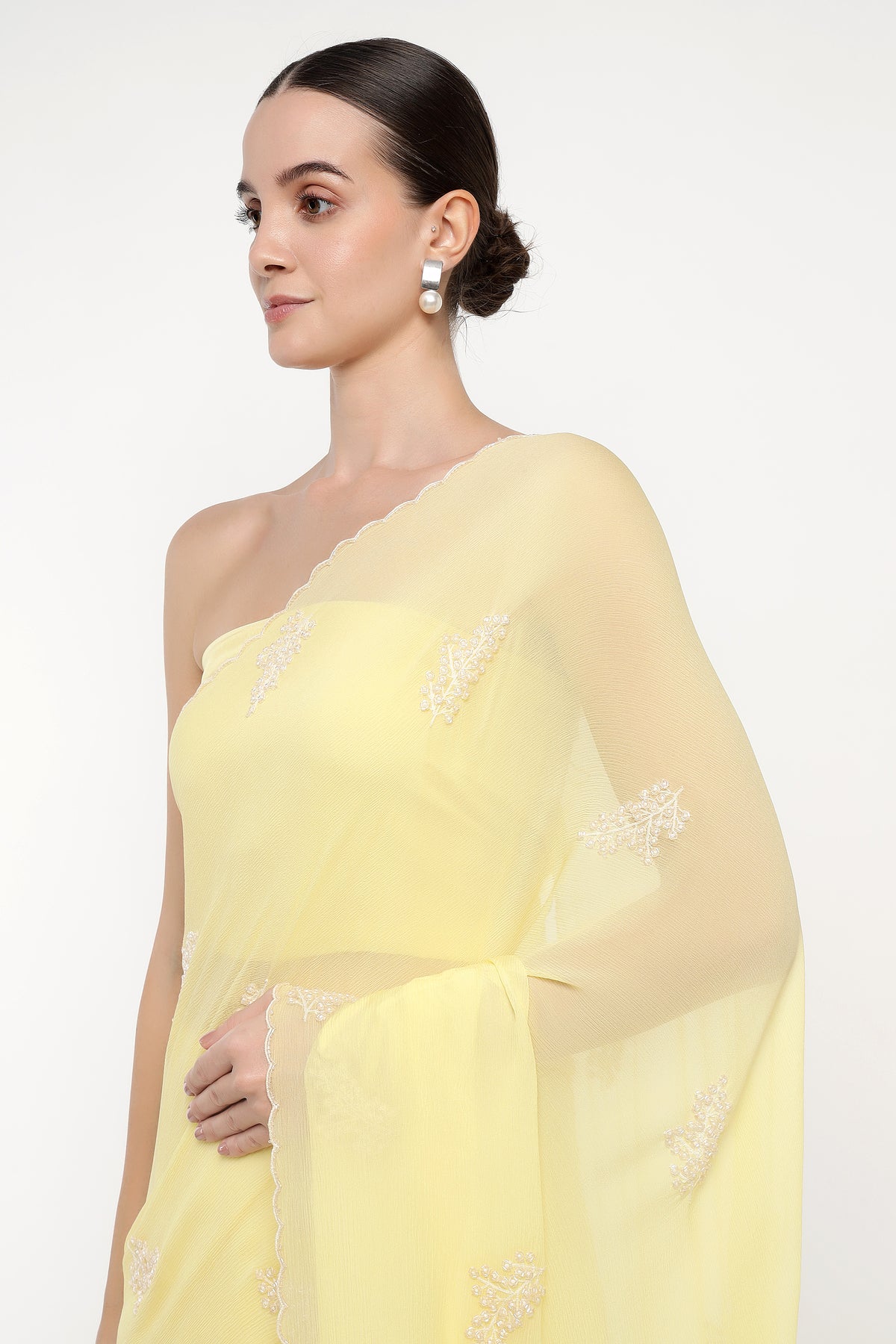 Drape yourself in the ethereal beauty of our Dandelion Yellow Chiffon Saree. This hand-embroidered saree features exquisite cutdana work, offering a touch of refined sparkle. Its soft pastel hue makes it perfect for Diwali celebrations, engagement ceremonies, elegant wedding functions, or cherished anniversary moments. A truly exquisite chiffon saree designed to make your special occasions unforgettable.